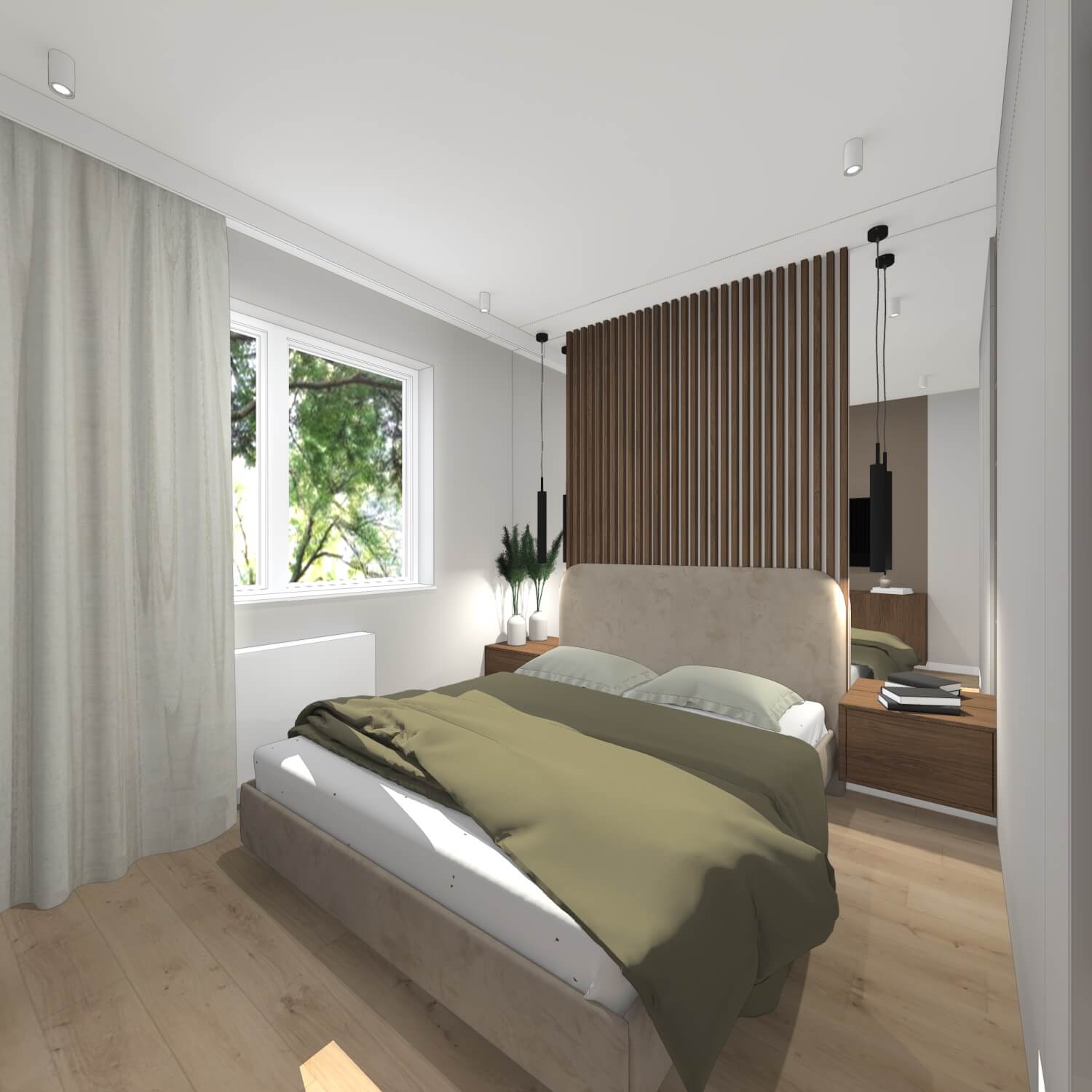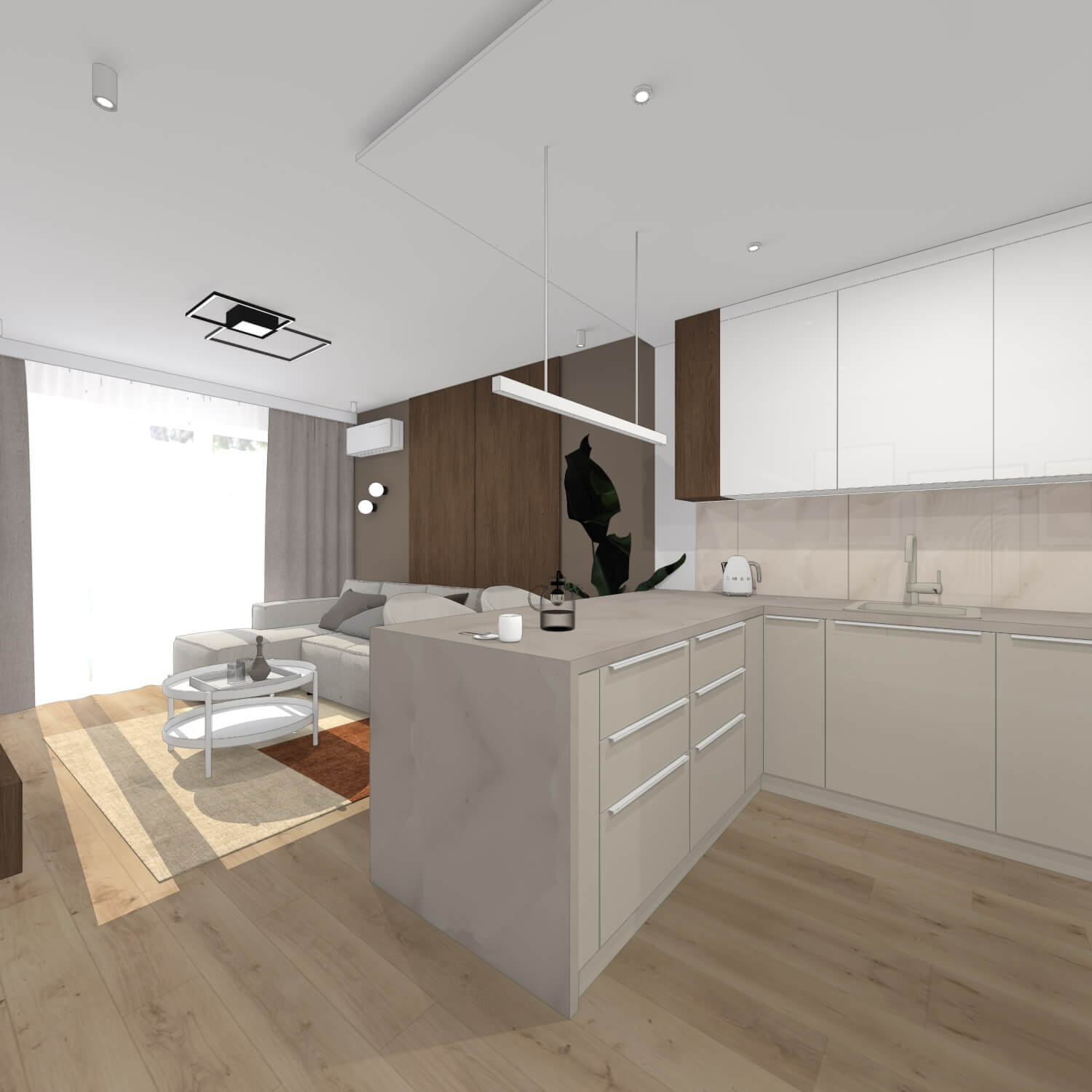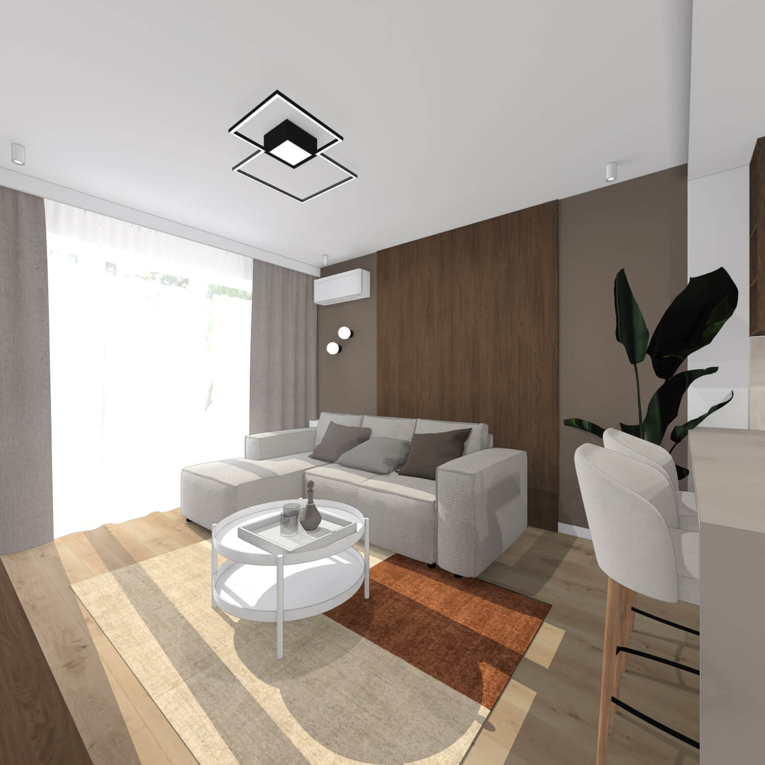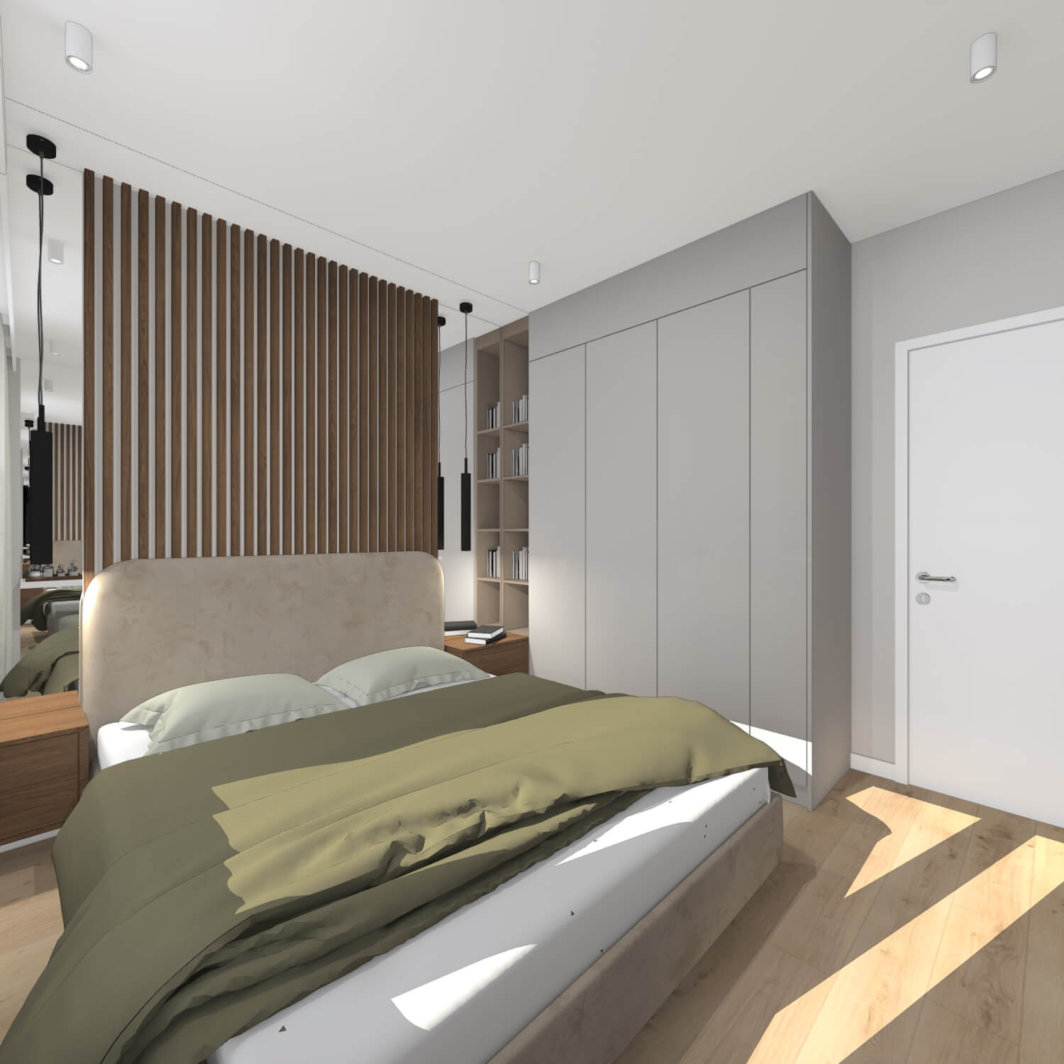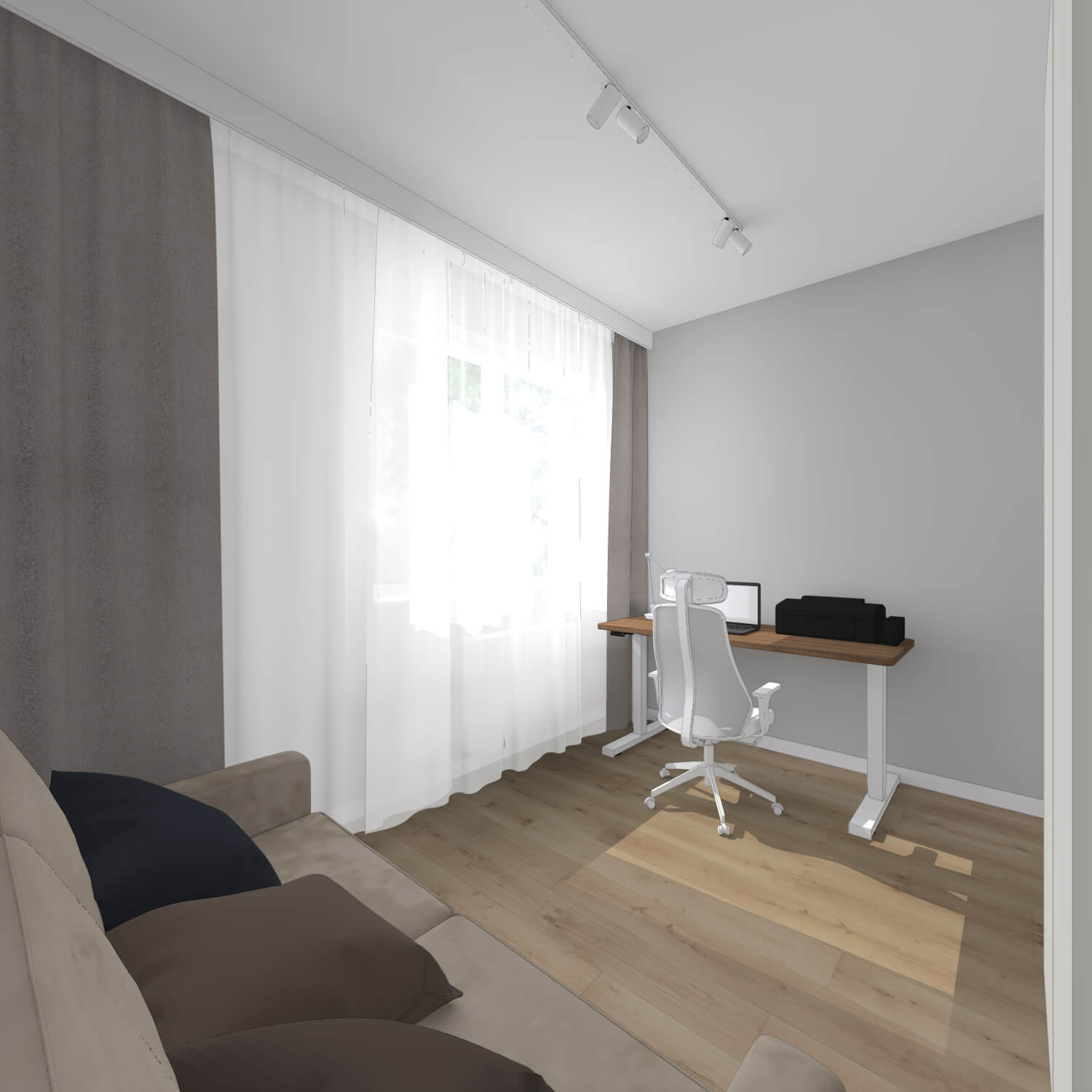 Głównym założeniem było stworzenie spójnej i harmonijnej przestrzeni, sprzyjającej zarówno relaksowi, jak i efektywnej pracy. Wnętrza utrzymano w ciepłej, stonowanej palecie barw, łączącej odcienie beżu, szarości i naturalnego drewna. Kluczowym elementem scalającym projekt są drewniane lamele, które konsekwentnie pojawiają się w sypialni, przedpokoju oraz łazience, nadając całości elegancki i uporządkowany wygląd. Projekt charakteryzuje się funkcjonalnym minimalizmem, gdzie każdy detal ma swoje miejsce, tworząc przestrzeń idealną do życia.
