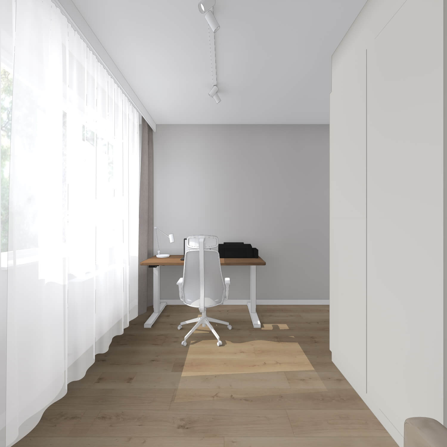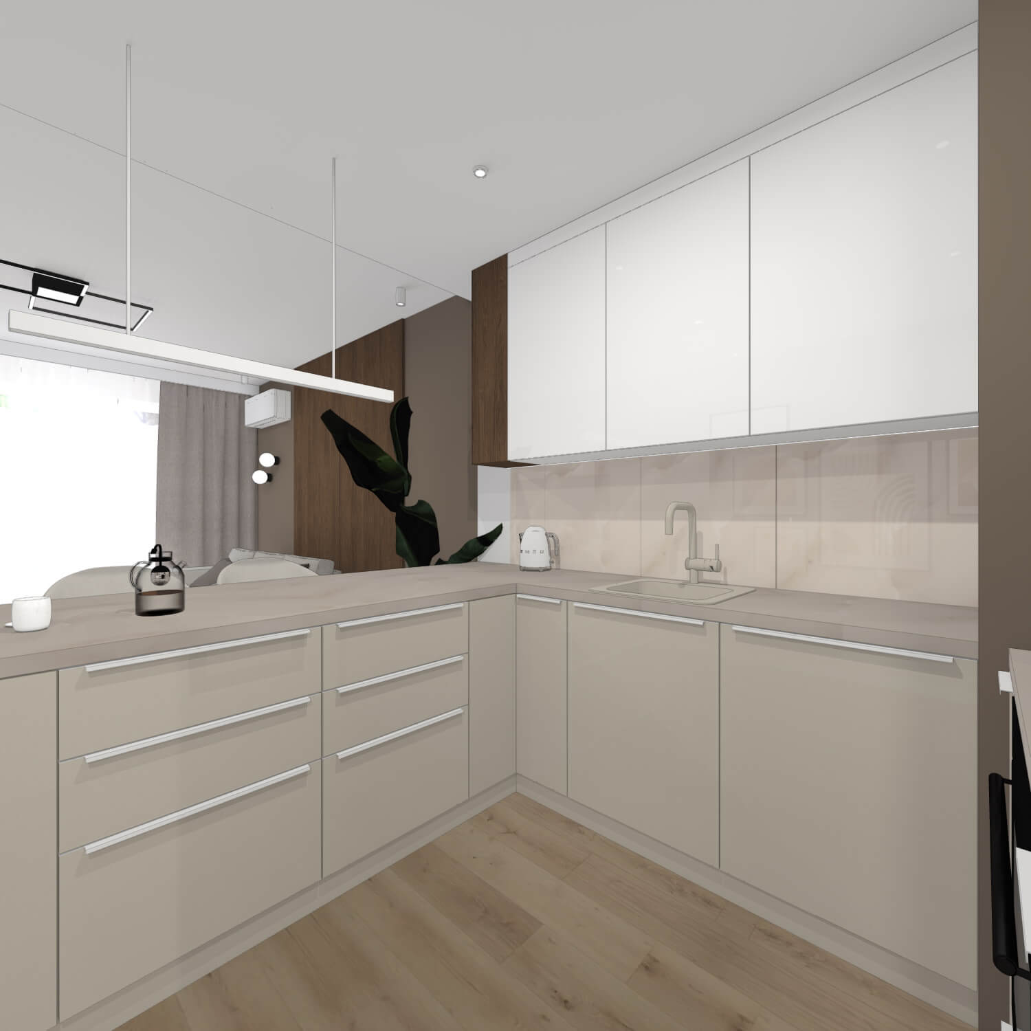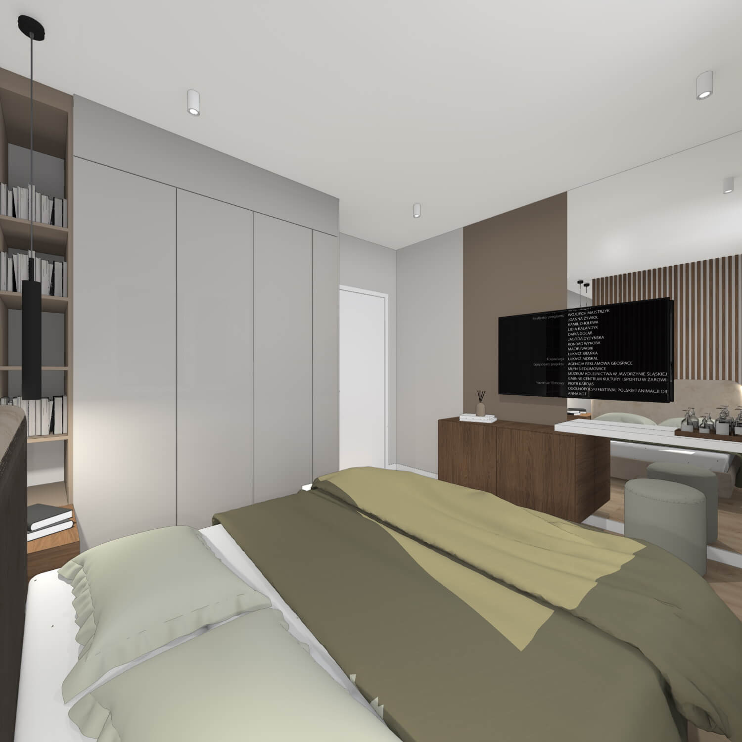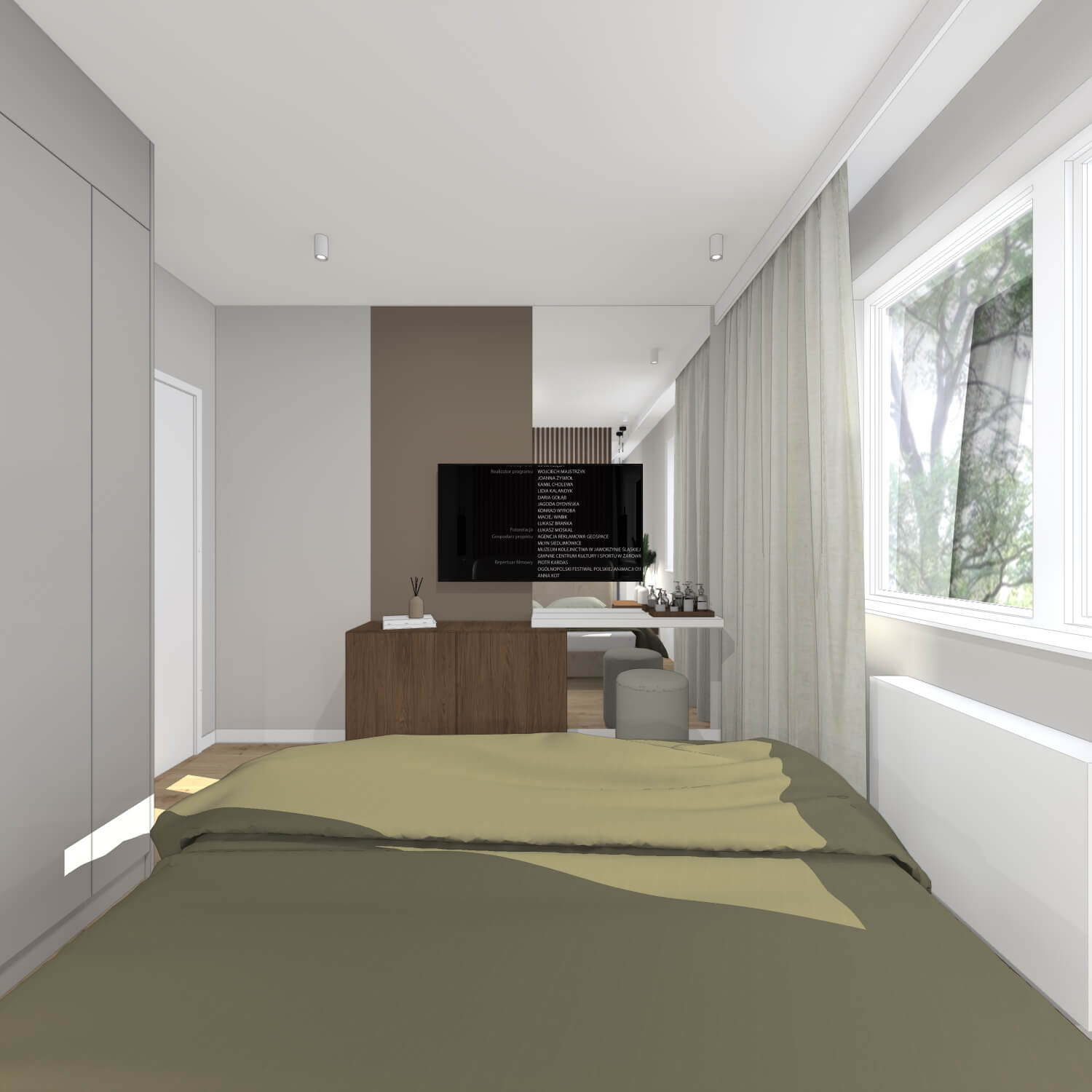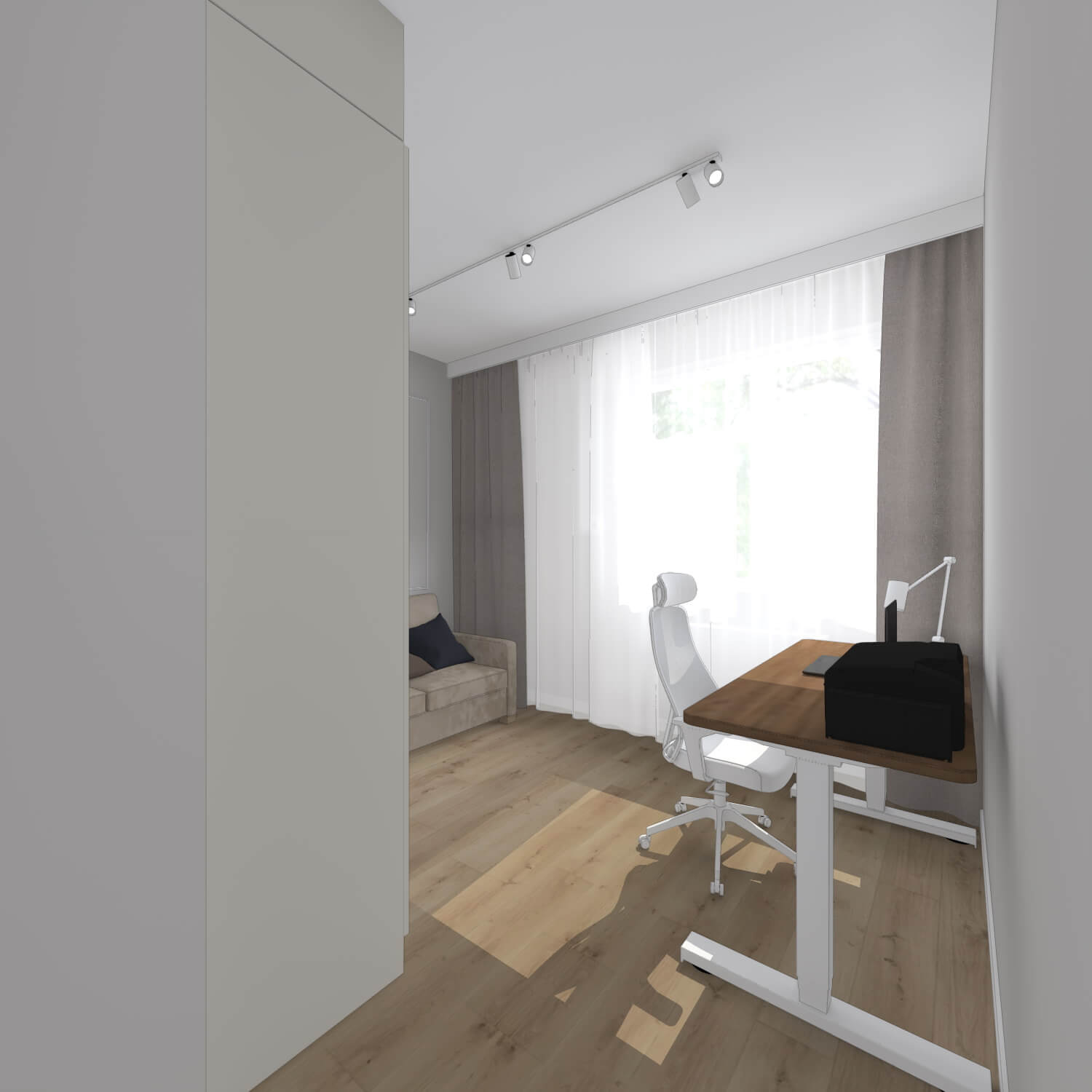 Głównym założeniem było stworzenie spójnej i harmonijnej przestrzeni, sprzyjającej zarówno relaksowi, jak i efektywnej pracy. Wnętrza utrzymano w ciepłej, stonowanej palecie barw, łączącej odcienie beżu, szarości i naturalnego drewna. Kluczowym elementem scalającym projekt są drewniane lamele, które konsekwentnie pojawiają się w sypialni, przedpokoju oraz łazience, nadając całości elegancki i uporządkowany wygląd. Projekt charakteryzuje się funkcjonalnym minimalizmem, gdzie każdy detal ma swoje miejsce, tworząc przestrzeń idealną do życia.