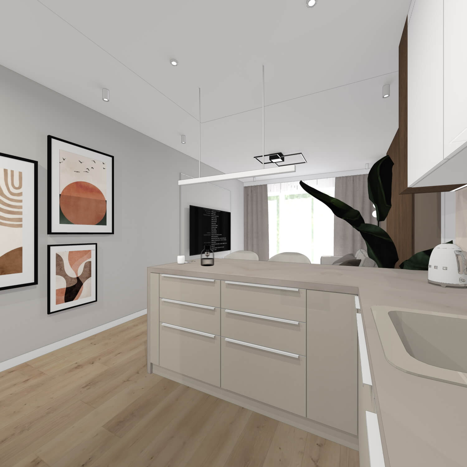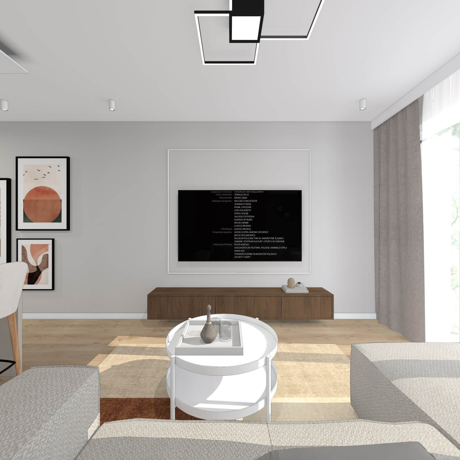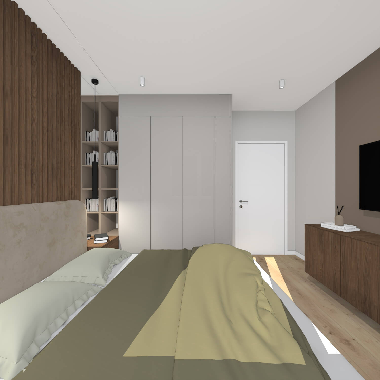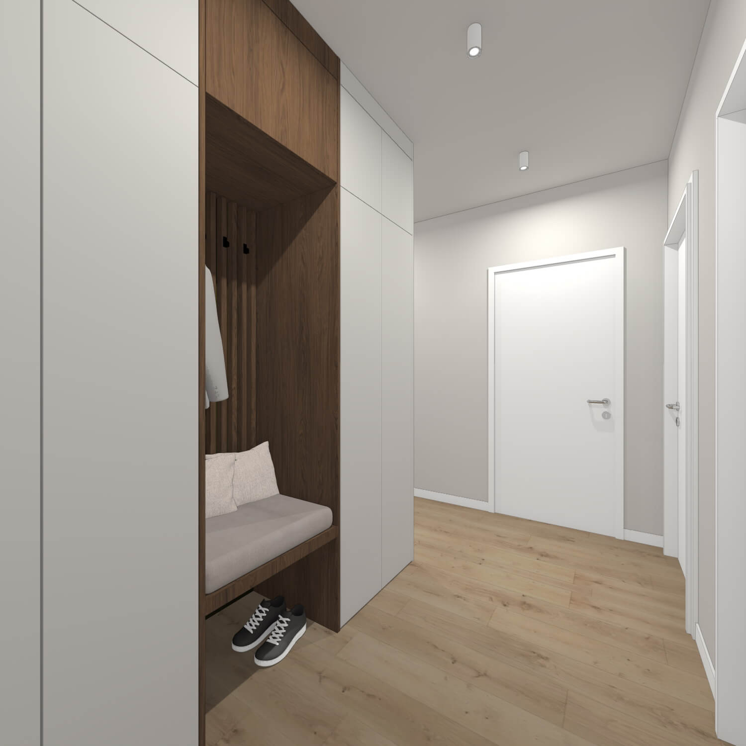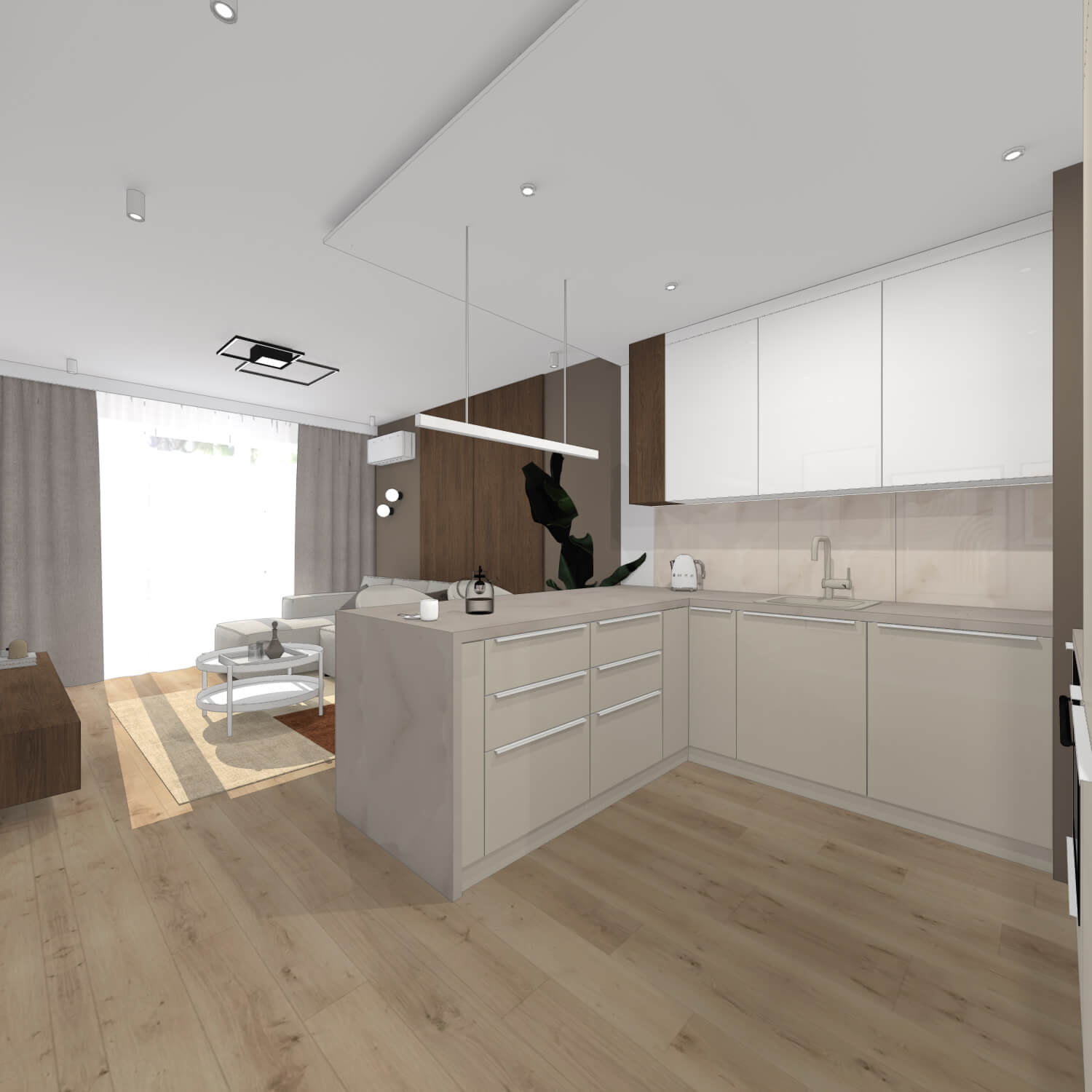 Głównym założeniem było stworzenie spójnej i harmonijnej przestrzeni, sprzyjającej zarówno relaksowi, jak i efektywnej pracy. Wnętrza utrzymano w ciepłej, stonowanej palecie barw, łączącej odcienie beżu, szarości i naturalnego drewna. Kluczowym elementem scalającym projekt są drewniane lamele, które konsekwentnie pojawiają się w sypialni, przedpokoju oraz łazience, nadając całości elegancki i uporządkowany wygląd. Projekt charakteryzuje się funkcjonalnym minimalizmem, gdzie każdy detal ma swoje miejsce, tworząc przestrzeń idealną do życia.
