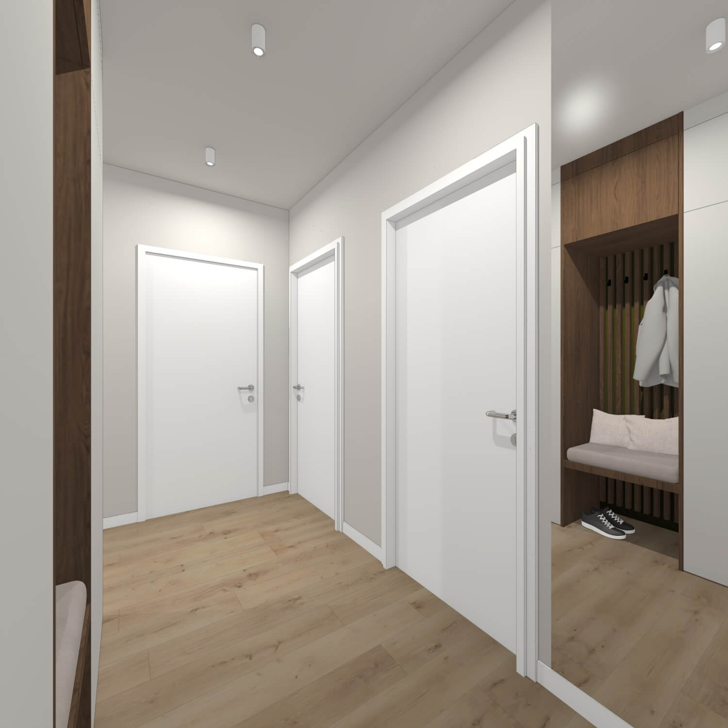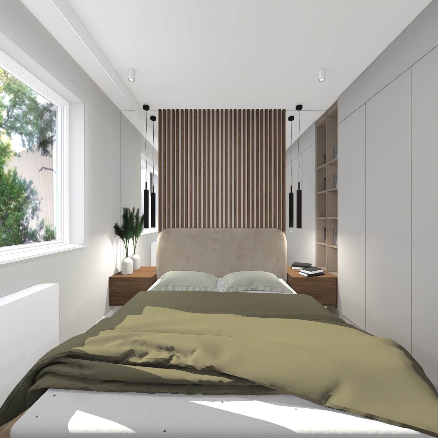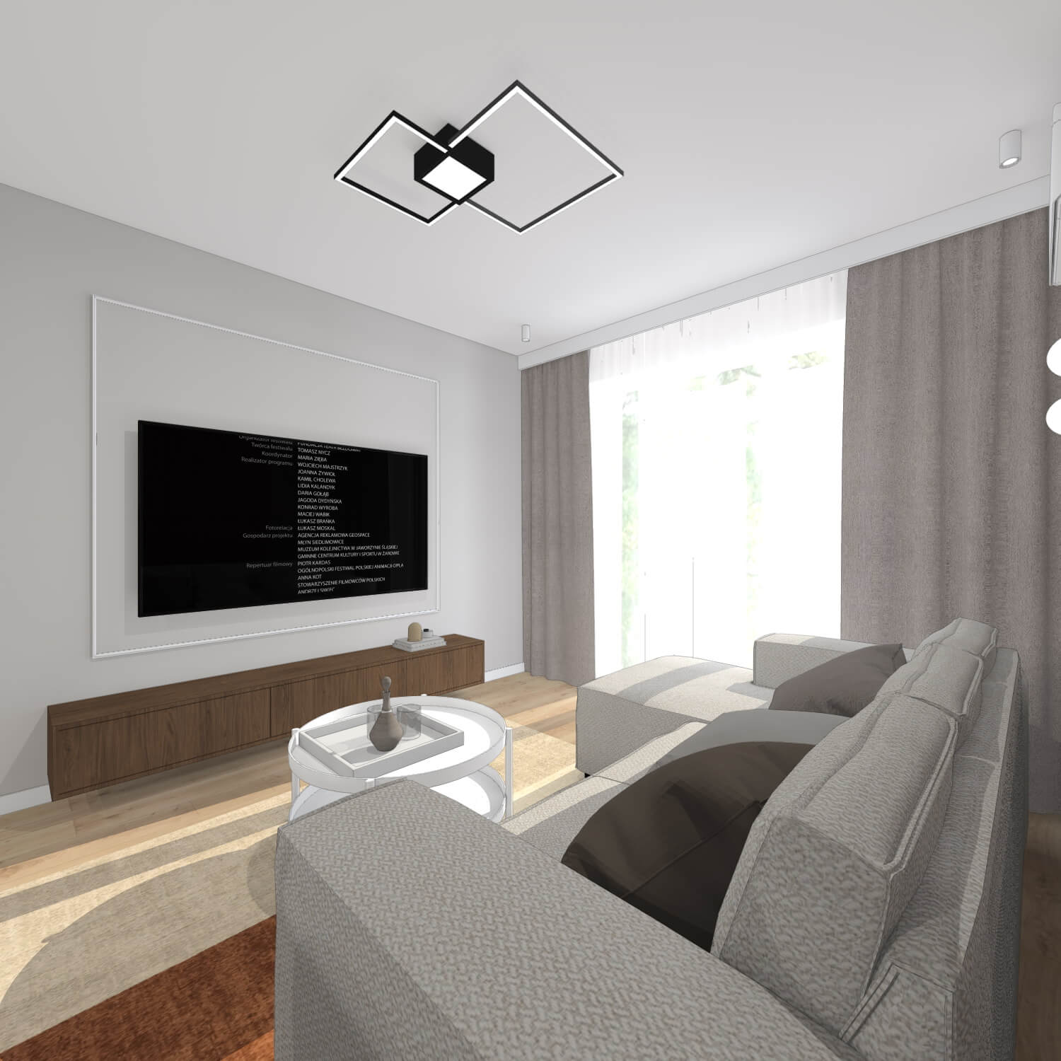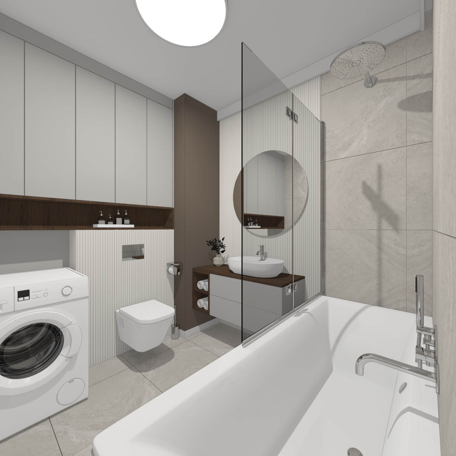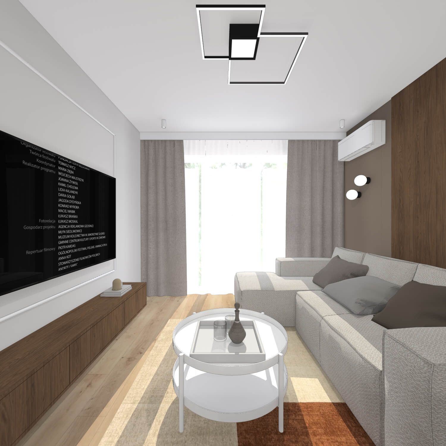Głównym założeniem było stworzenie spójnej i harmonijnej przestrzeni, sprzyjającej zarówno relaksowi, jak i efektywnej pracy. Wnętrza utrzymano w ciepłej, stonowanej palecie barw, łączącej odcienie beżu, szarości i naturalnego drewna. Kluczowym elementem scalającym projekt są drewniane lamele, które konsekwentnie pojawiają się w sypialni, przedpokoju oraz łazience, nadając całości elegancki i uporządkowany wygląd. Projekt charakteryzuje się funkcjonalnym minimalizmem, gdzie każdy detal ma swoje miejsce, tworząc przestrzeń idealną do życia.