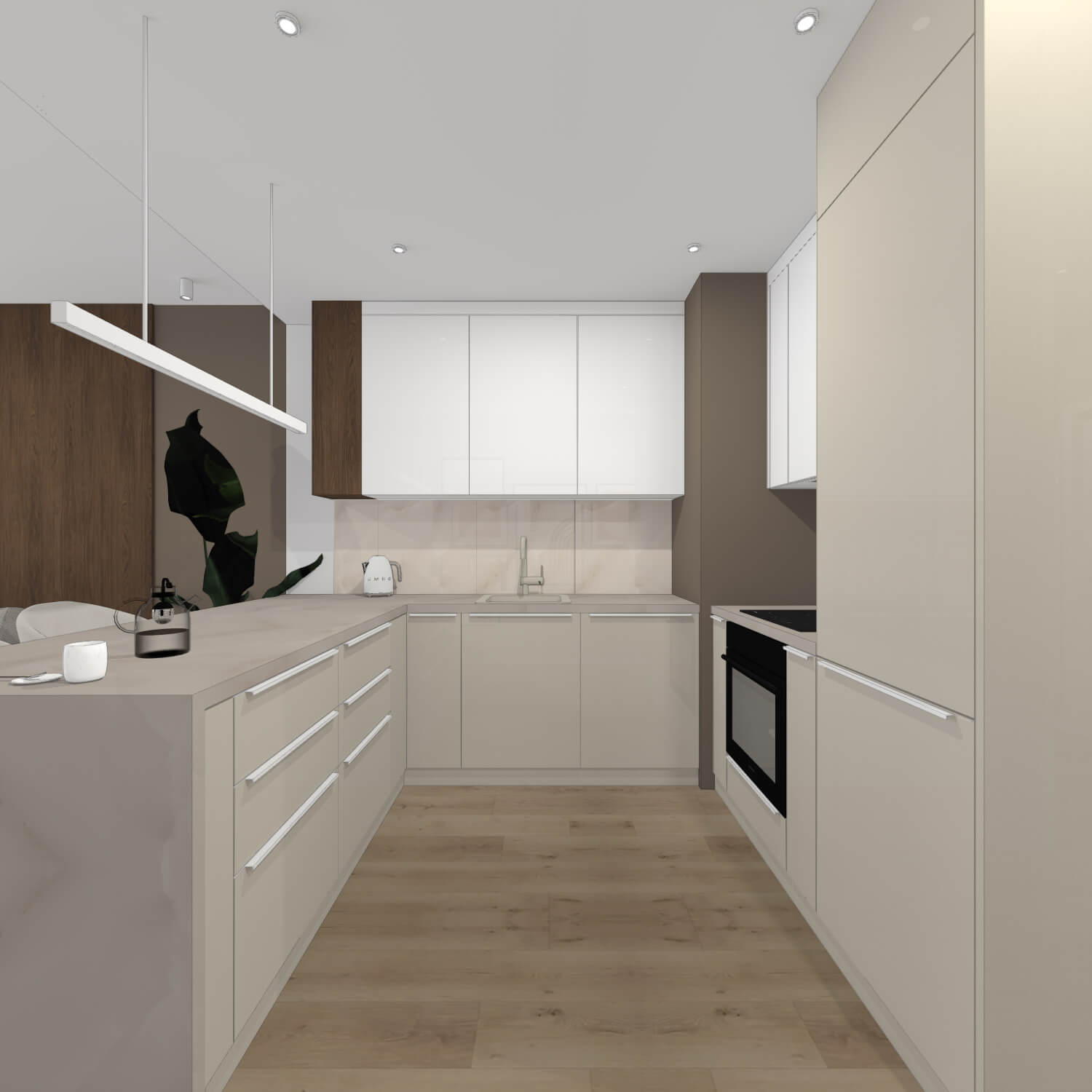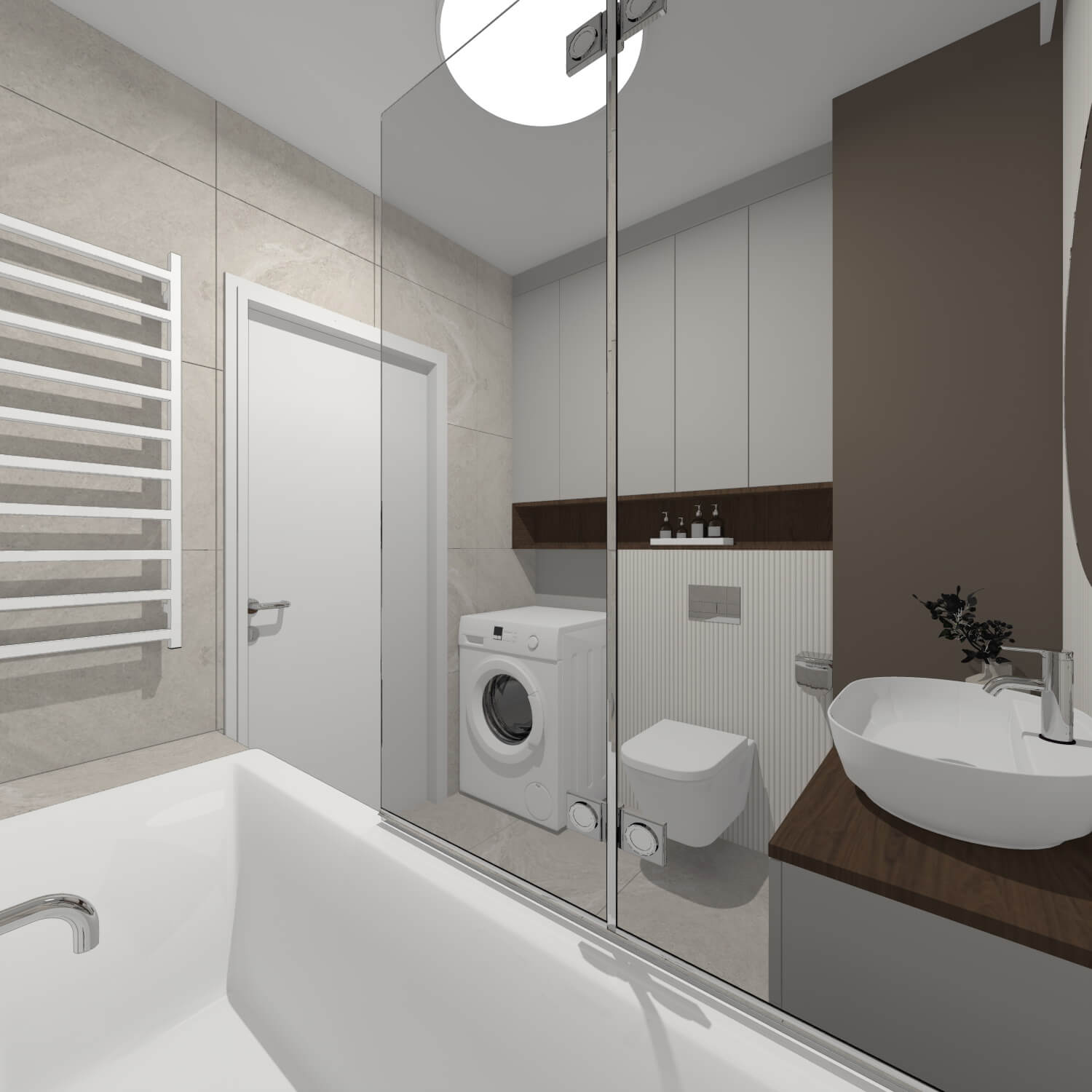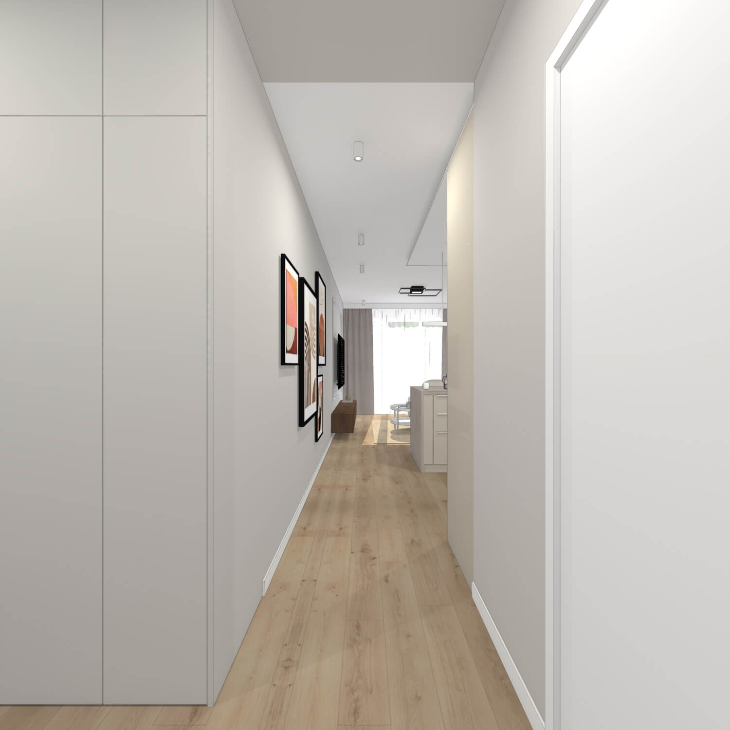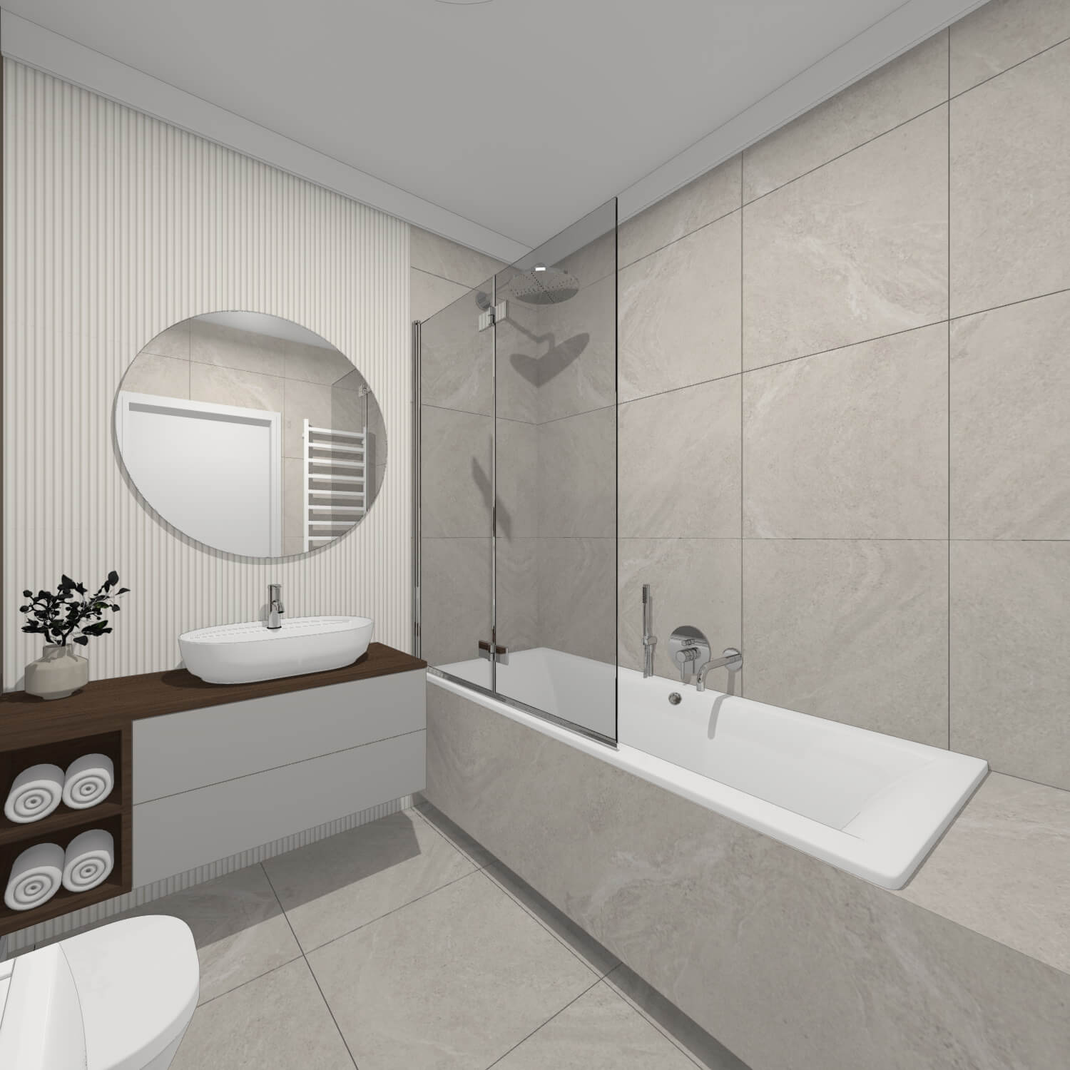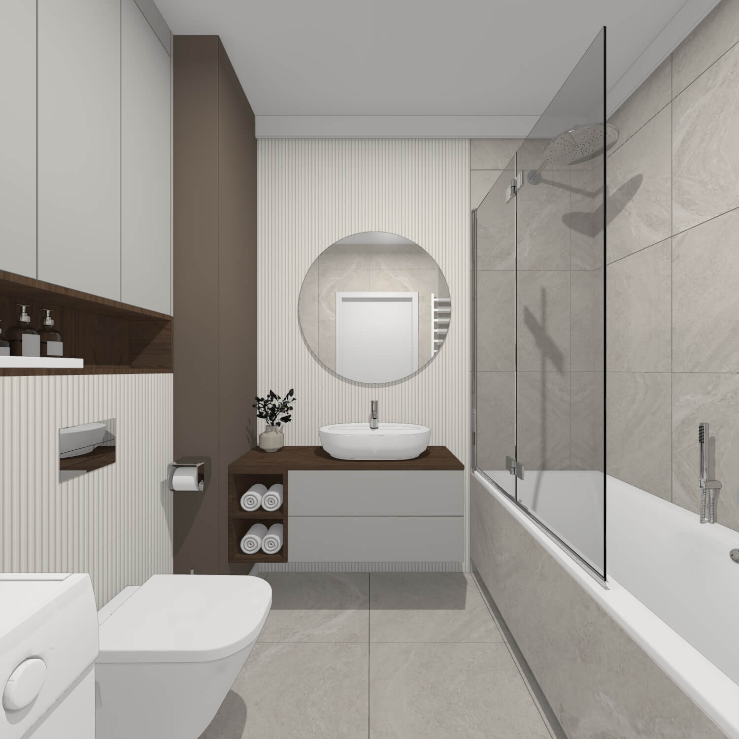 Głównym założeniem było stworzenie spójnej i harmonijnej przestrzeni, sprzyjającej zarówno relaksowi, jak i efektywnej pracy. Wnętrza utrzymano w ciepłej, stonowanej palecie barw, łączącej odcienie beżu, szarości i naturalnego drewna. Kluczowym elementem scalającym projekt są drewniane lamele, które konsekwentnie pojawiają się w sypialni, przedpokoju oraz łazience, nadając całości elegancki i uporządkowany wygląd. Projekt charakteryzuje się funkcjonalnym minimalizmem, gdzie każdy detal ma swoje miejsce, tworząc przestrzeń idealną do życia.