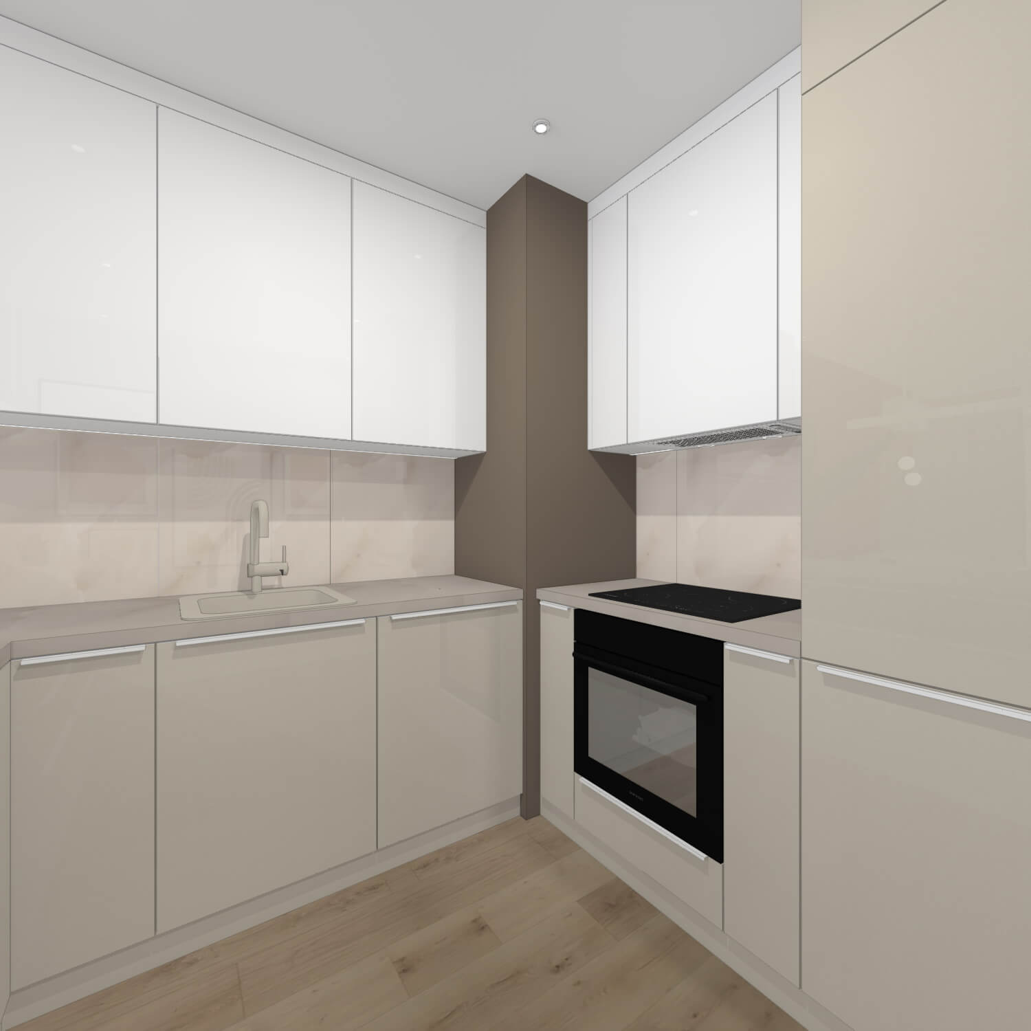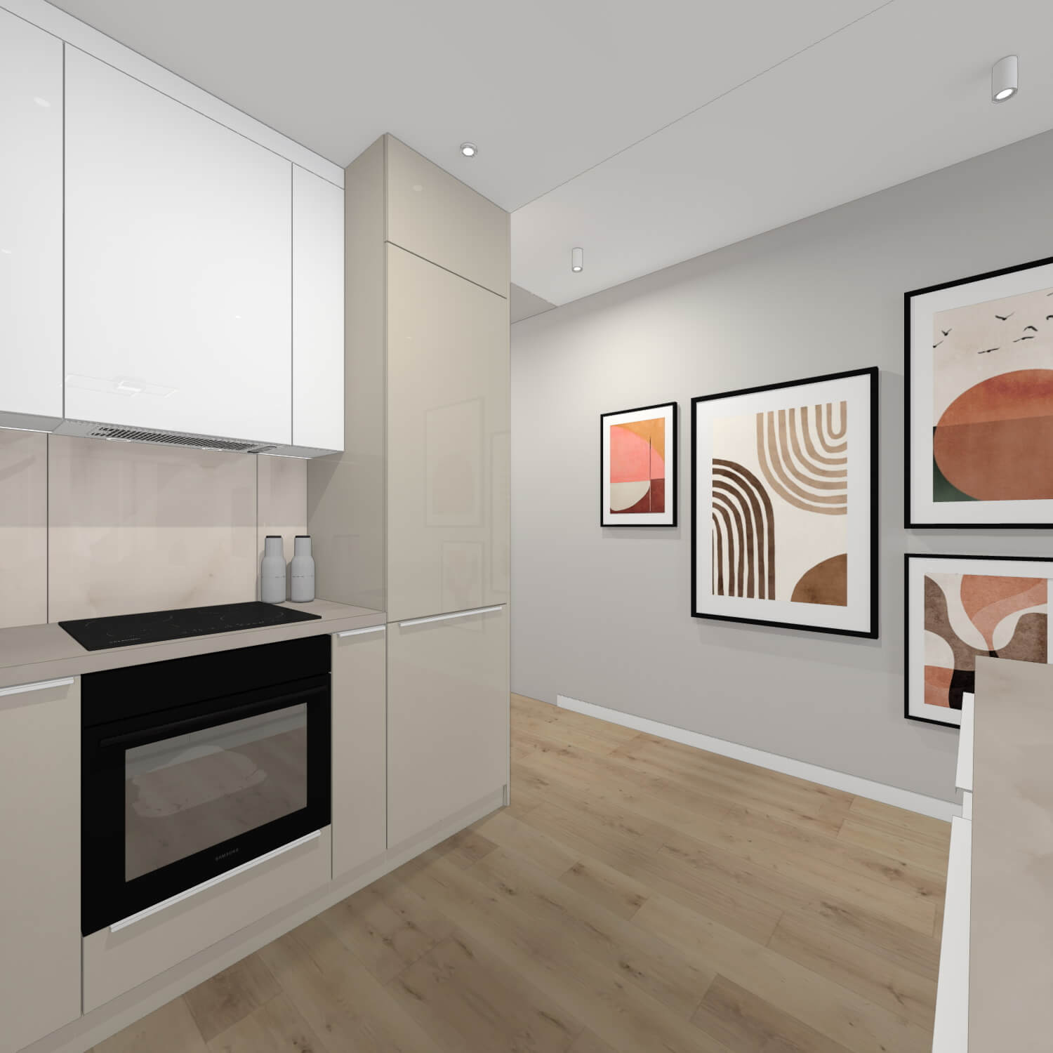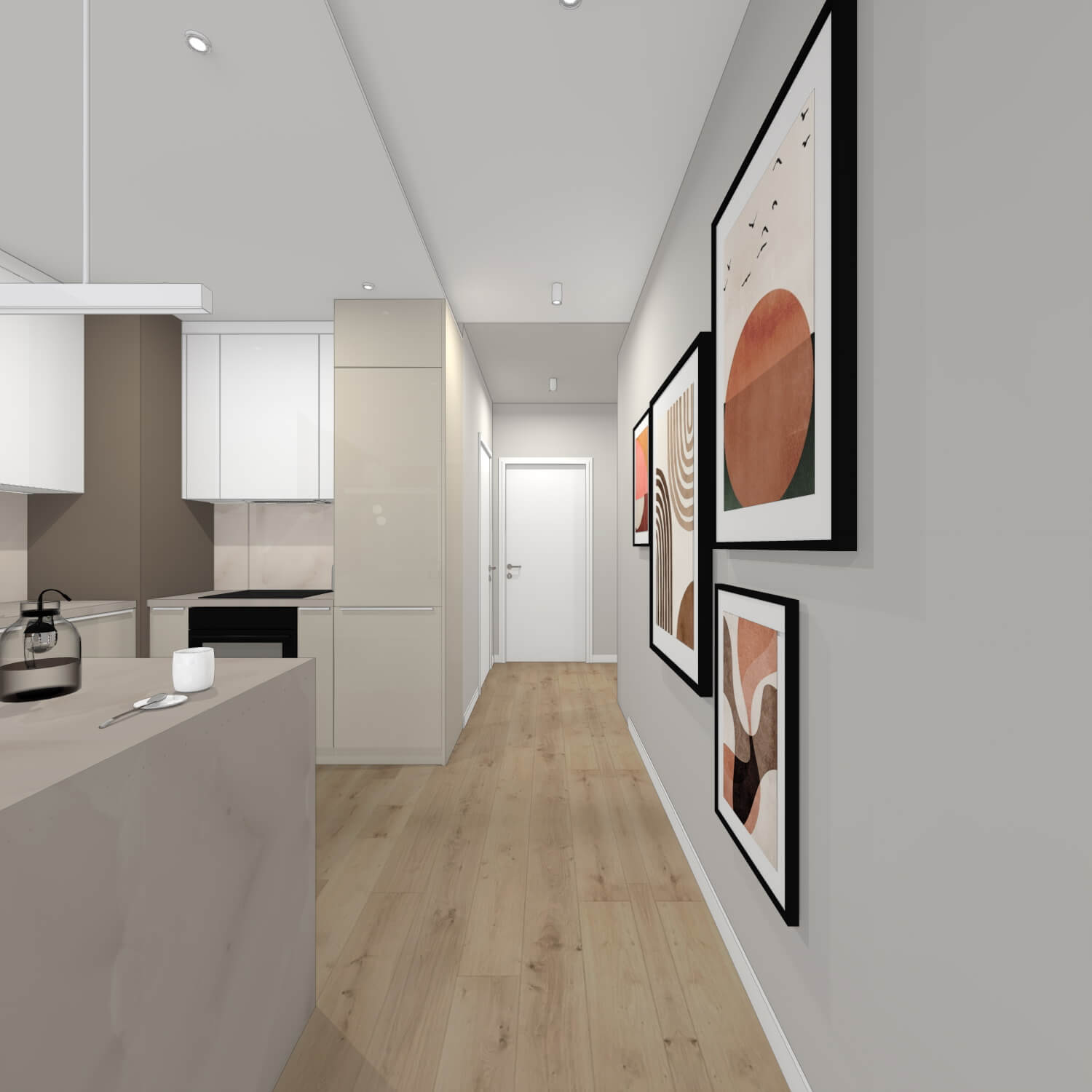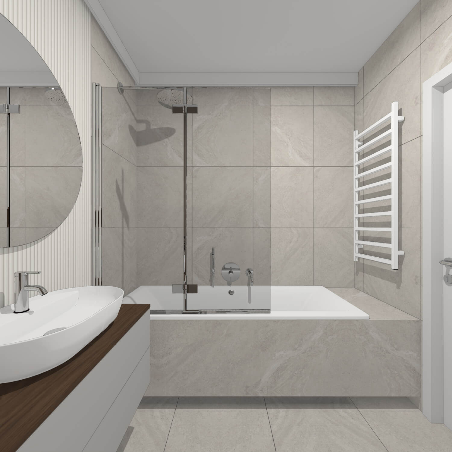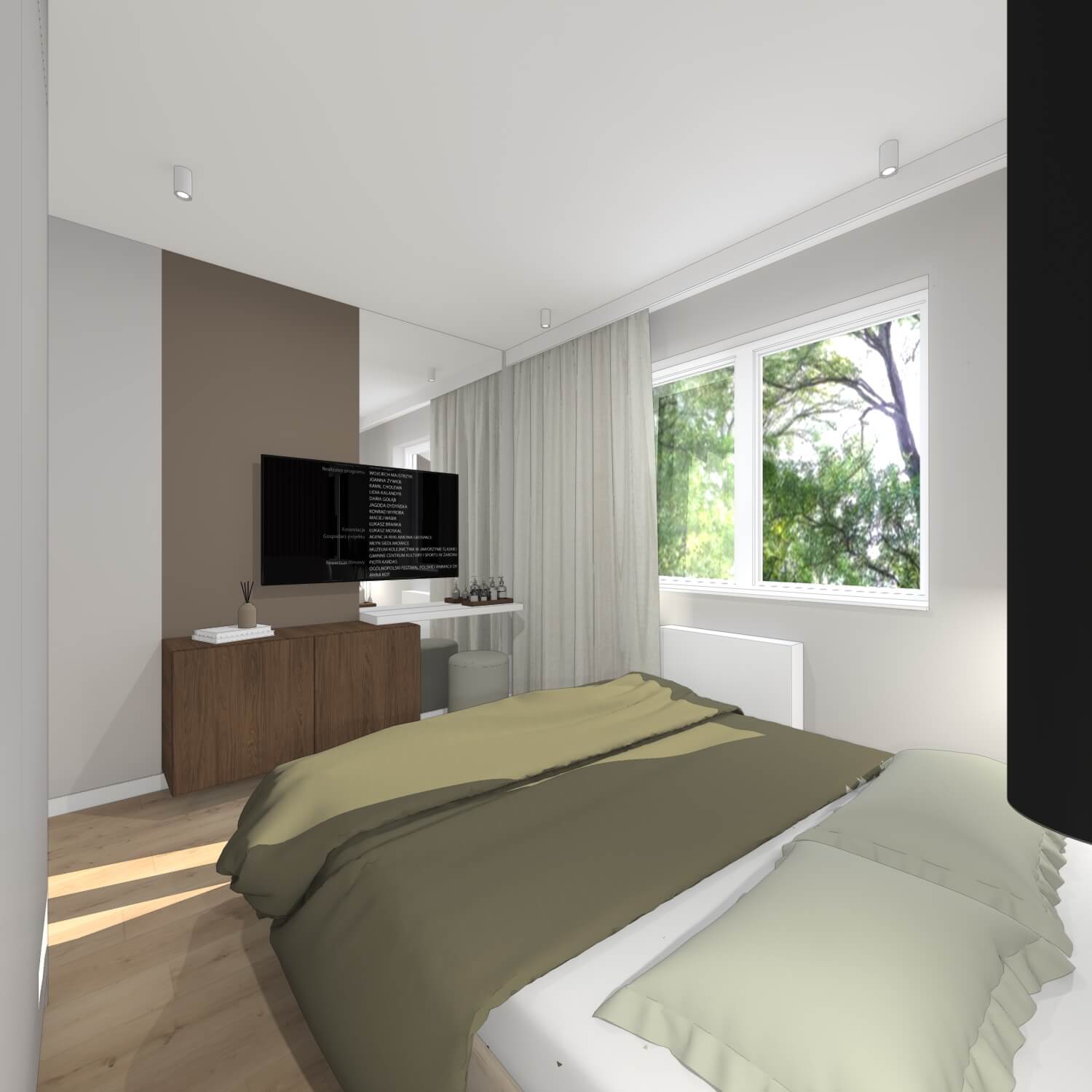 Głównym założeniem było stworzenie spójnej i harmonijnej przestrzeni, sprzyjającej zarówno relaksowi, jak i efektywnej pracy. Wnętrza utrzymano w ciepłej, stonowanej palecie barw, łączącej odcienie beżu, szarości i naturalnego drewna. Kluczowym elementem scalającym projekt są drewniane lamele, które konsekwentnie pojawiają się w sypialni, przedpokoju oraz łazience, nadając całości elegancki i uporządkowany wygląd. Projekt charakteryzuje się funkcjonalnym minimalizmem, gdzie każdy detal ma swoje miejsce, tworząc przestrzeń idealną do życia.