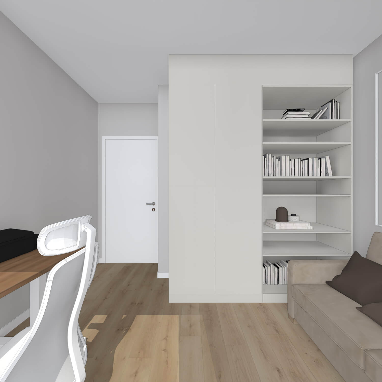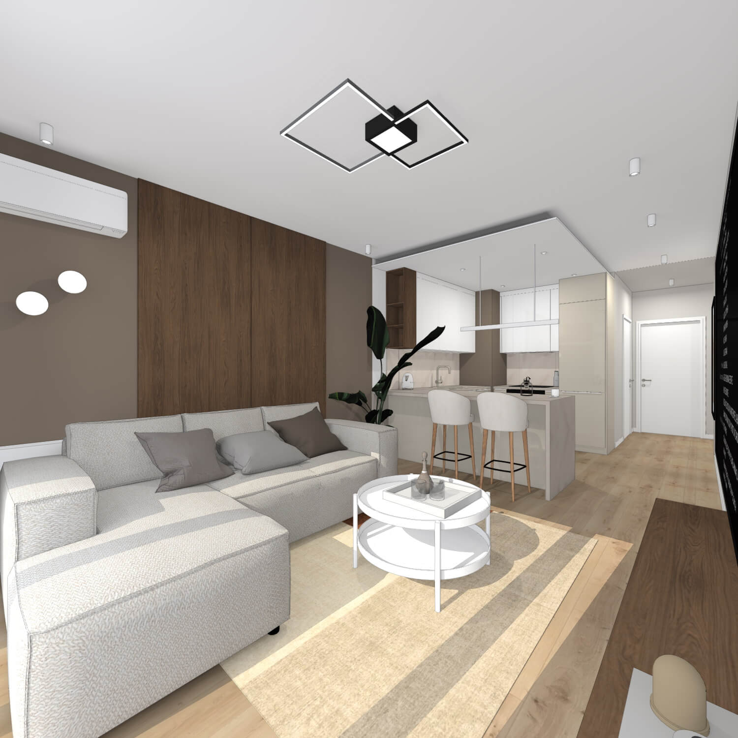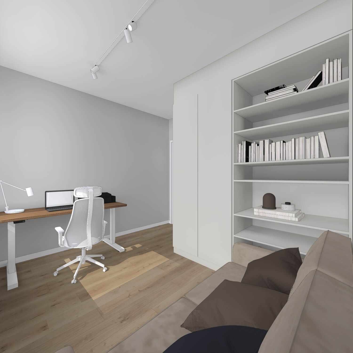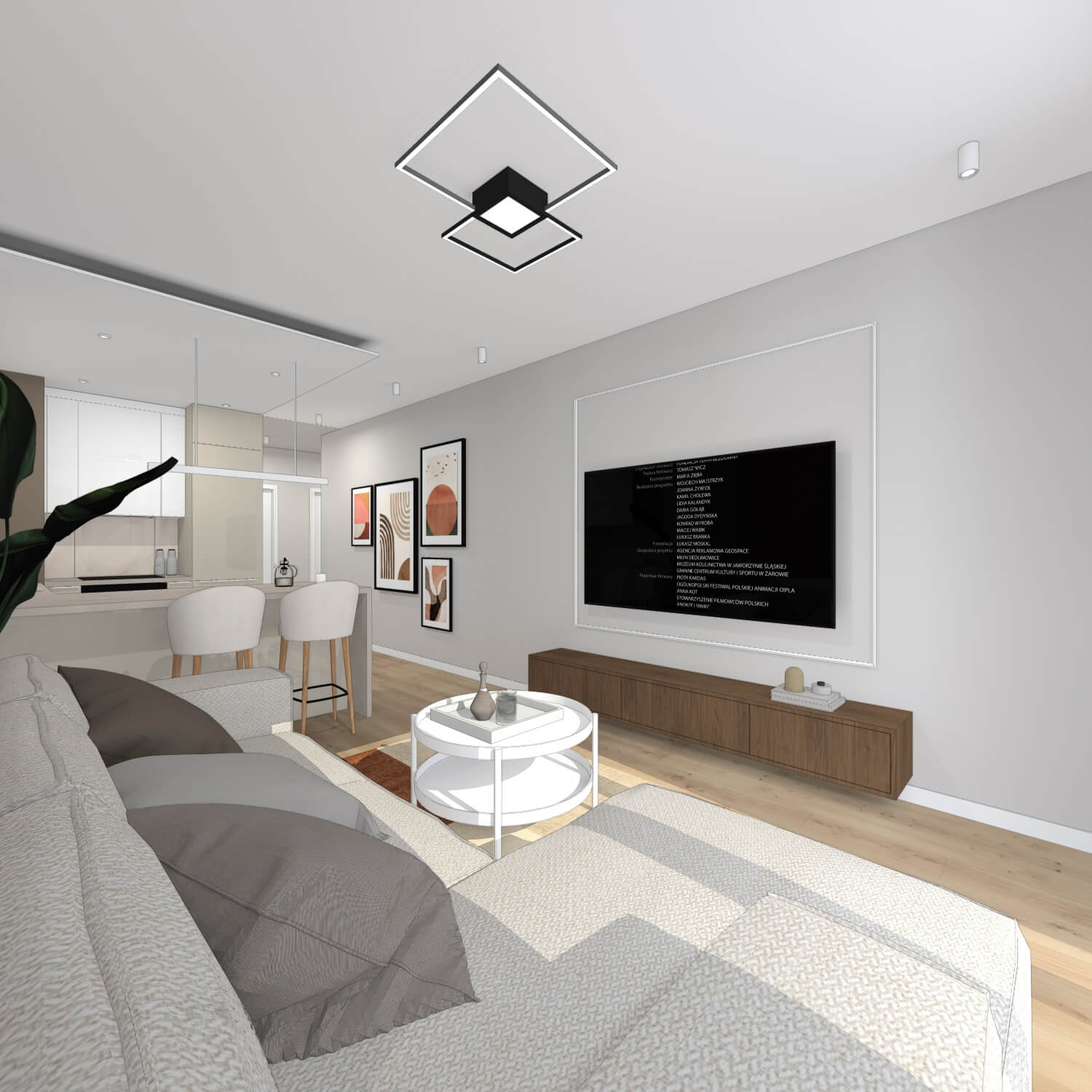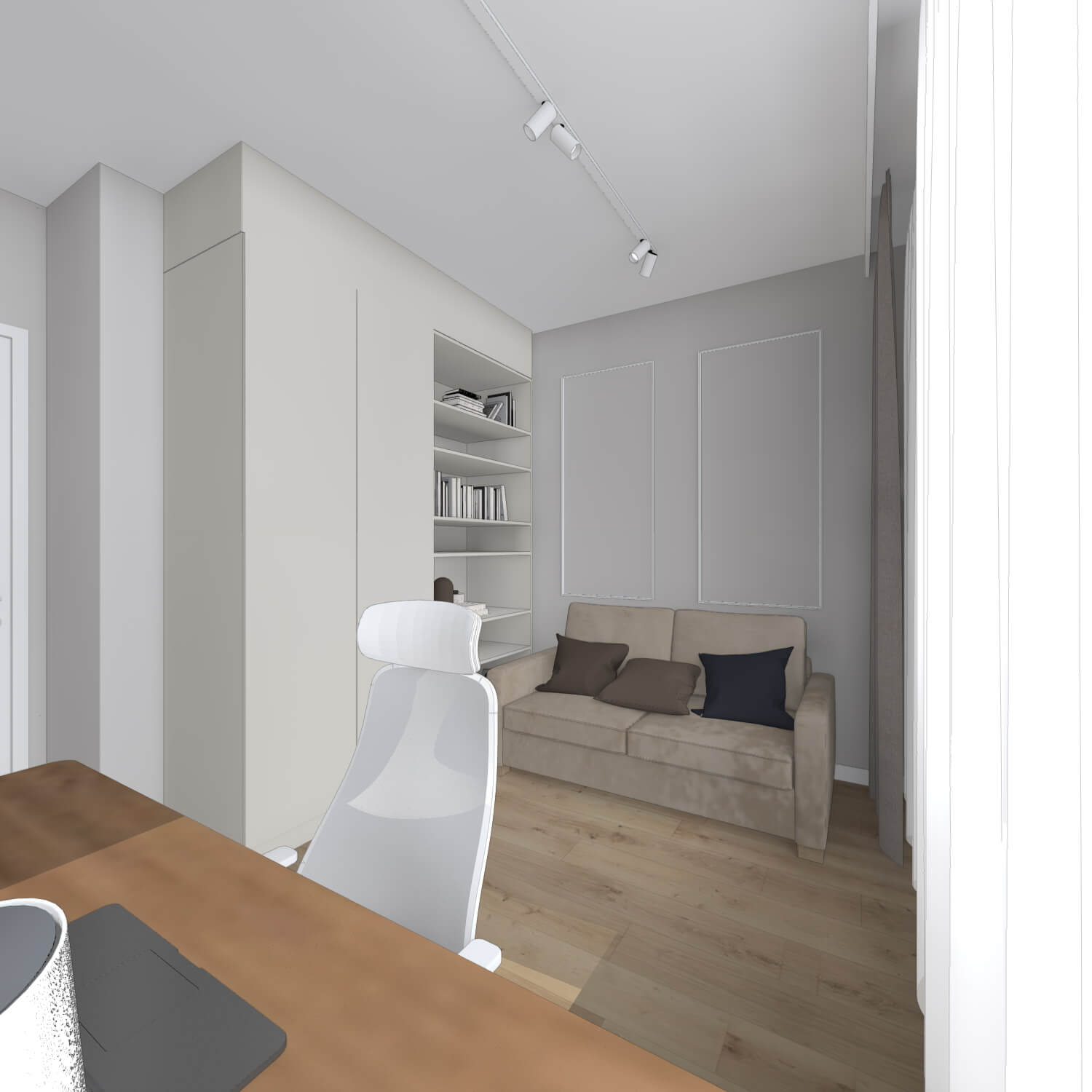 Kompleksowy projekt aranżacji wnętrza, obejmujący salon z aneksem kuchennym, sypialnię, łazienkę oraz gabinet.
