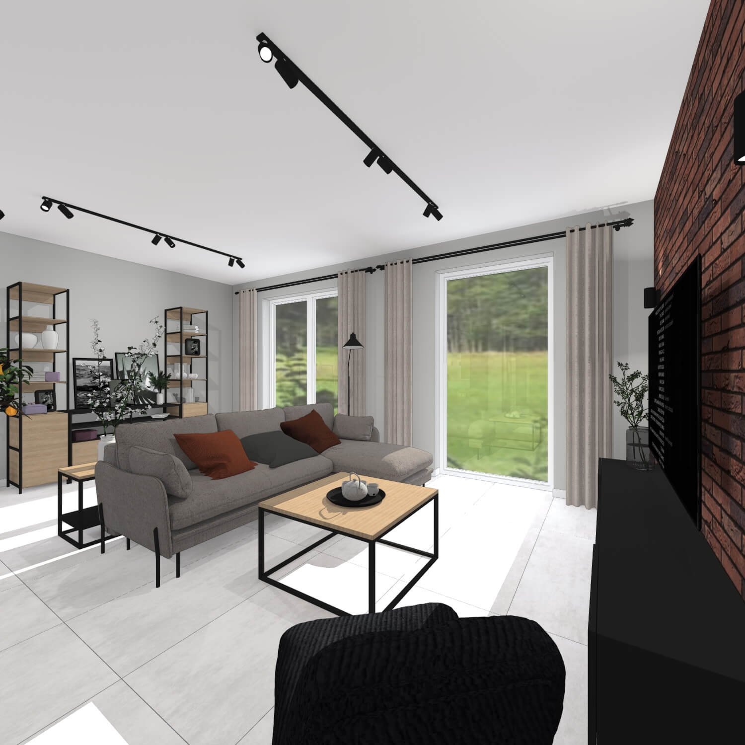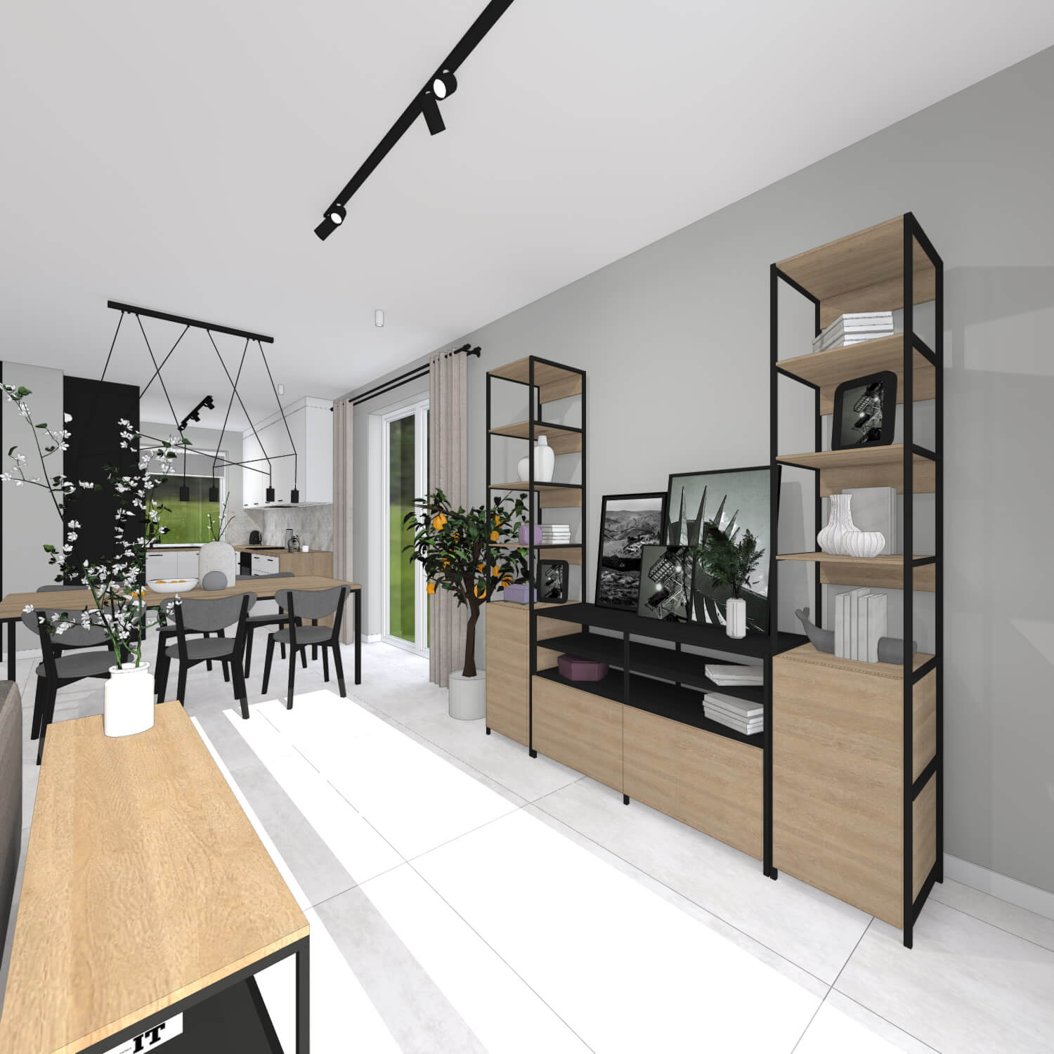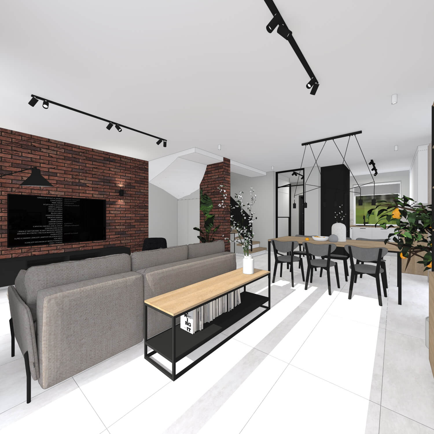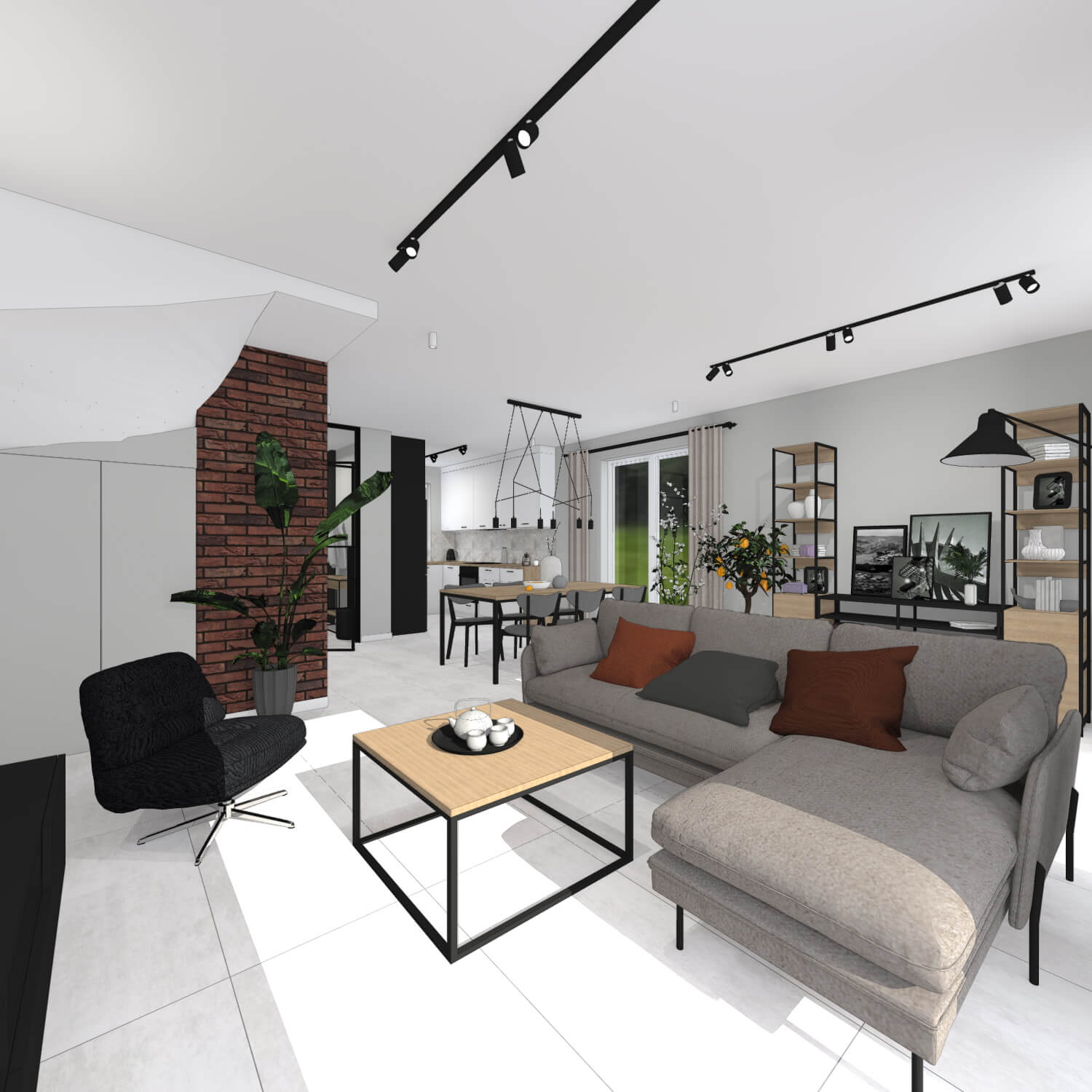 Kompleksowy projekt aranżacji wnętrza o powierzchni 99m2, który łączy nowoczesny design z industrialnymi akcentami. Realizacja objęła projekt salonu z aneksem kuchennym, pokoju dla syna oraz łazienki.