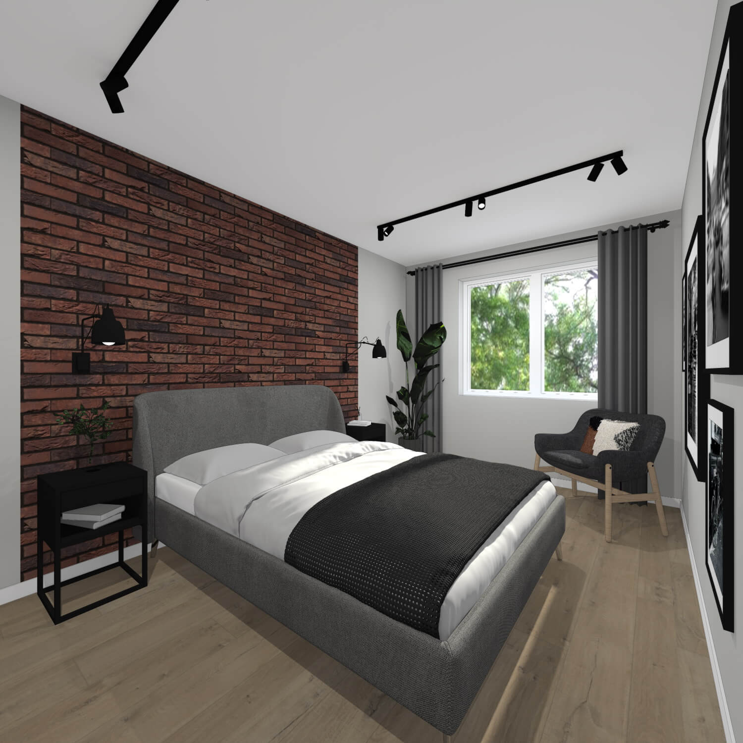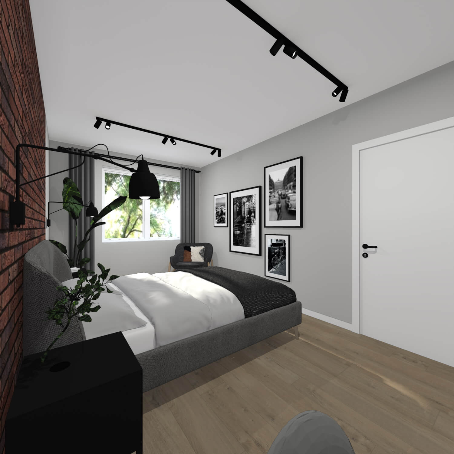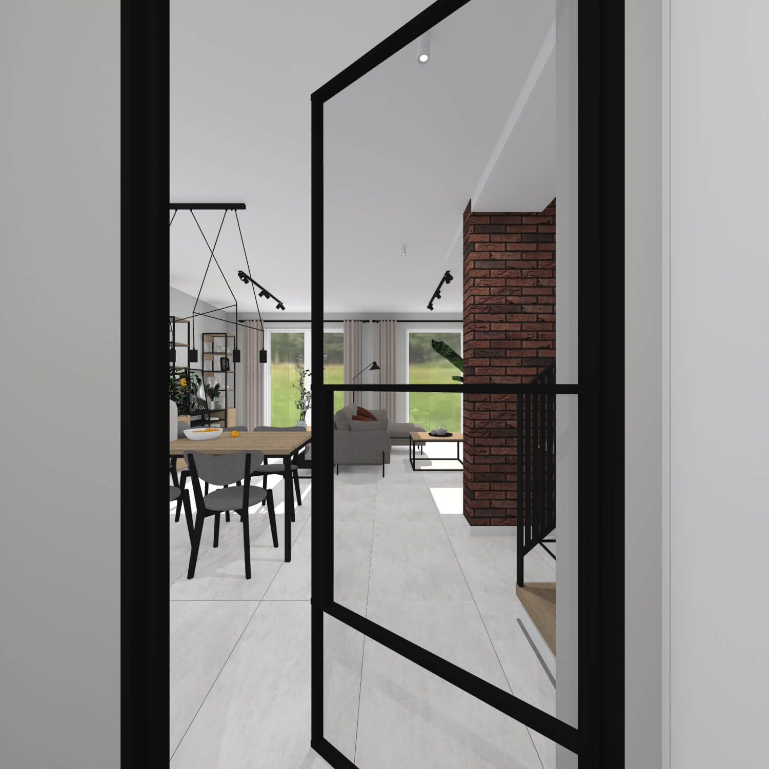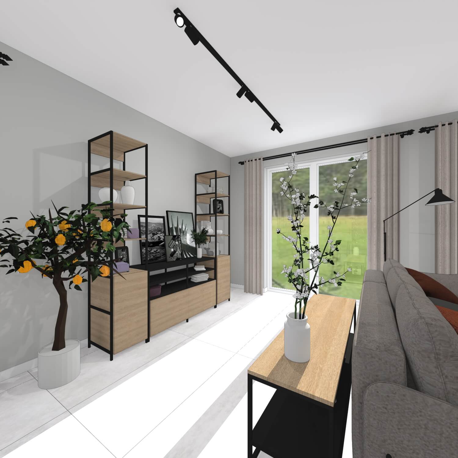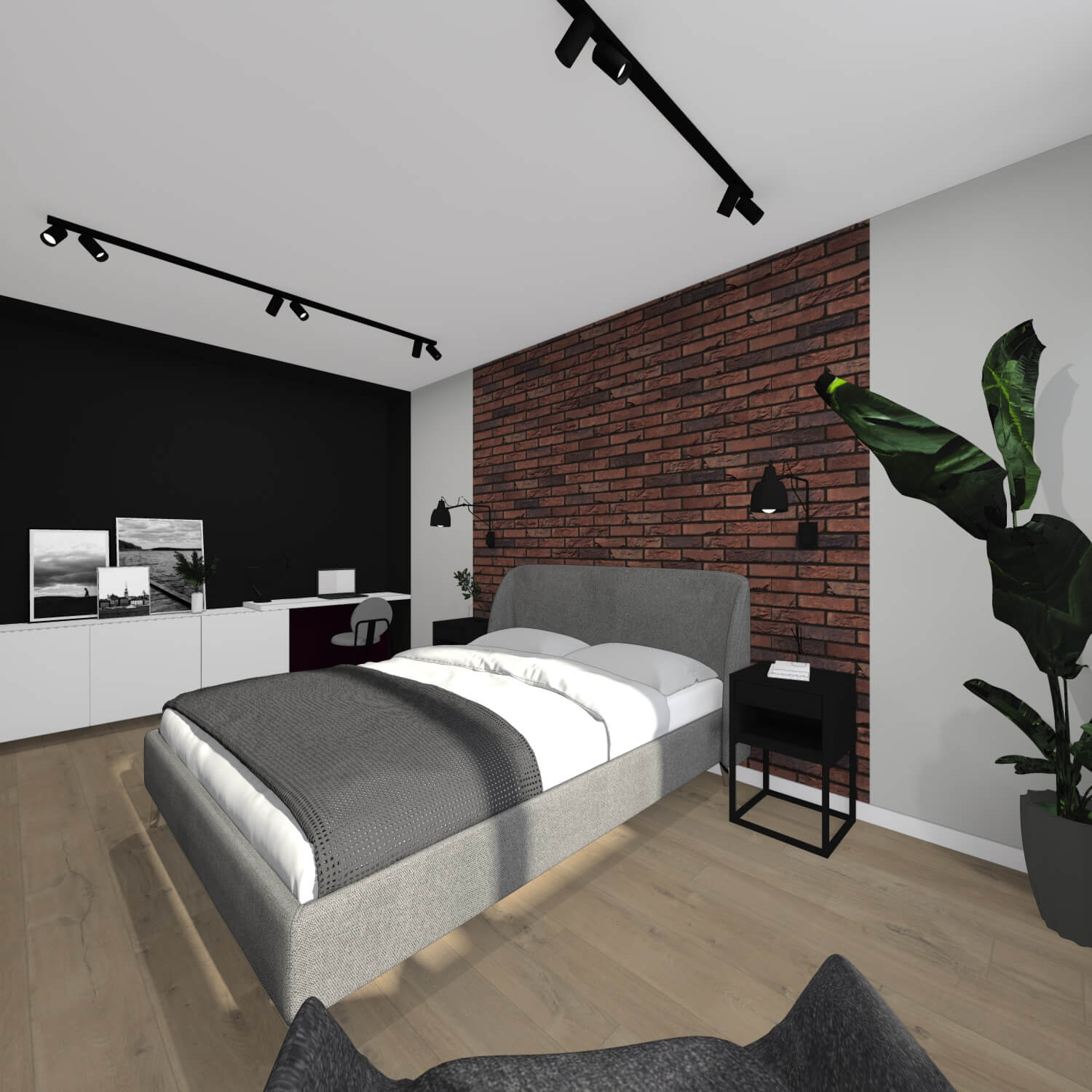 Kompleksowy projekt aranżacji wnętrza o powierzchni 99m2, który łączy nowoczesny design z industrialnymi akcentami. Realizacja objęła projekt salonu z aneksem kuchennym, pokoju dla syna oraz łazienki.