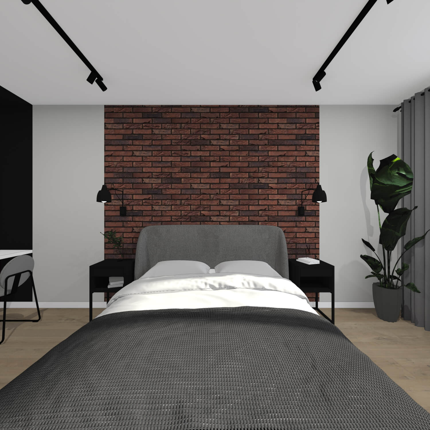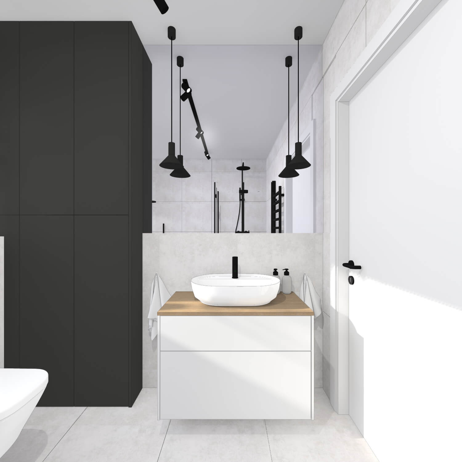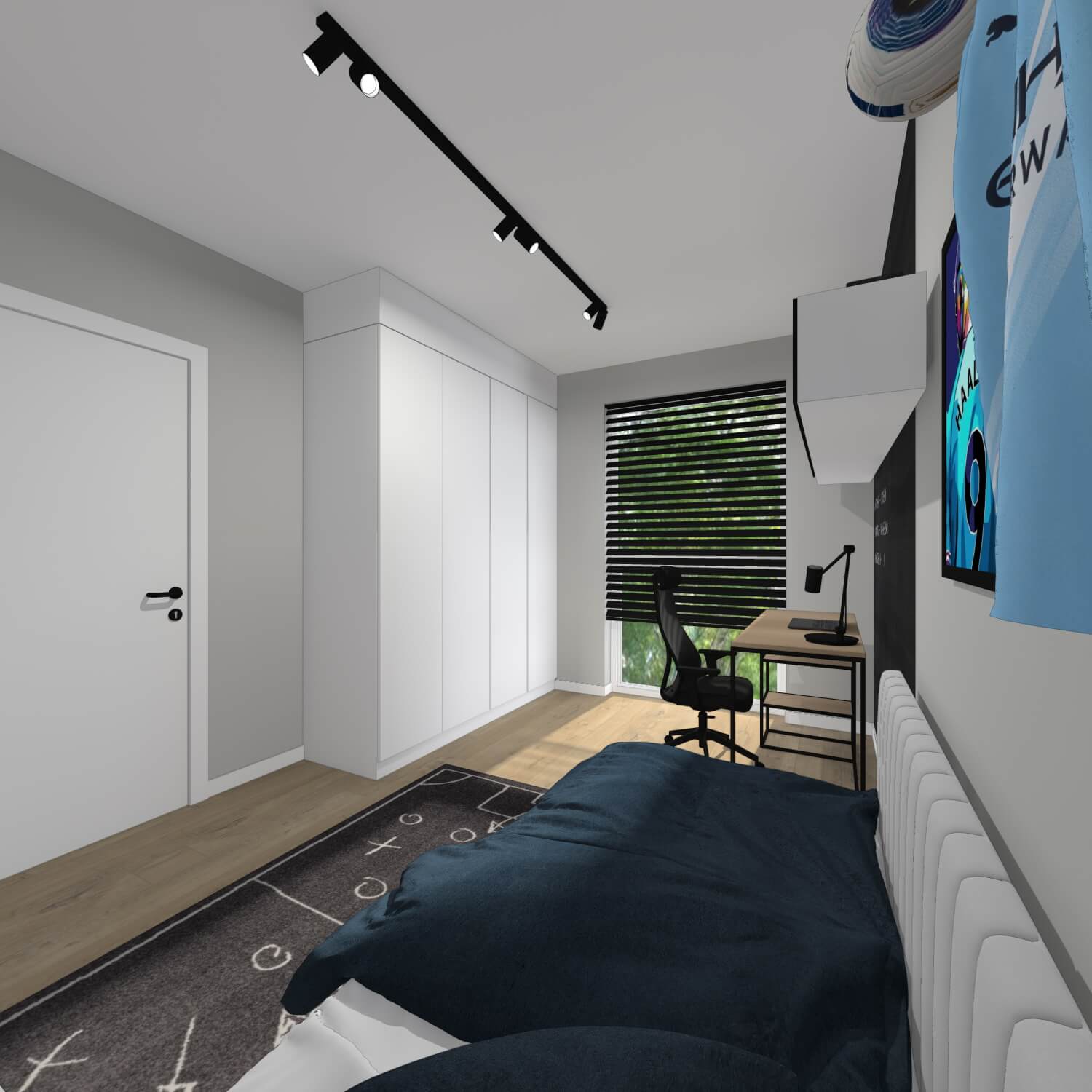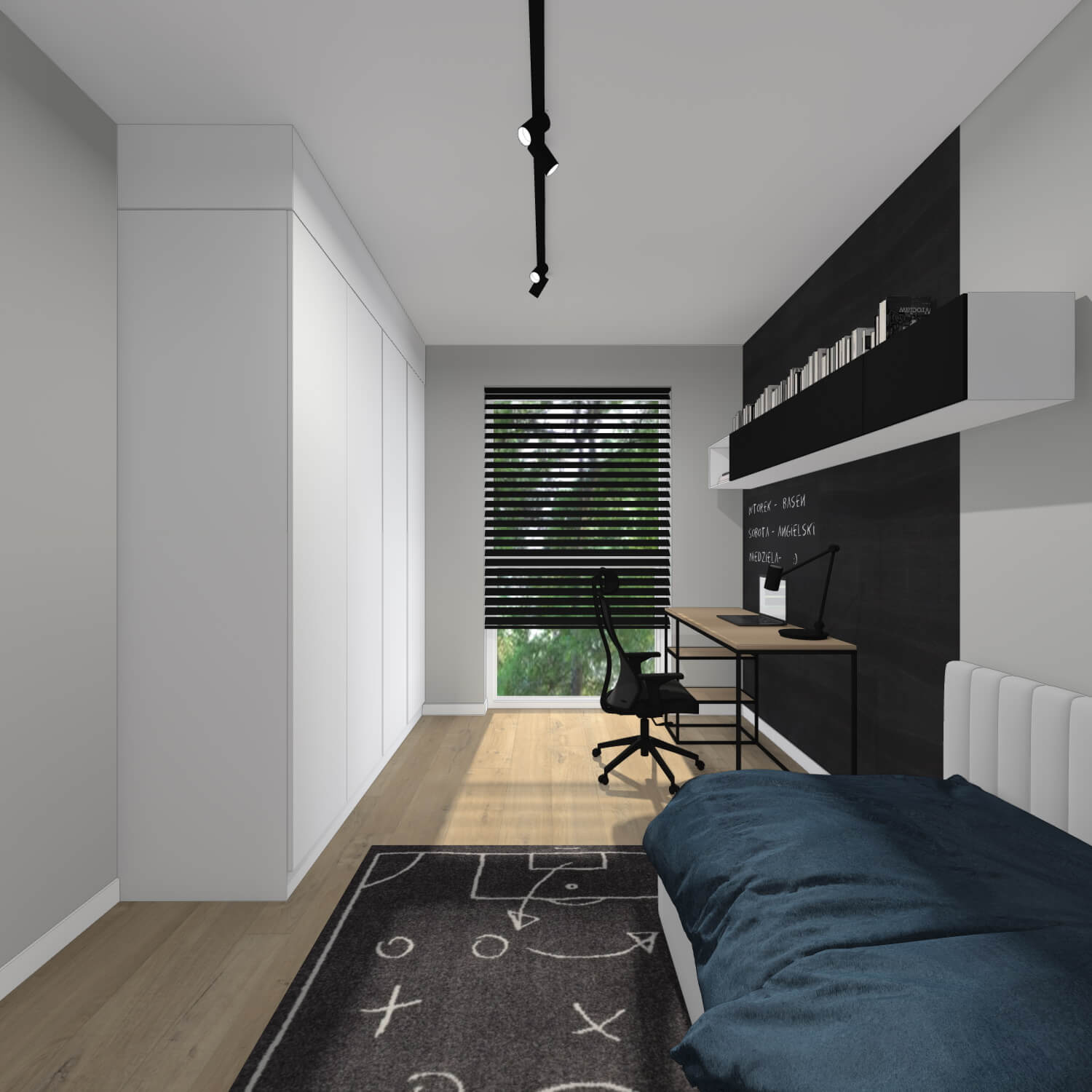 Kompleksowy projekt aranżacji wnętrza o powierzchni 99m2, który łączy nowoczesny design z industrialnymi akcentami. Realizacja objęła projekt salonu z aneksem kuchennym, pokoju dla syna oraz łazienki.