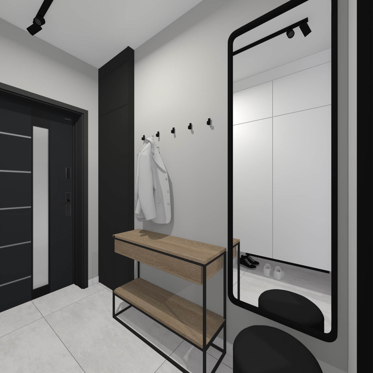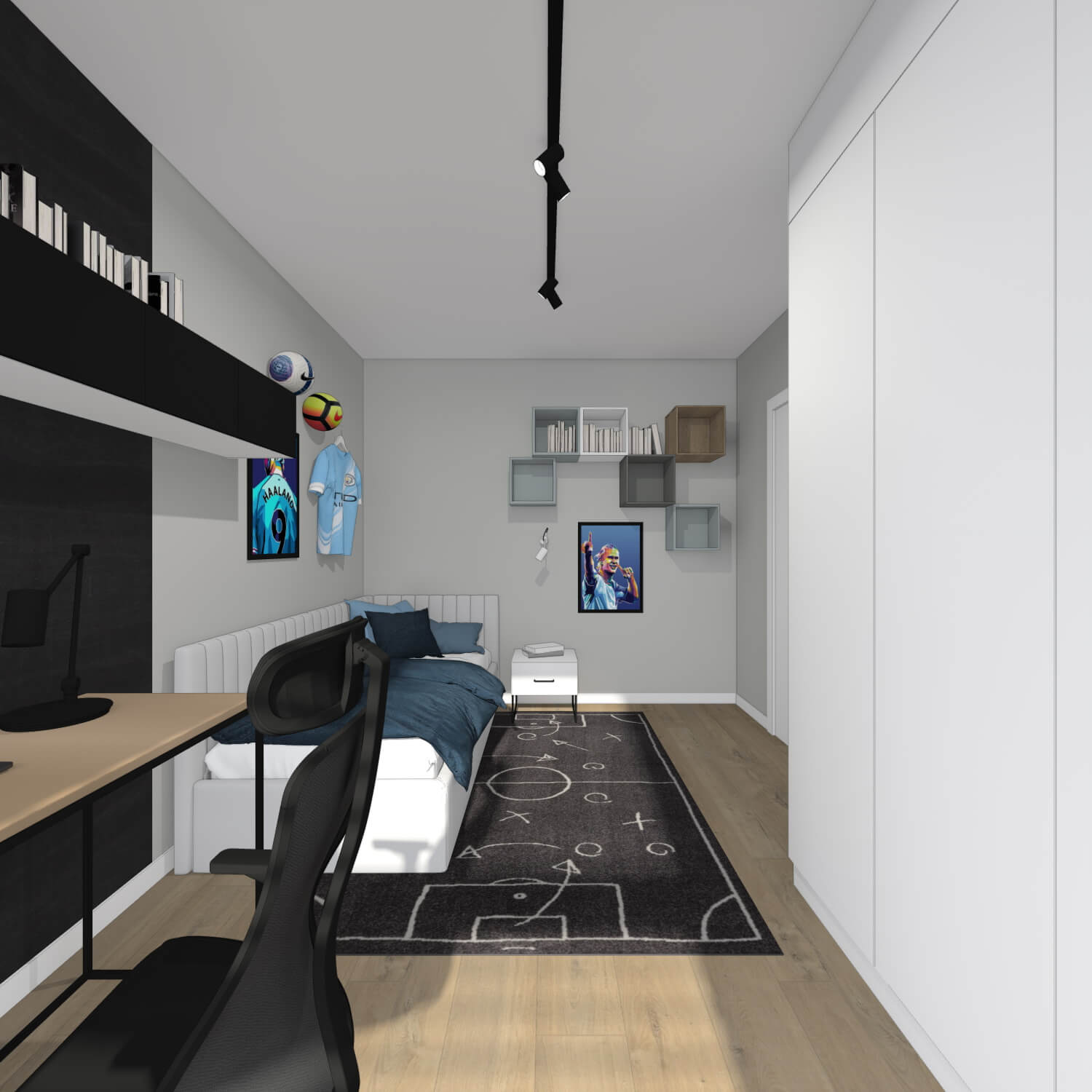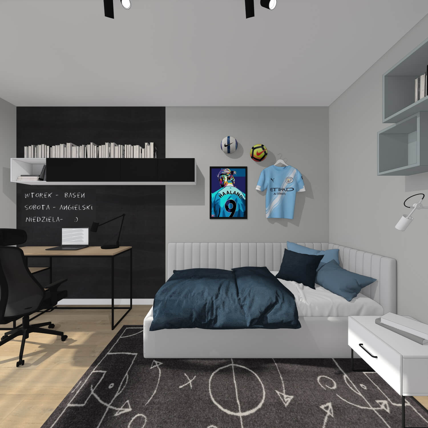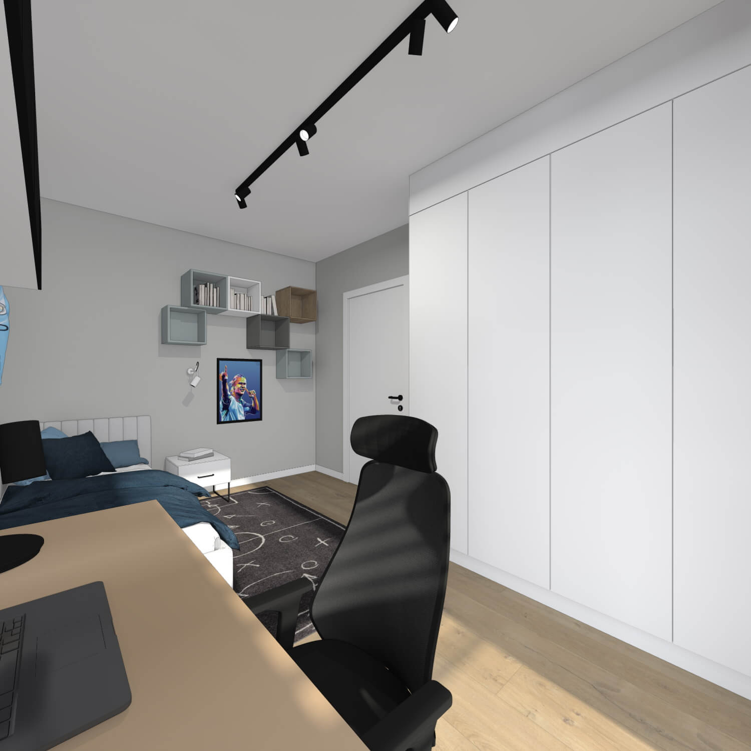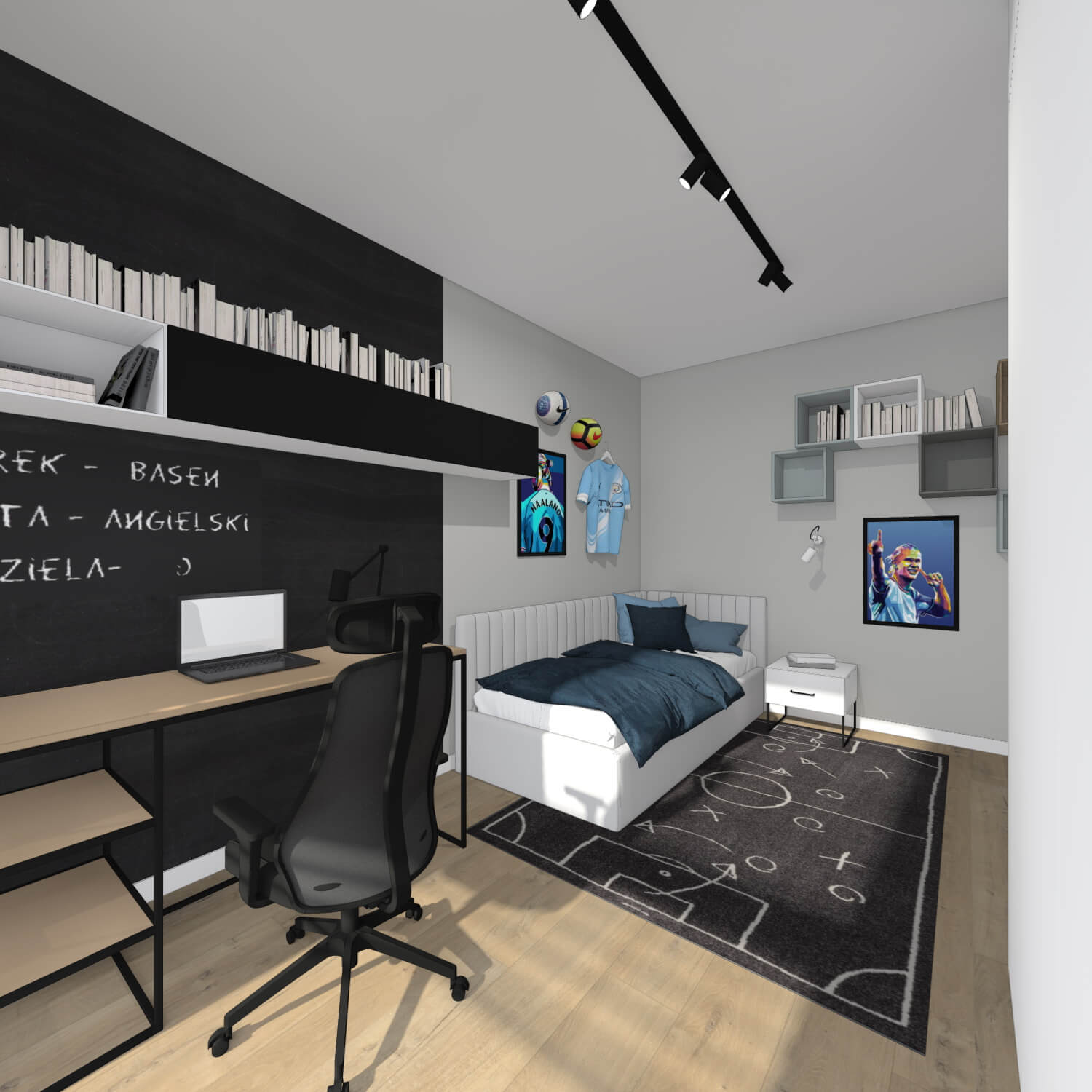 Kompleksowy projekt aranżacji wnętrza o powierzchni 99m2, który łączy nowoczesny design z industrialnymi akcentami. Realizacja objęła projekt salonu z aneksem kuchennym, pokoju dla syna oraz łazienki.
