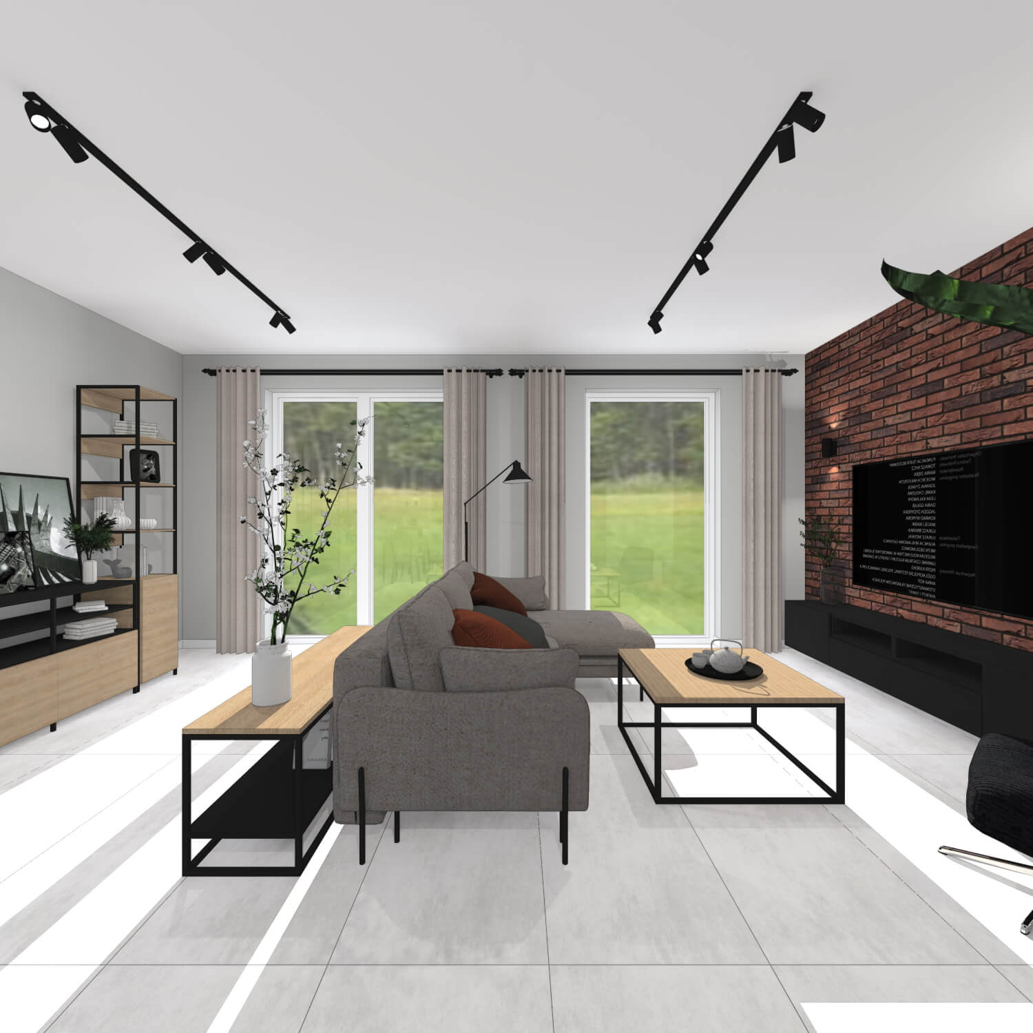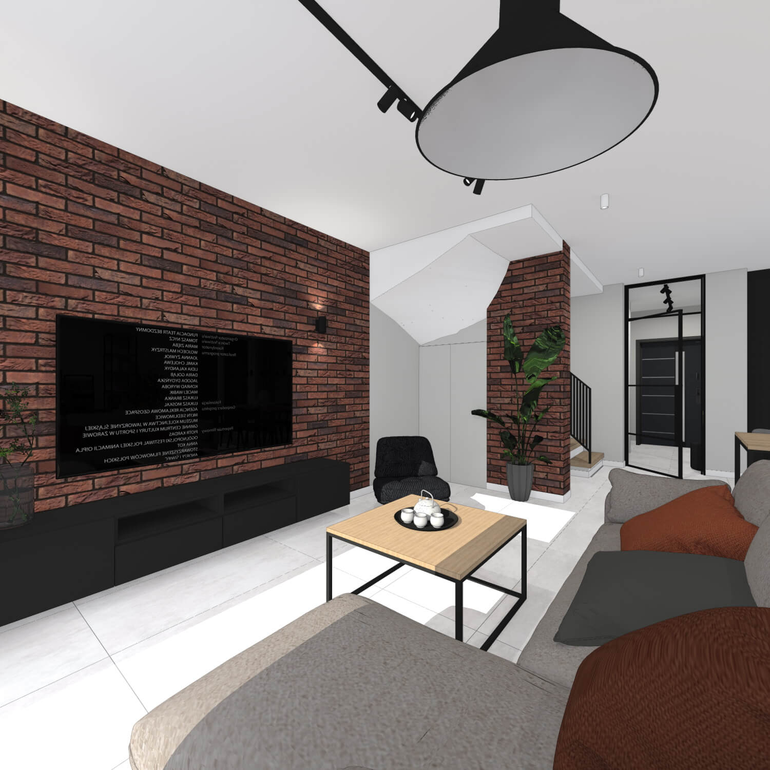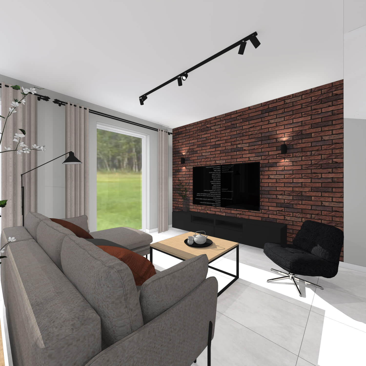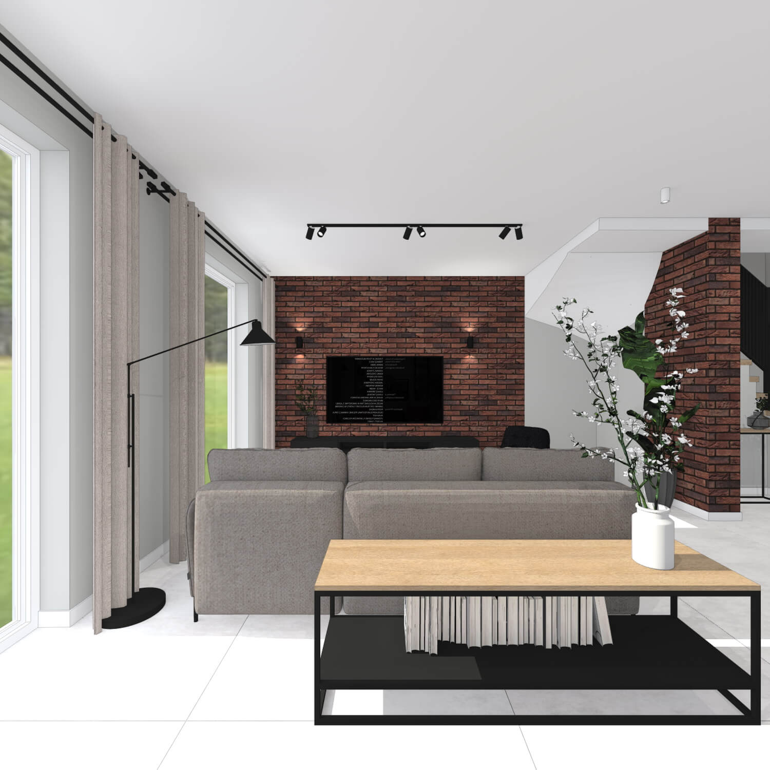 We wnętrzach dominują jasne kolory, przełamane czarnymi detalami, takimi jak lampy, ramy czy armatura, co nadaje przestrzeni wyrazisty charakter. W salonie wyróżnia się ściana z czerwonej cegły, a naturalne drewno w kuchni i na stolikach kawowych dodaje ciepła i przytulności.
