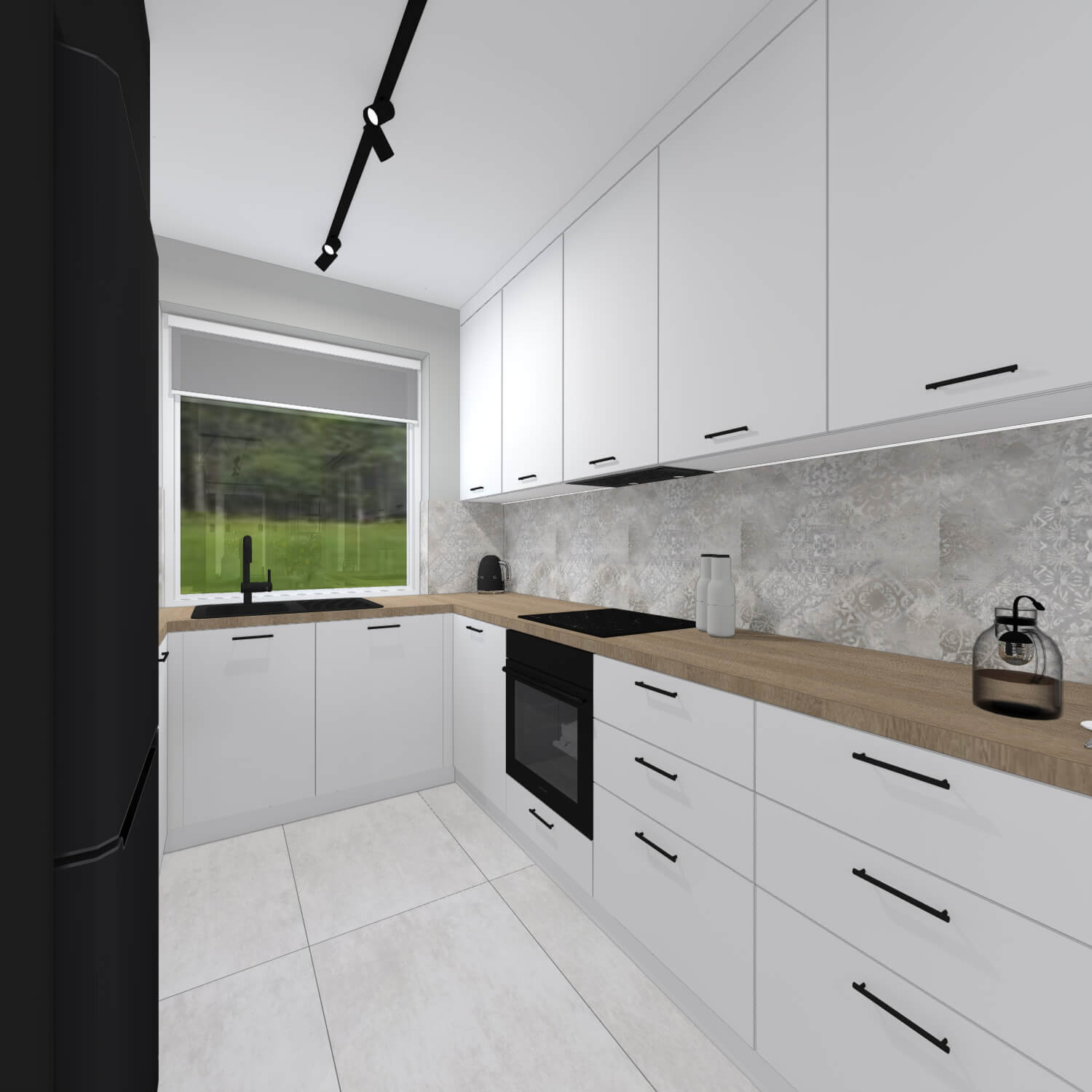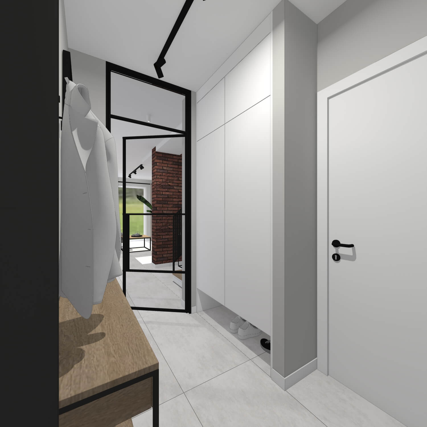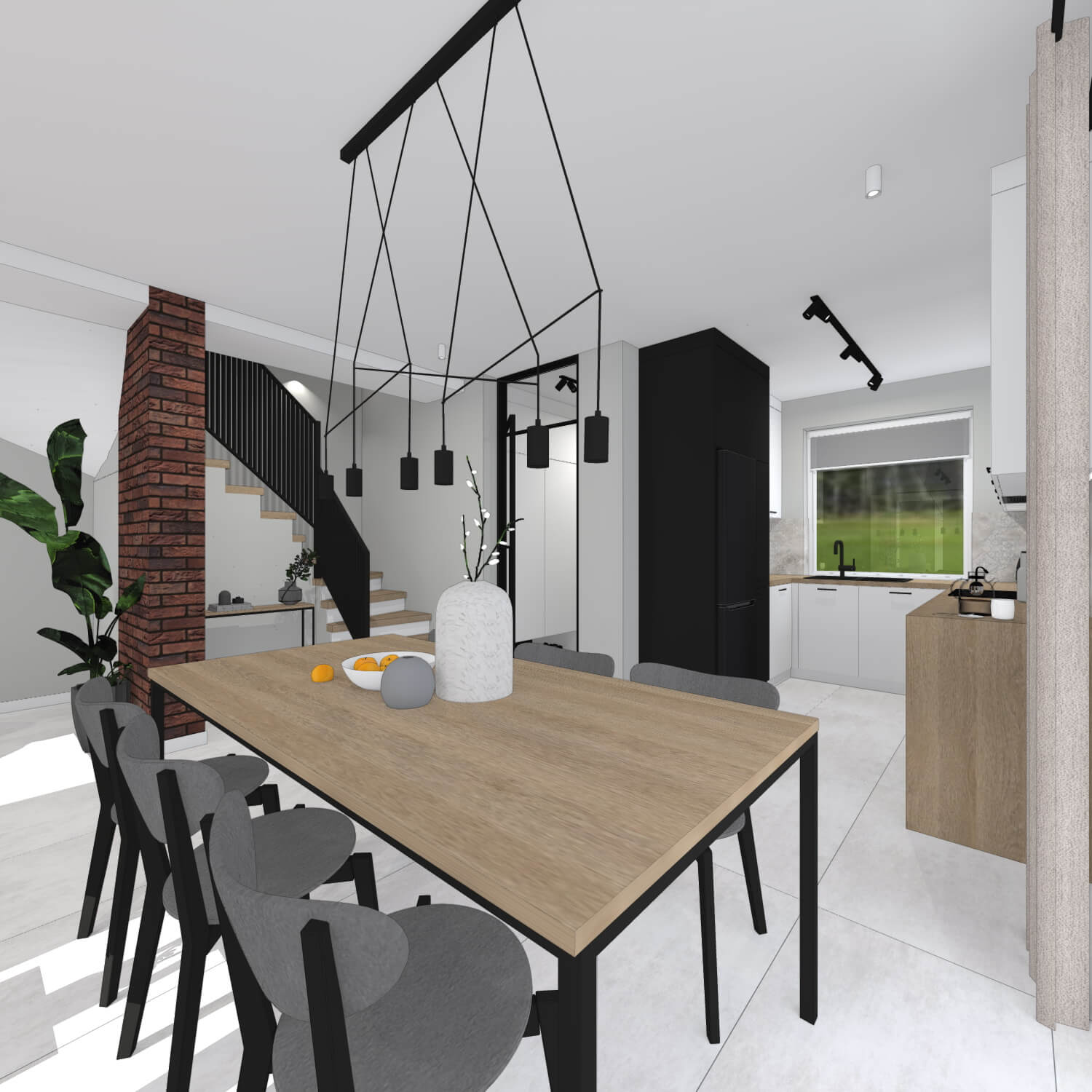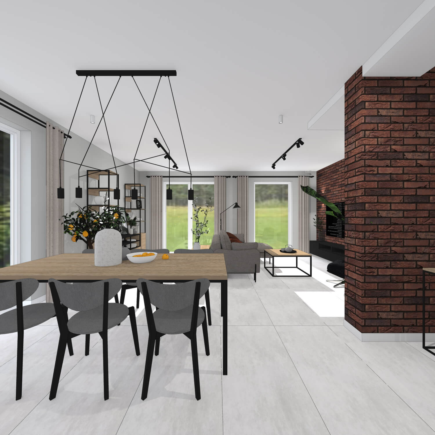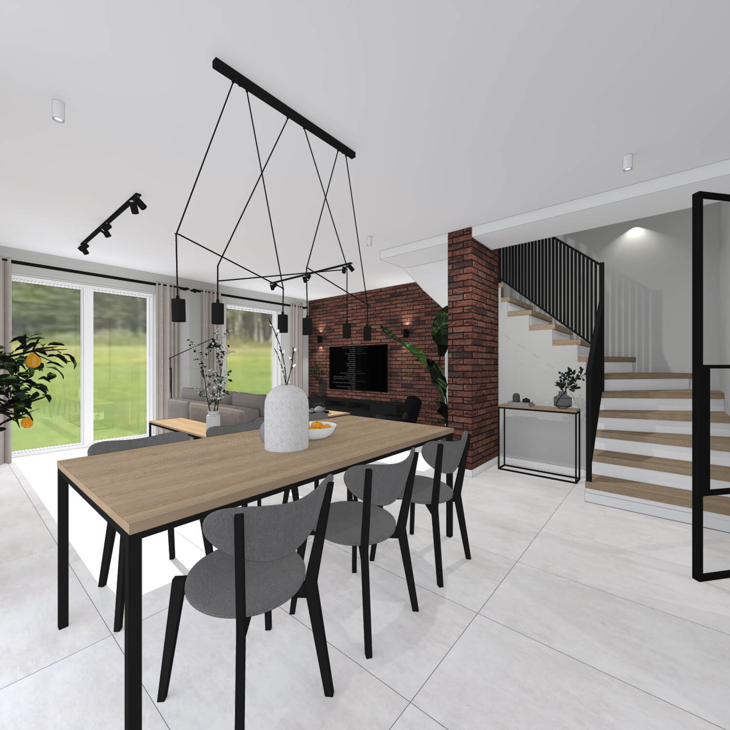 We wnętrzach dominują jasne kolory, przełamane czarnymi detalami, takimi jak lampy, ramy czy armatura, co nadaje przestrzeni wyrazisty charakter. W salonie wyróżnia się ściana z czerwonej cegły, a naturalne drewno w kuchni i na stolikach kawowych dodaje ciepła i przytulności.