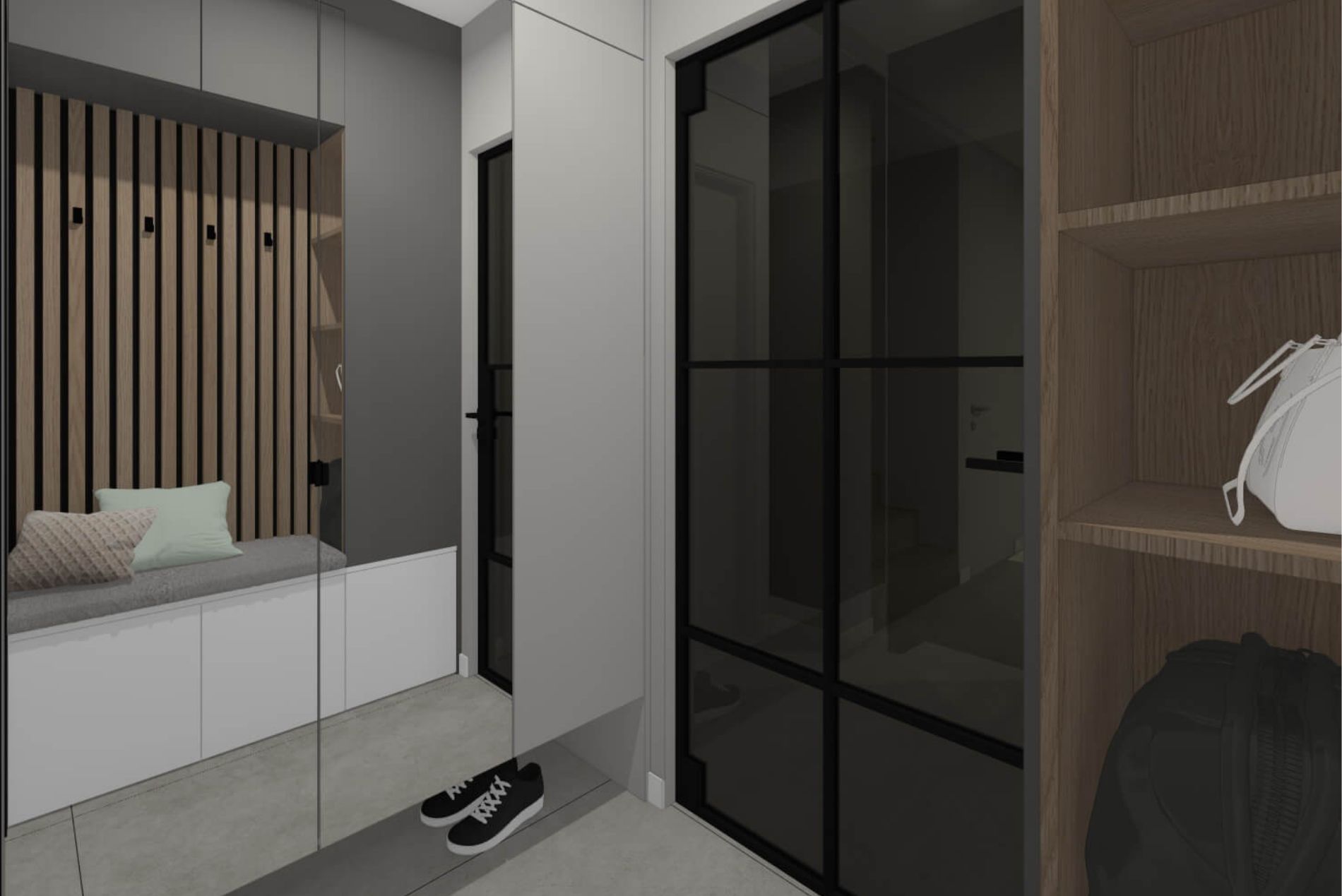 Kompleksowy projekt domu w Gruszczynie o powierzchni 110m2, który obejmował aranżację salonu z aneksem kuchennym oraz dwóch łazienek.