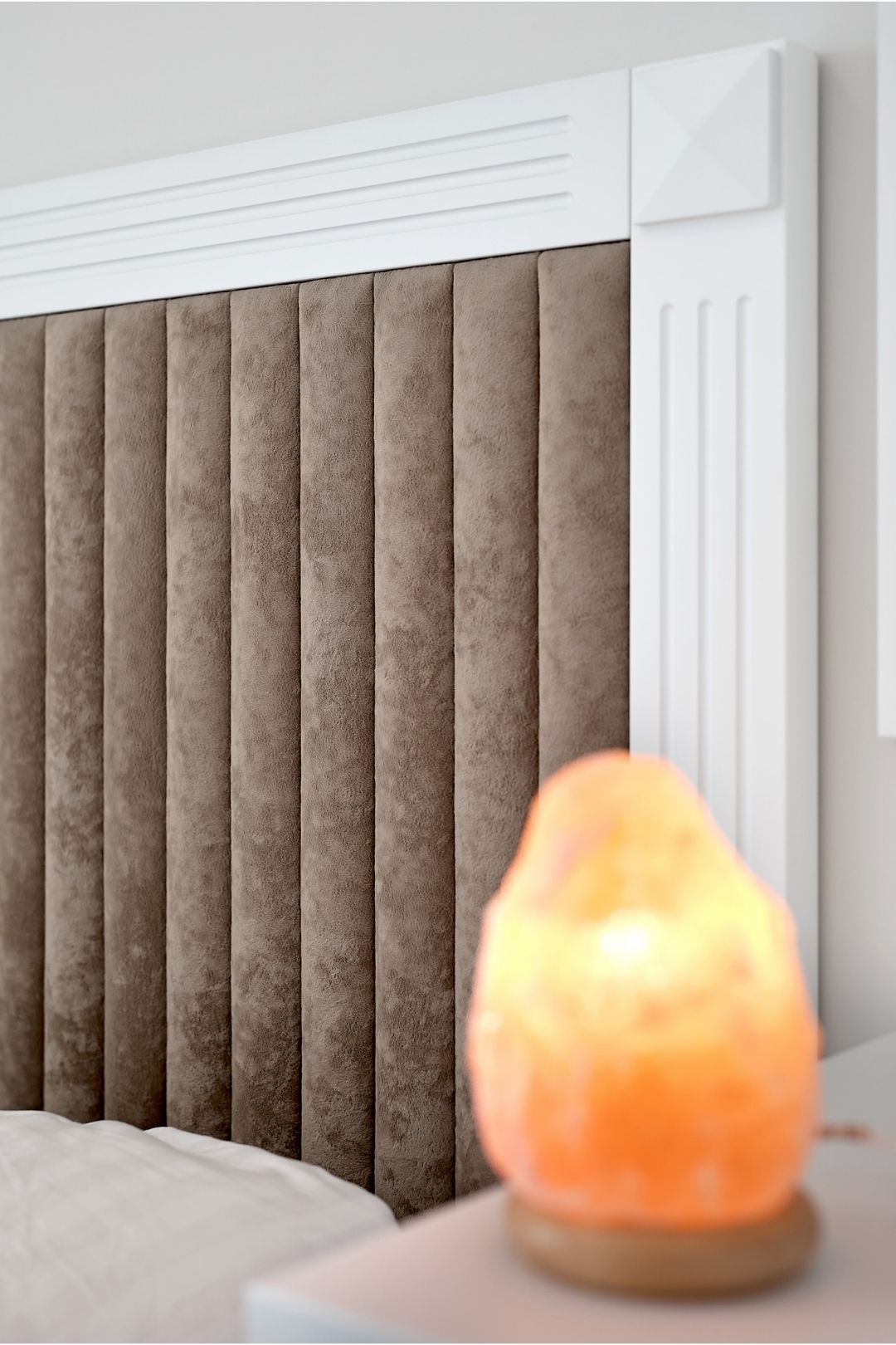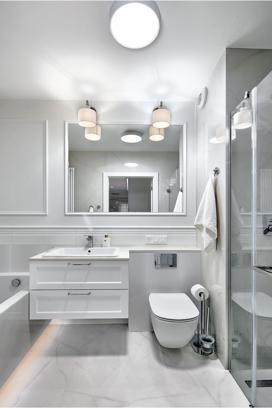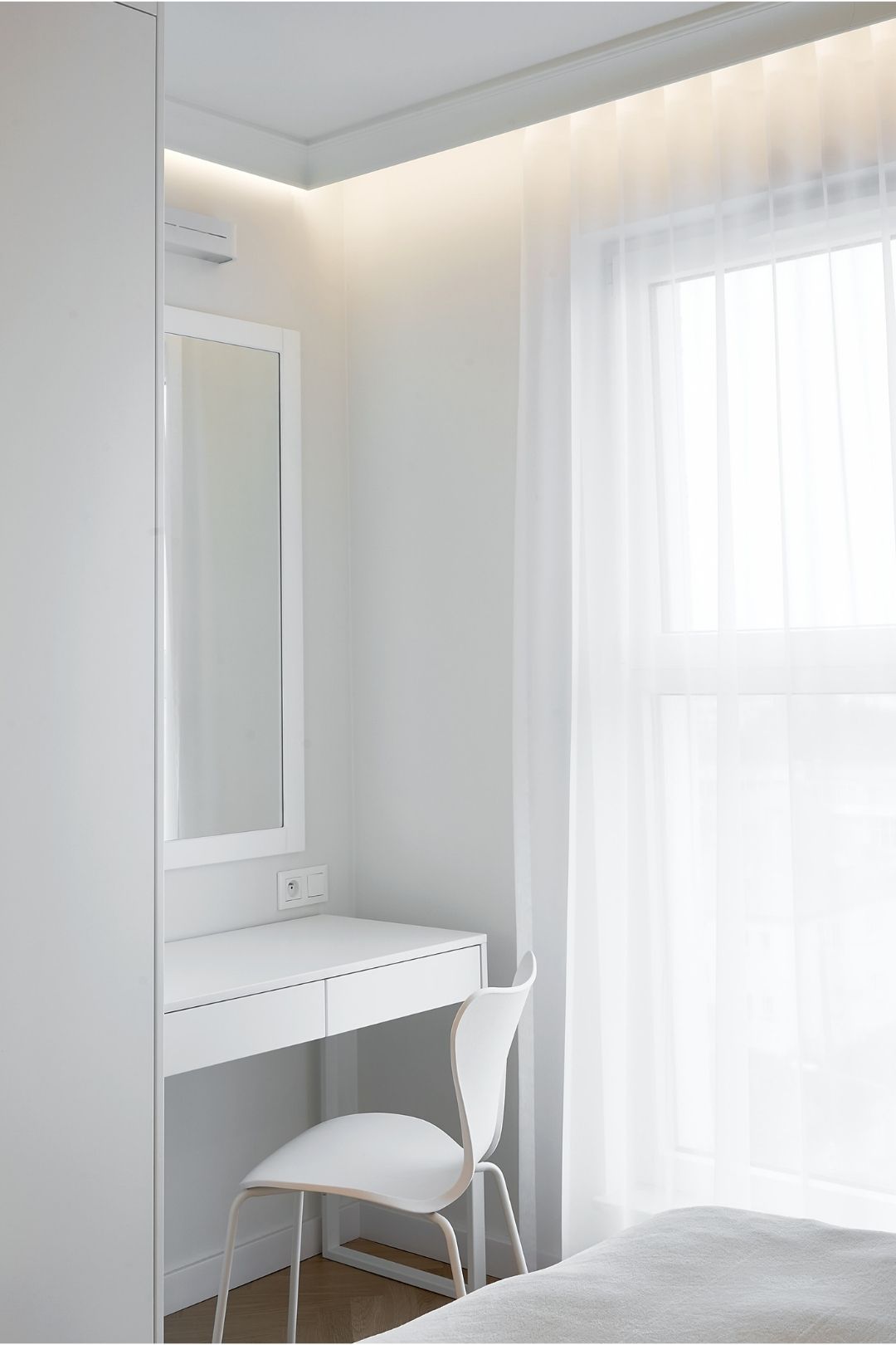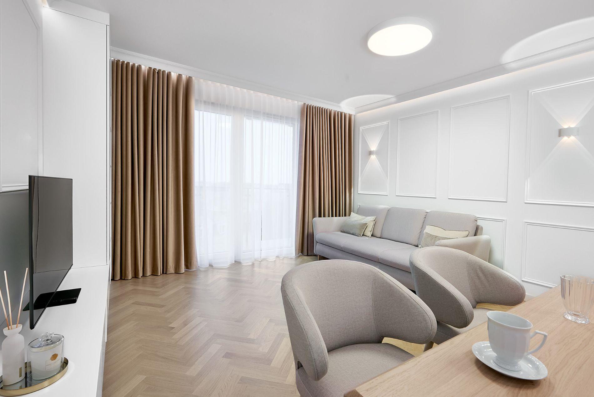 Wnętrza utrzymano w spójnej, jasnej kolorystyce opartej na odcieniach bieli, szarości i naturalnego drewna. Delikatne, sztukateryjne akcenty na ścianach oraz subtelne oświetlenie budują atmosferę lekkości i przestronności, a starannie dobrane materiały, takie jak drewniana podłoga ułożona w jodełkę czy marmurowy wzór w łazienkach, podkreślają wysoką jakość wykończenia. Projekt obejmował aranżację salonu z aneksem kuchennym, łazienek, gabinetu oraz korytarza.