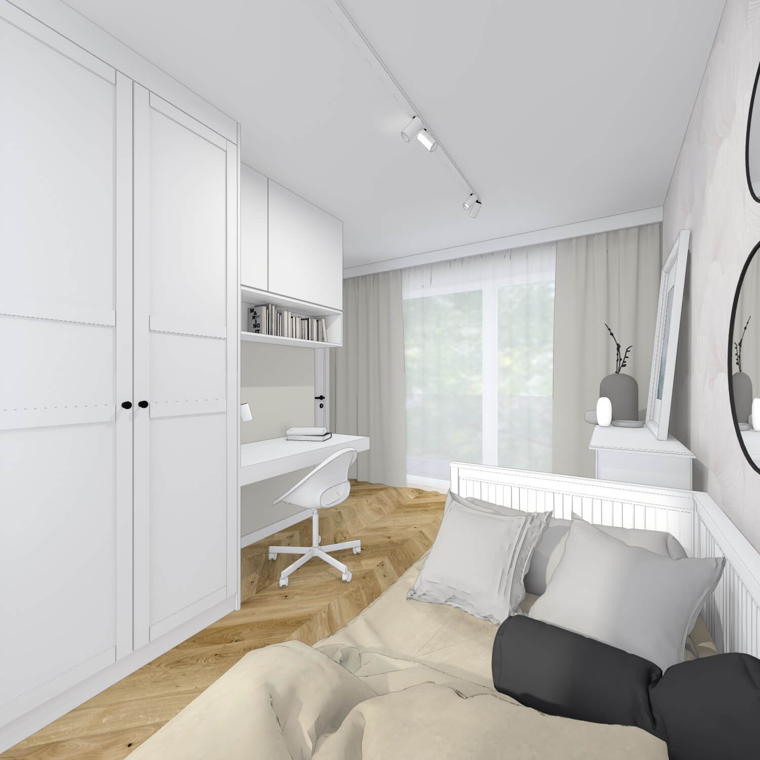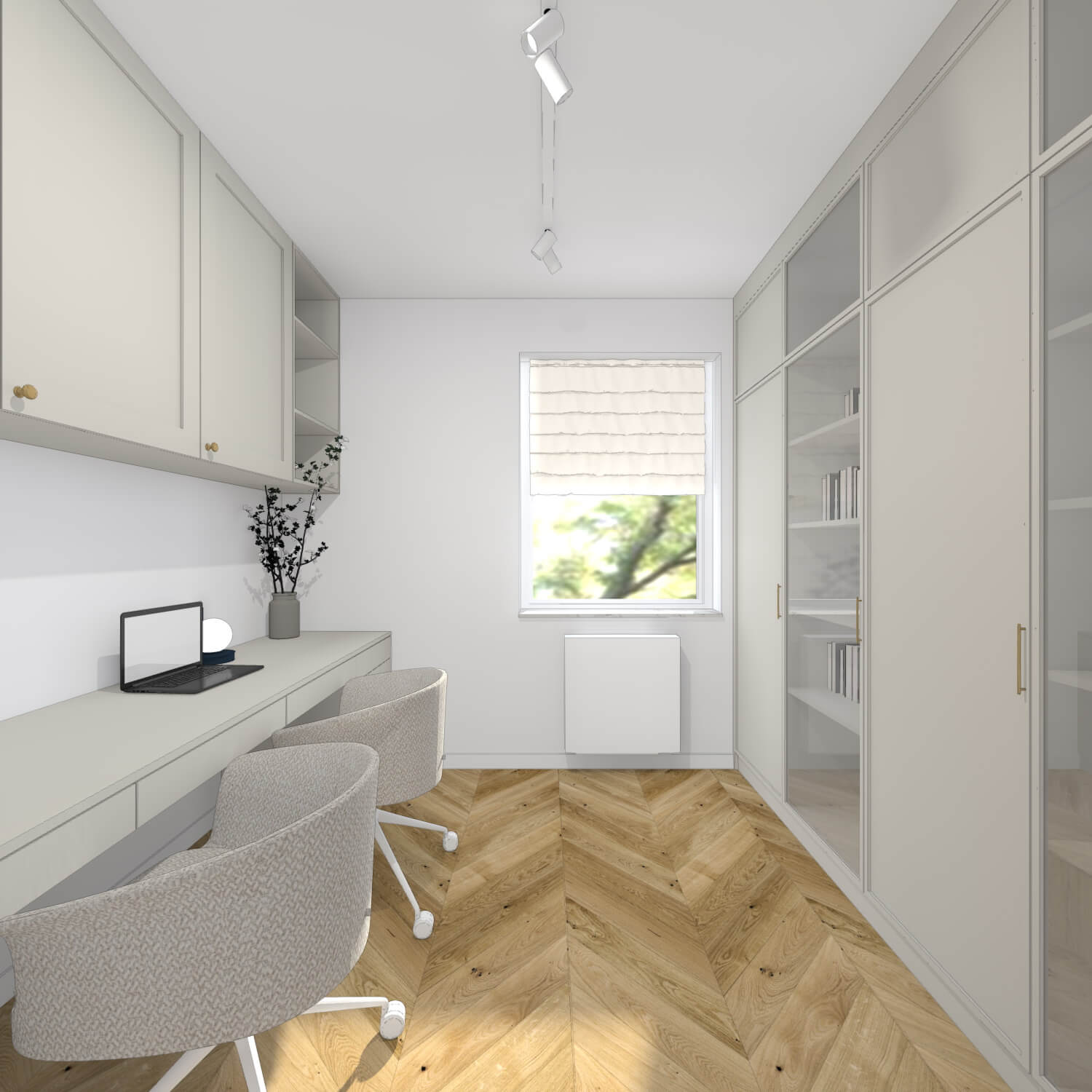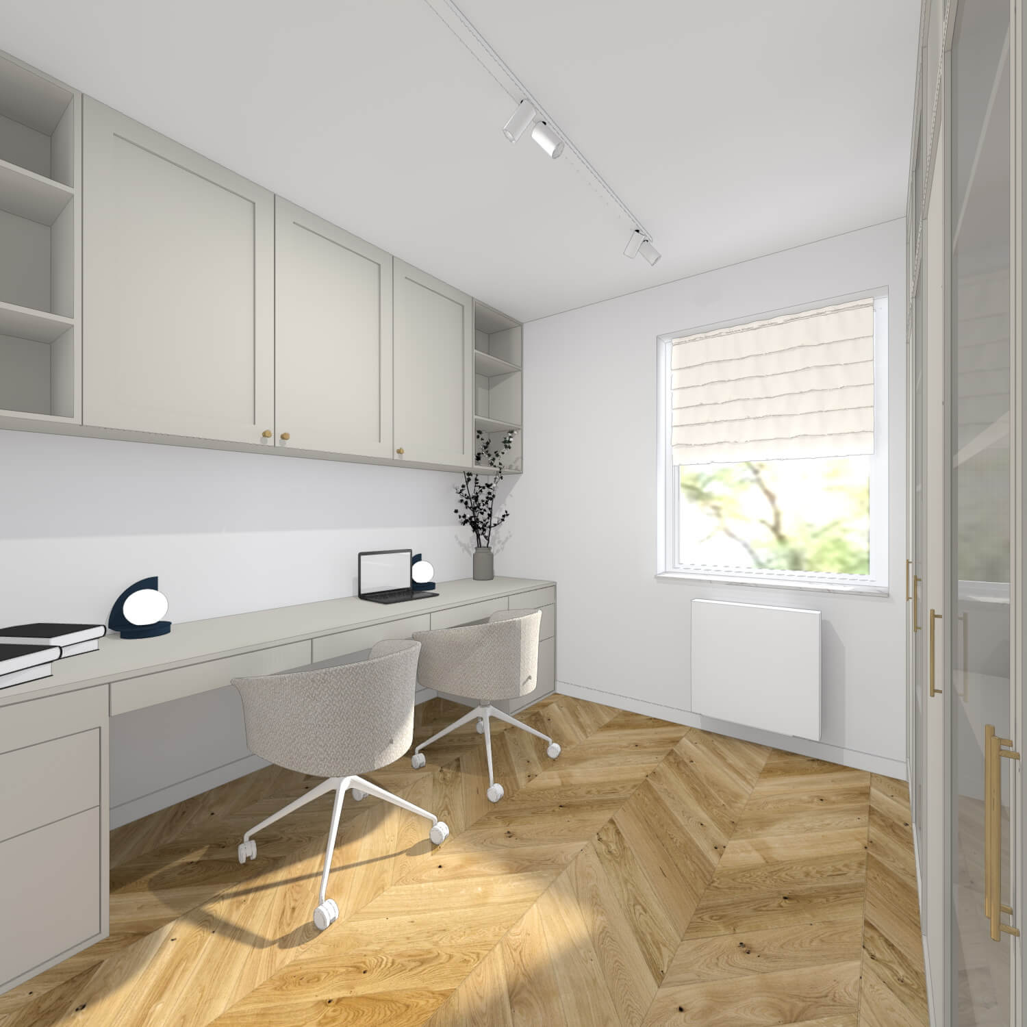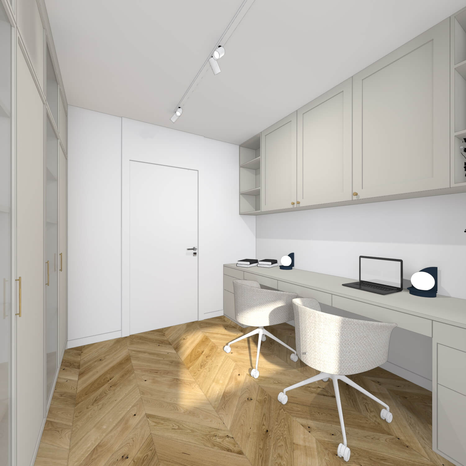 Kompleksowy projekt aranżacji wnętrza o powierzchni 85m2, obejmujący salon z aneksem kuchennym, dwie sypialnie, gabinet, łazienkę oraz toaletę.