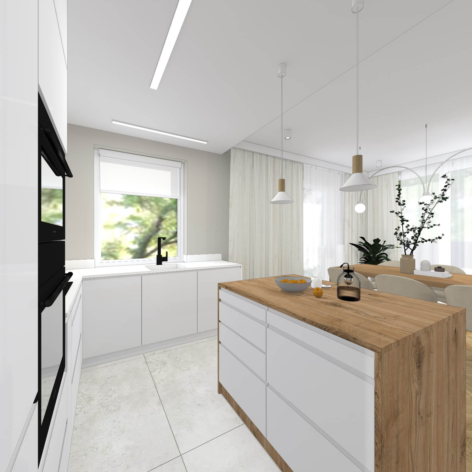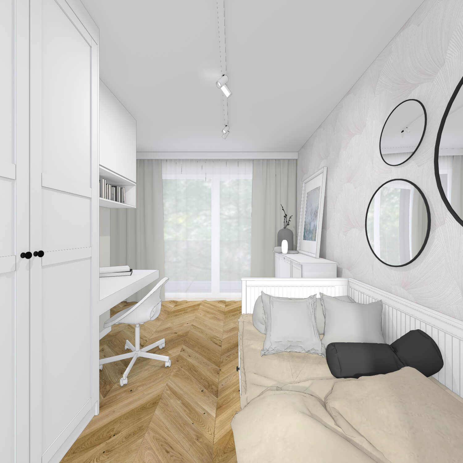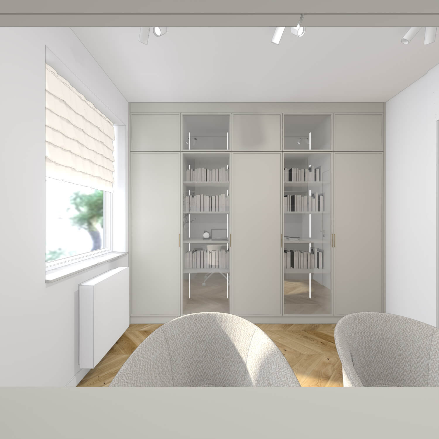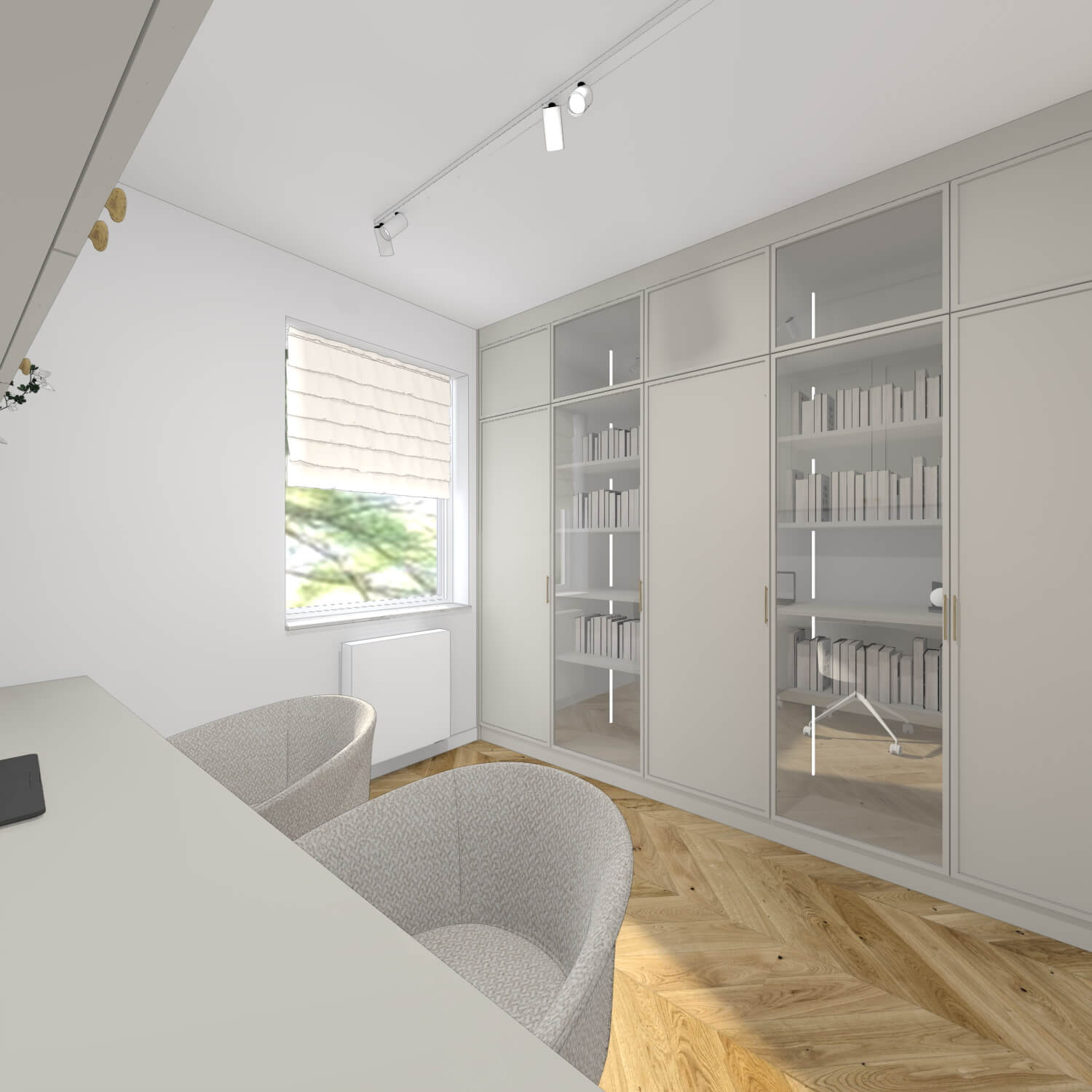 Kompleksowy projekt aranżacji wnętrza o powierzchni 85m2, obejmujący salon z aneksem kuchennym, dwie sypialnie, gabinet, łazienkę oraz toaletę.