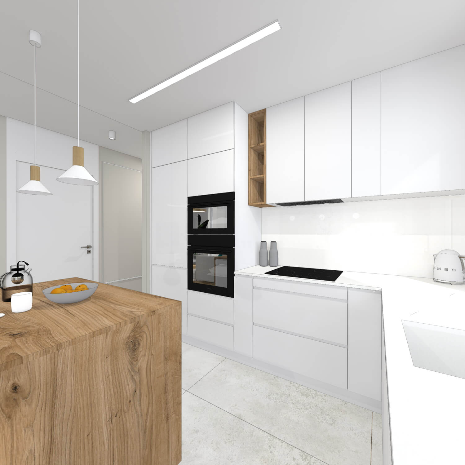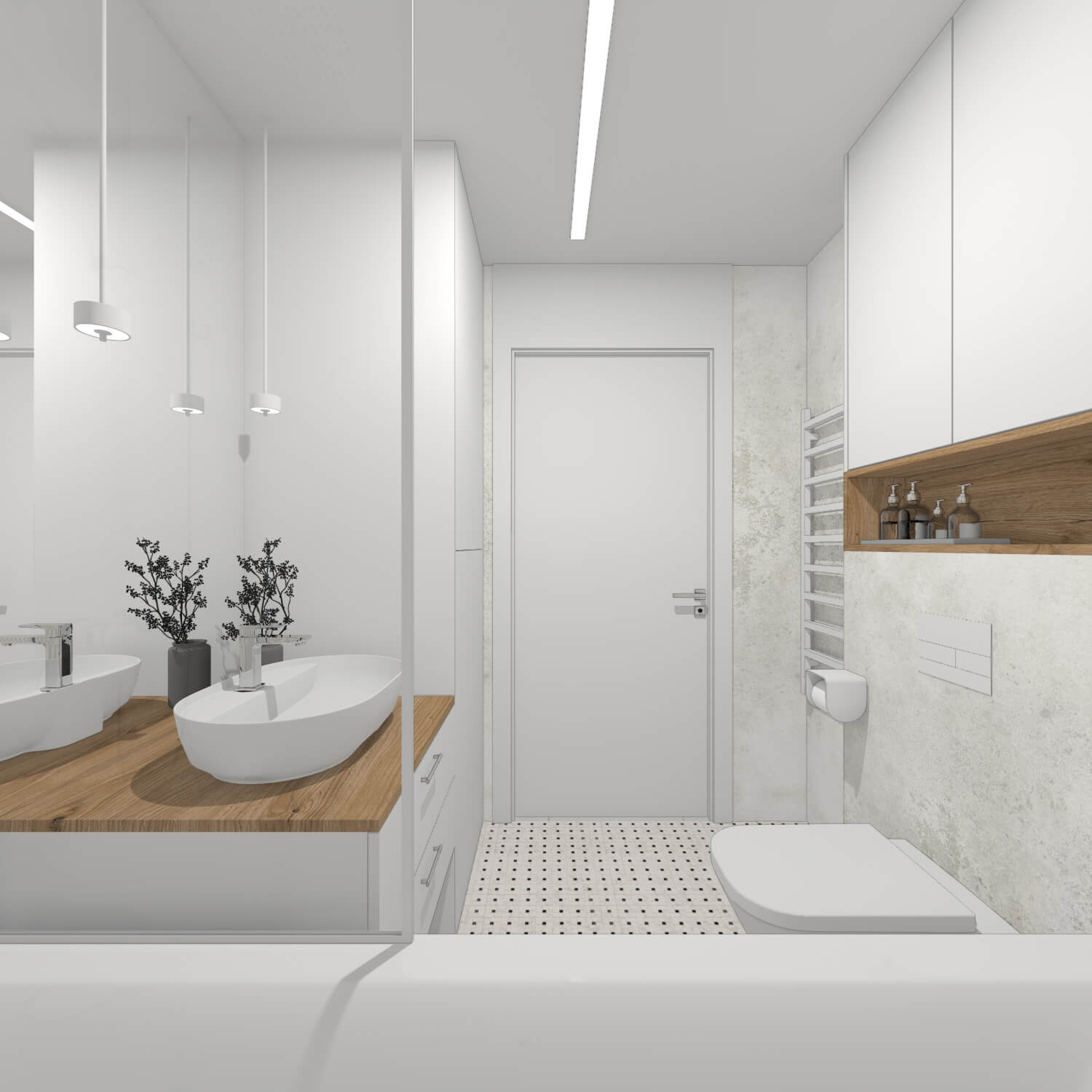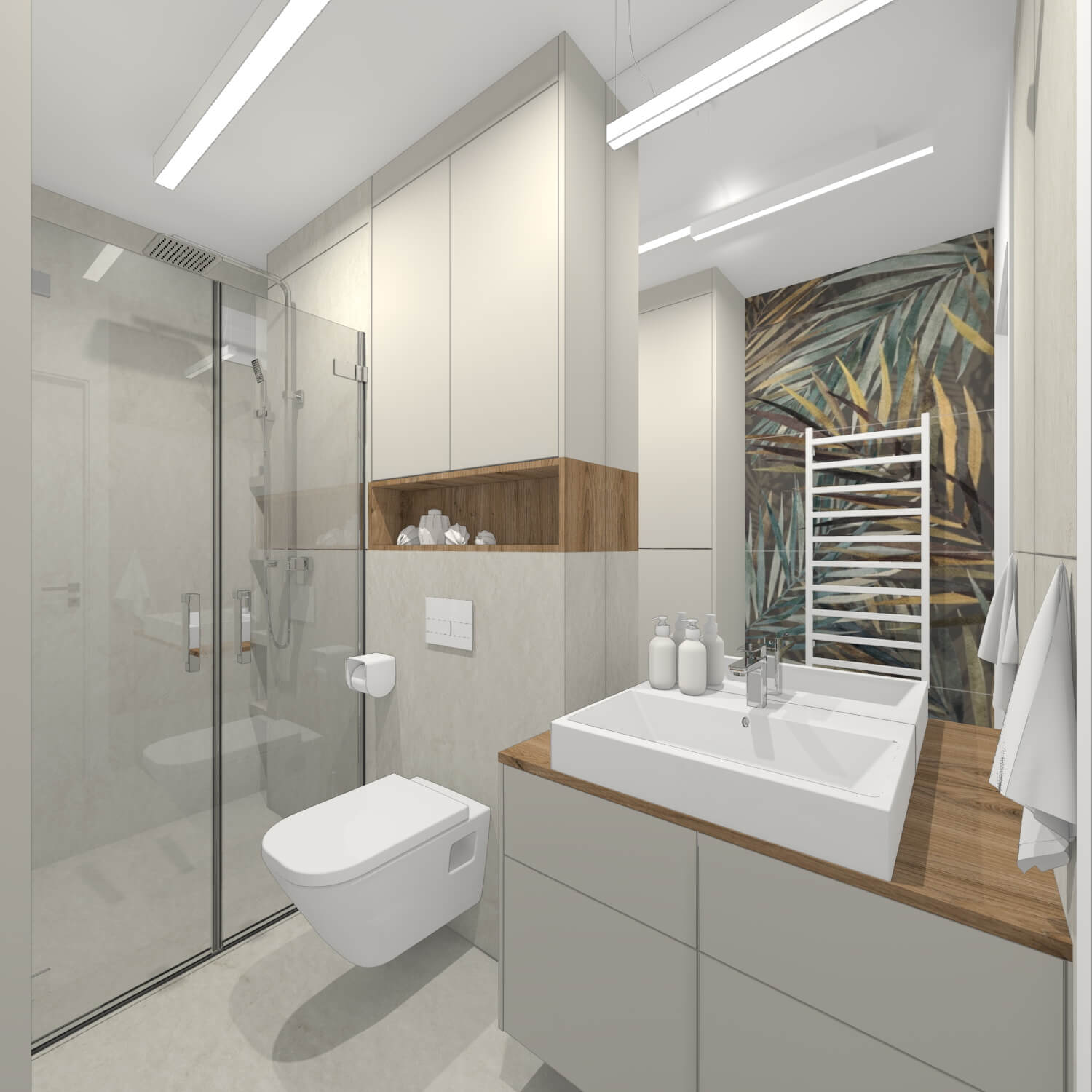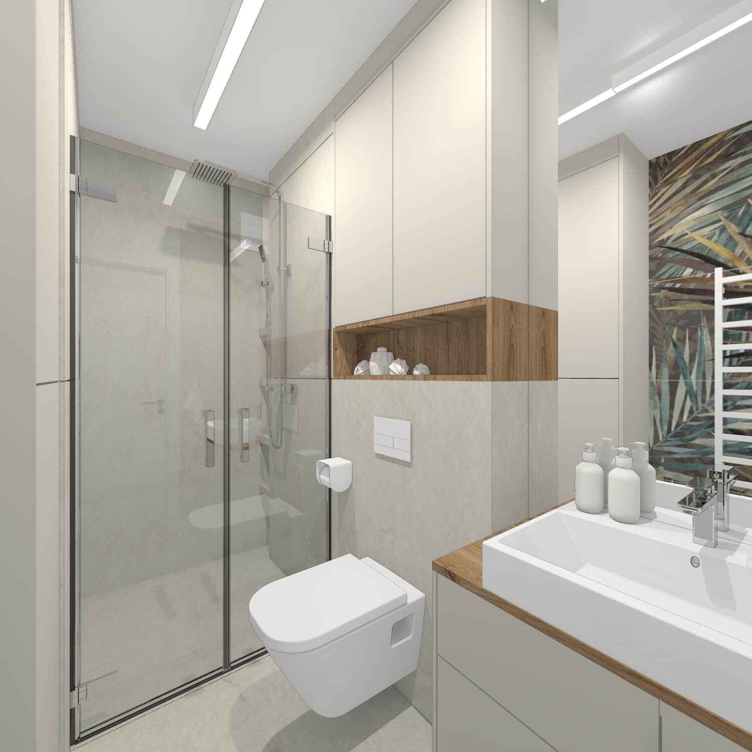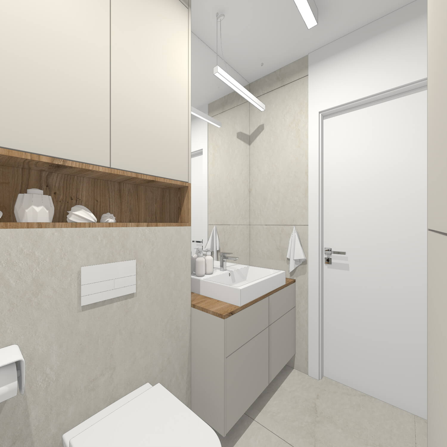 Kompleksowy projekt aranżacji wnętrza o powierzchni 85m2, obejmujący salon z aneksem kuchennym, dwie sypialnie, gabinet, łazienkę oraz toaletę.