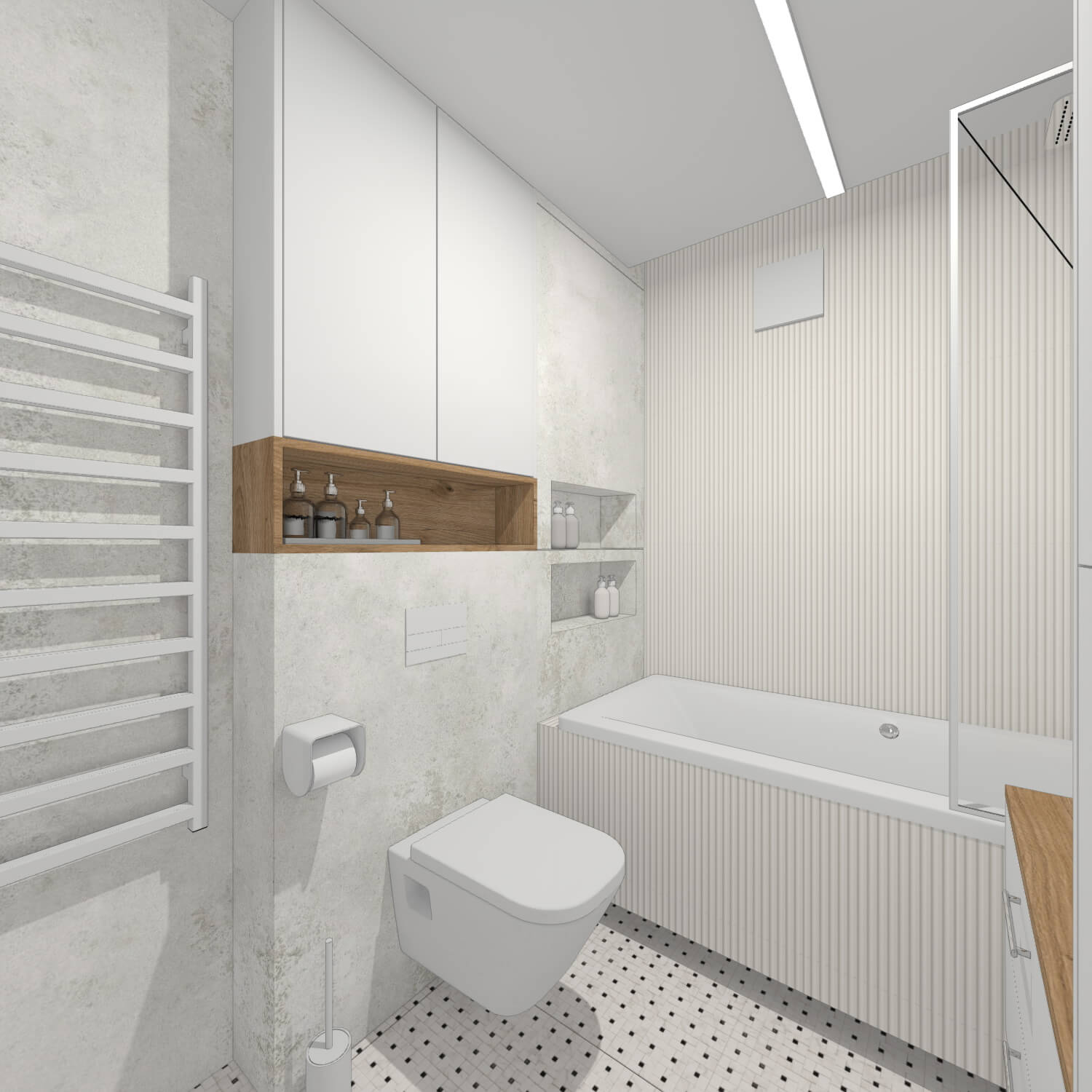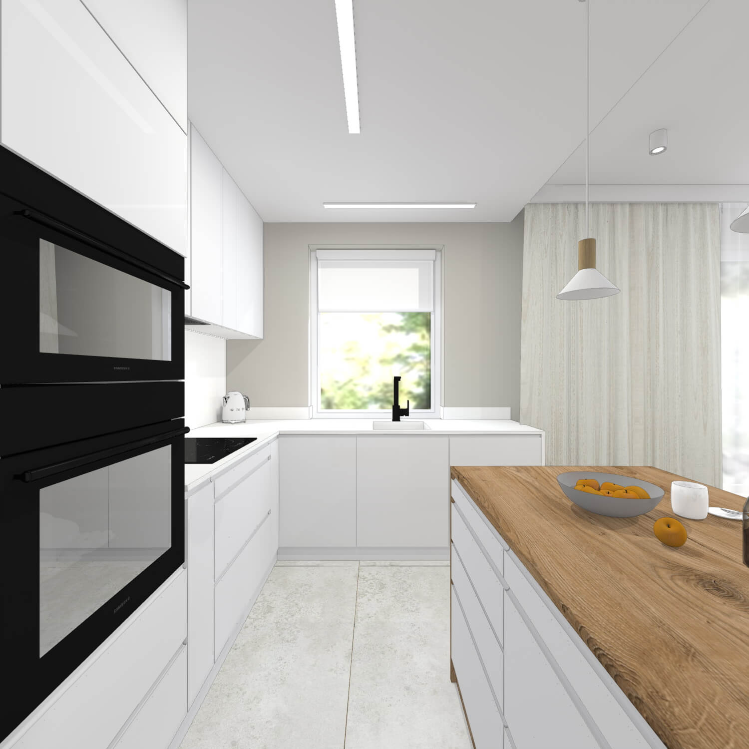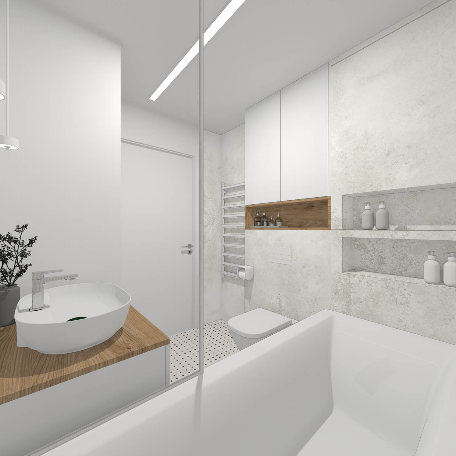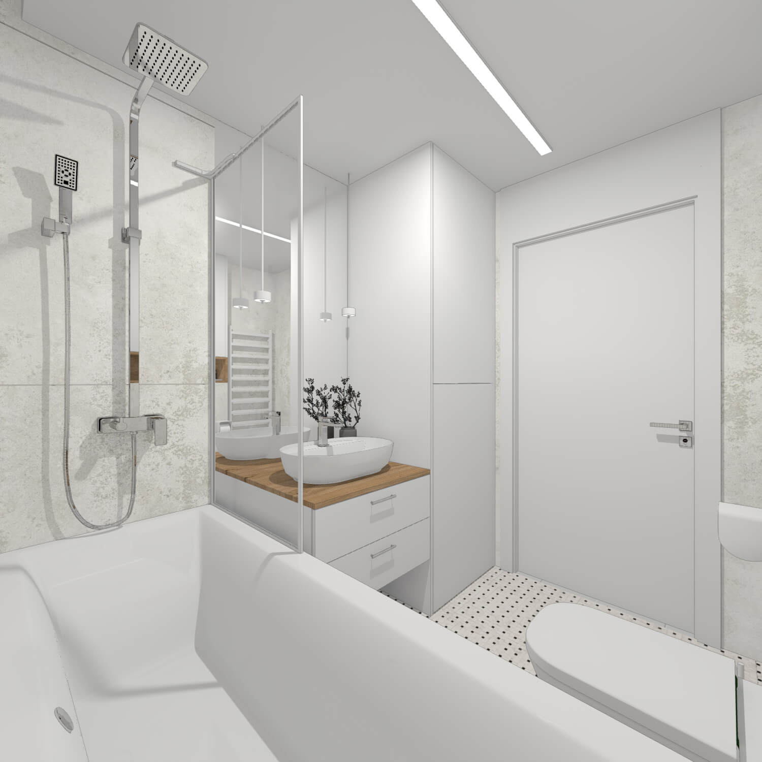 Kompleksowy projekt aranżacji wnętrza o powierzchni 85m2, obejmujący salon z aneksem kuchennym, dwie sypialnie, gabinet, łazienkę oraz toaletę.