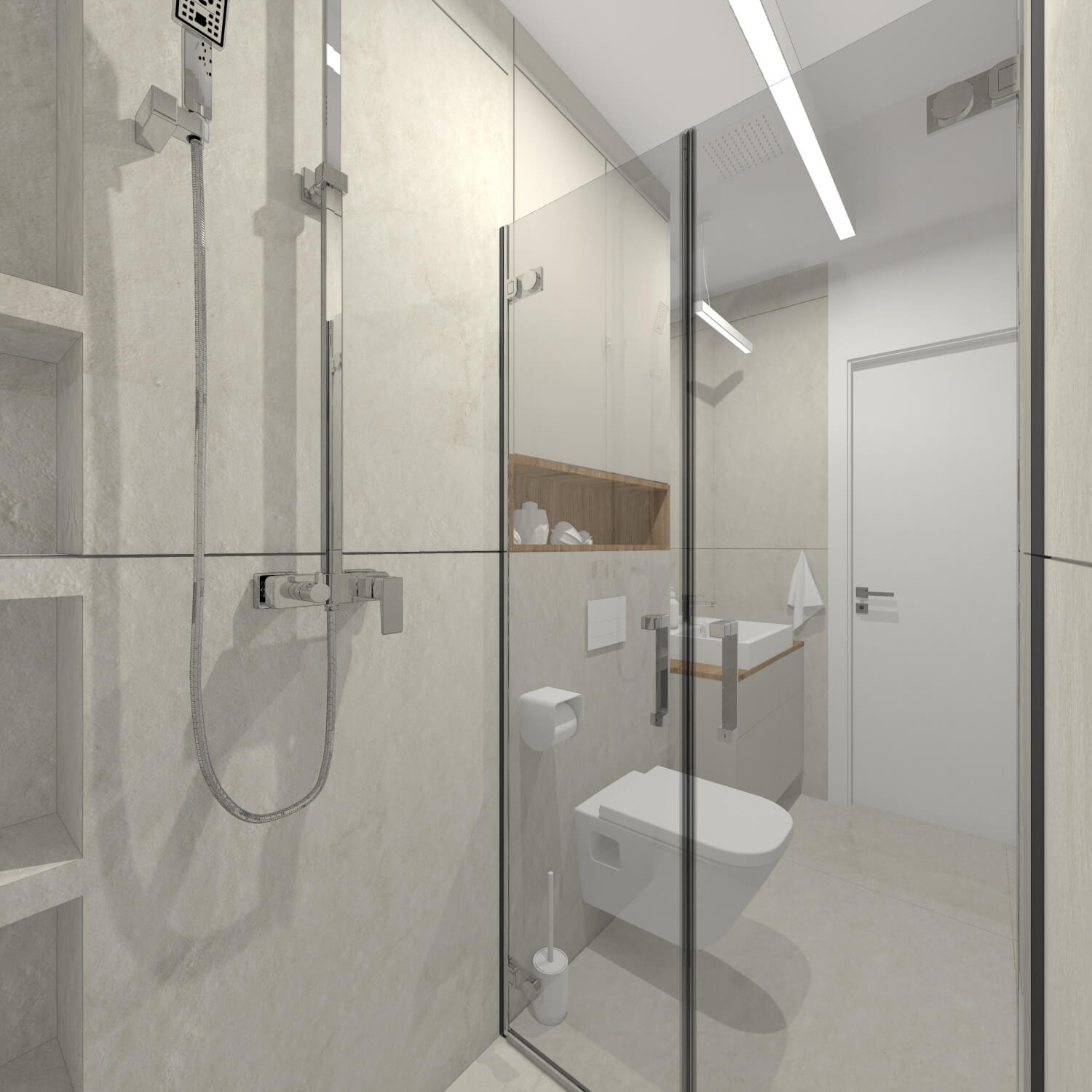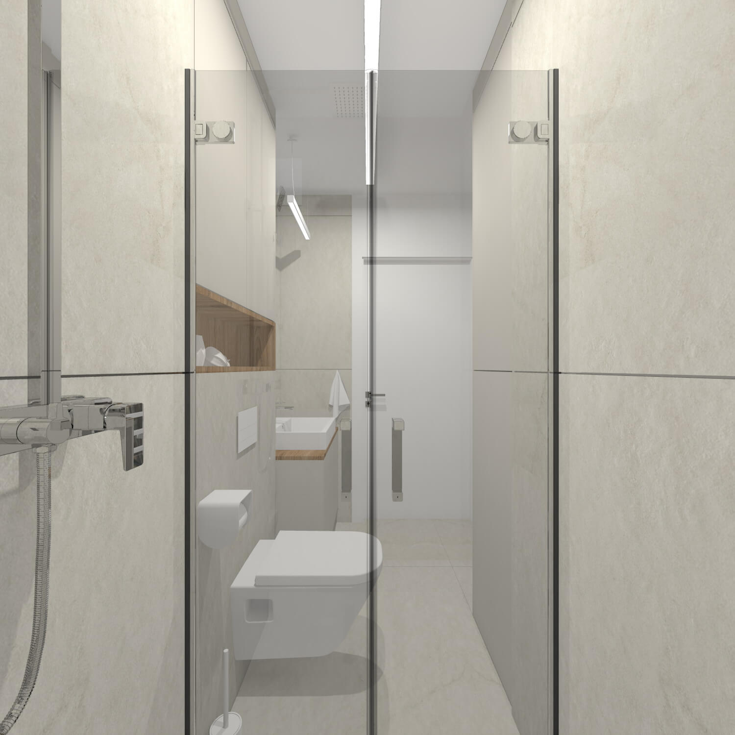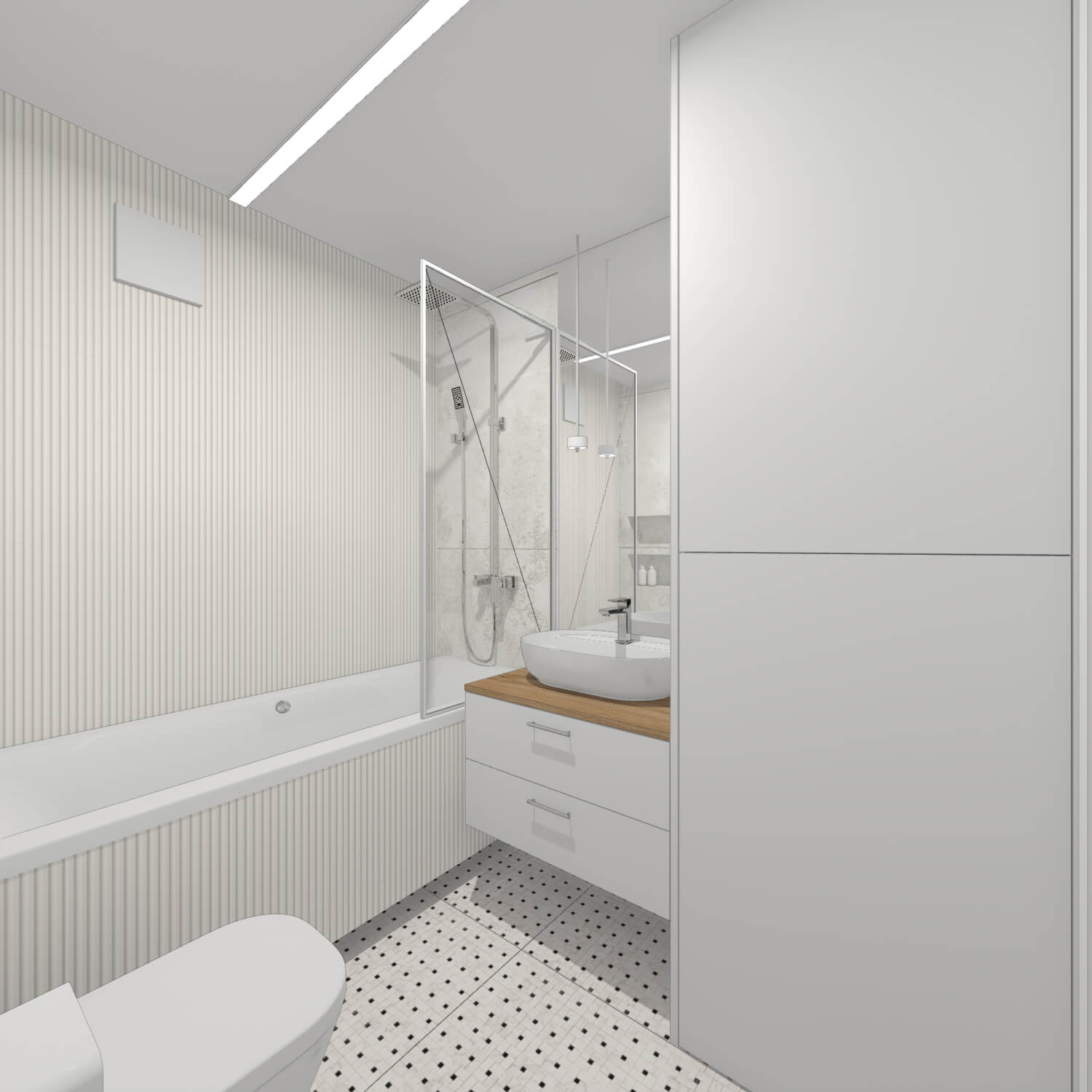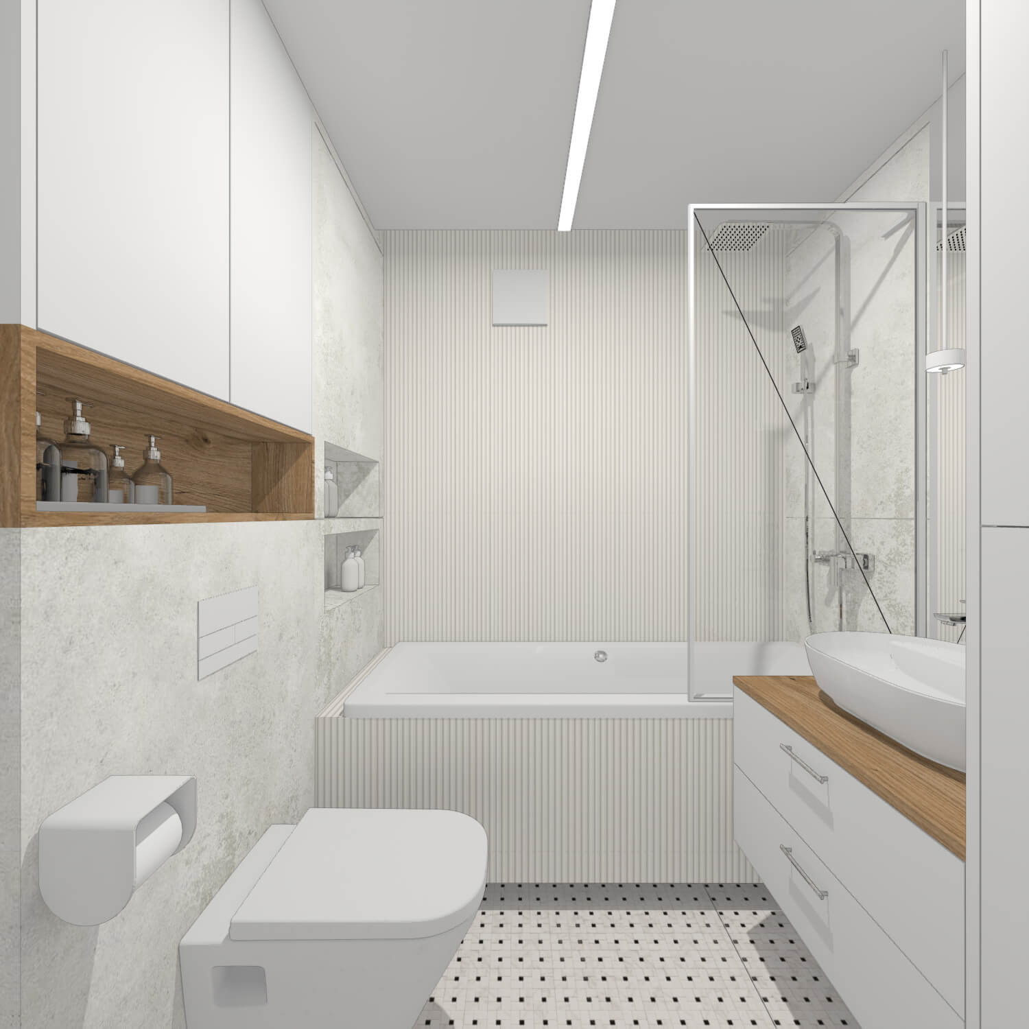 Kompleksowy projekt aranżacji wnętrza o powierzchni 85m2, obejmujący salon z aneksem kuchennym, dwie sypialnie, gabinet, łazienkę oraz toaletę.