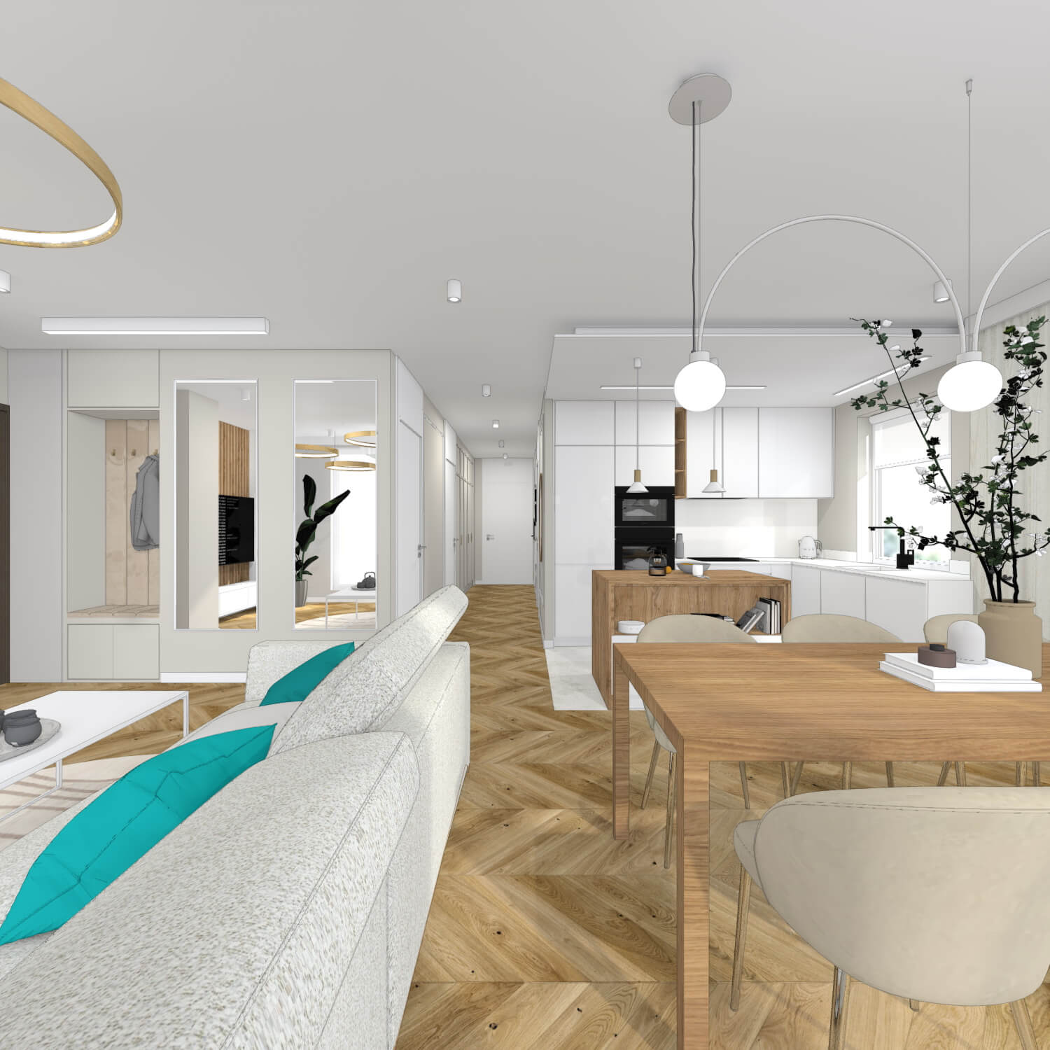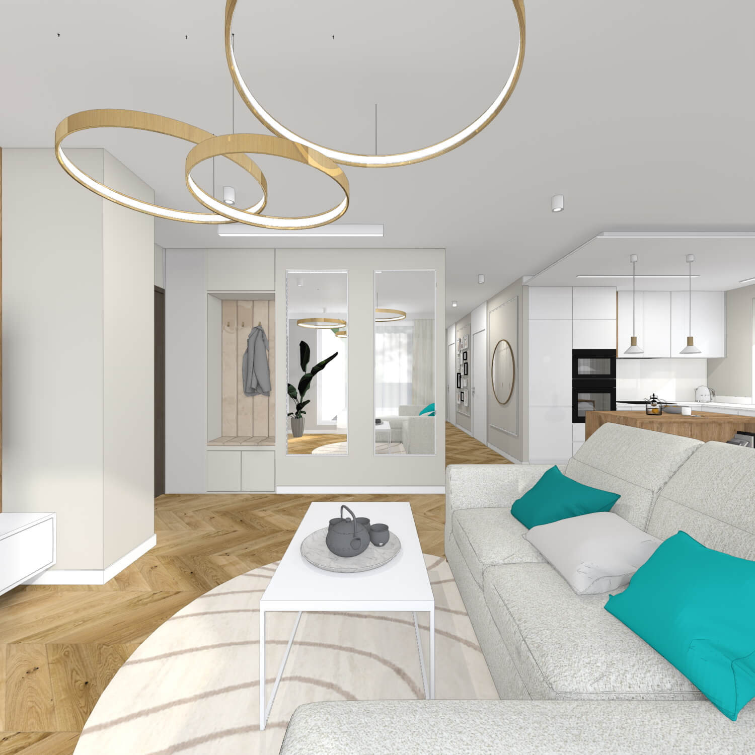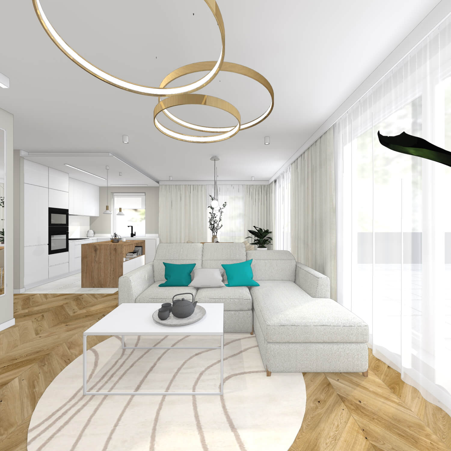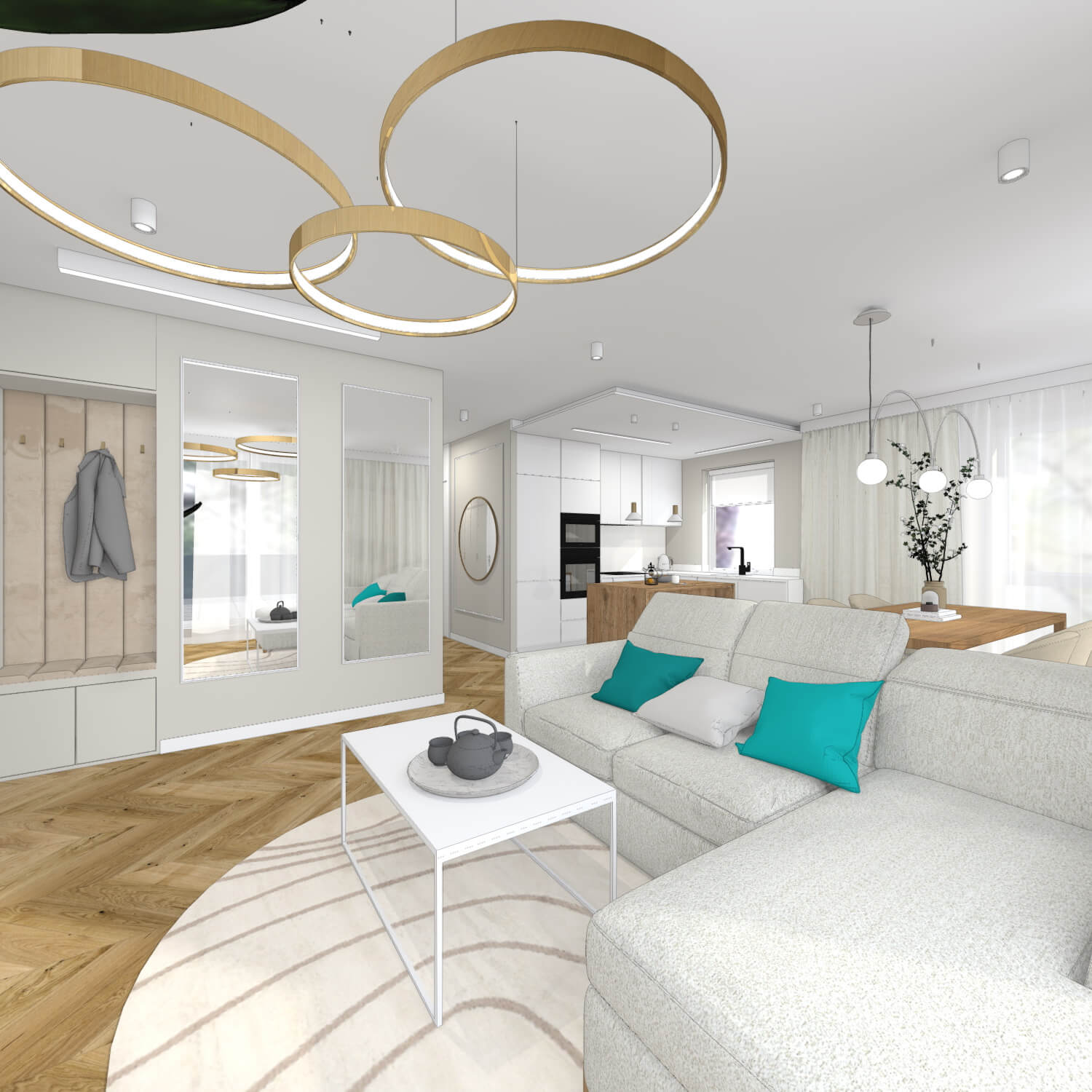 Wnętrze zachwyca elegancją i spójnością, łącząc minimalistyczną formę z luksusowymi detalami. Jasna i przestronna przestrzeń bazuje na ponadczasowej palecie bieli i beżu, która w połączeniu z drewnianą podłogą w jodełkę tworzy harmonijne tło. Charakterystycznym elementem projektu są złote akcenty w oświetleniu i uchwytach, które dodają wnętrzu szlachetności. Całość ożywiają energetyczne turkusowe dodatki, nadając pomieszczeniom wyrazistości i świeżości. Projekt idealnie łączy estetykę z funkcjonalnością, oferując przestrzeń na miarę nowoczesnego stylu życia.