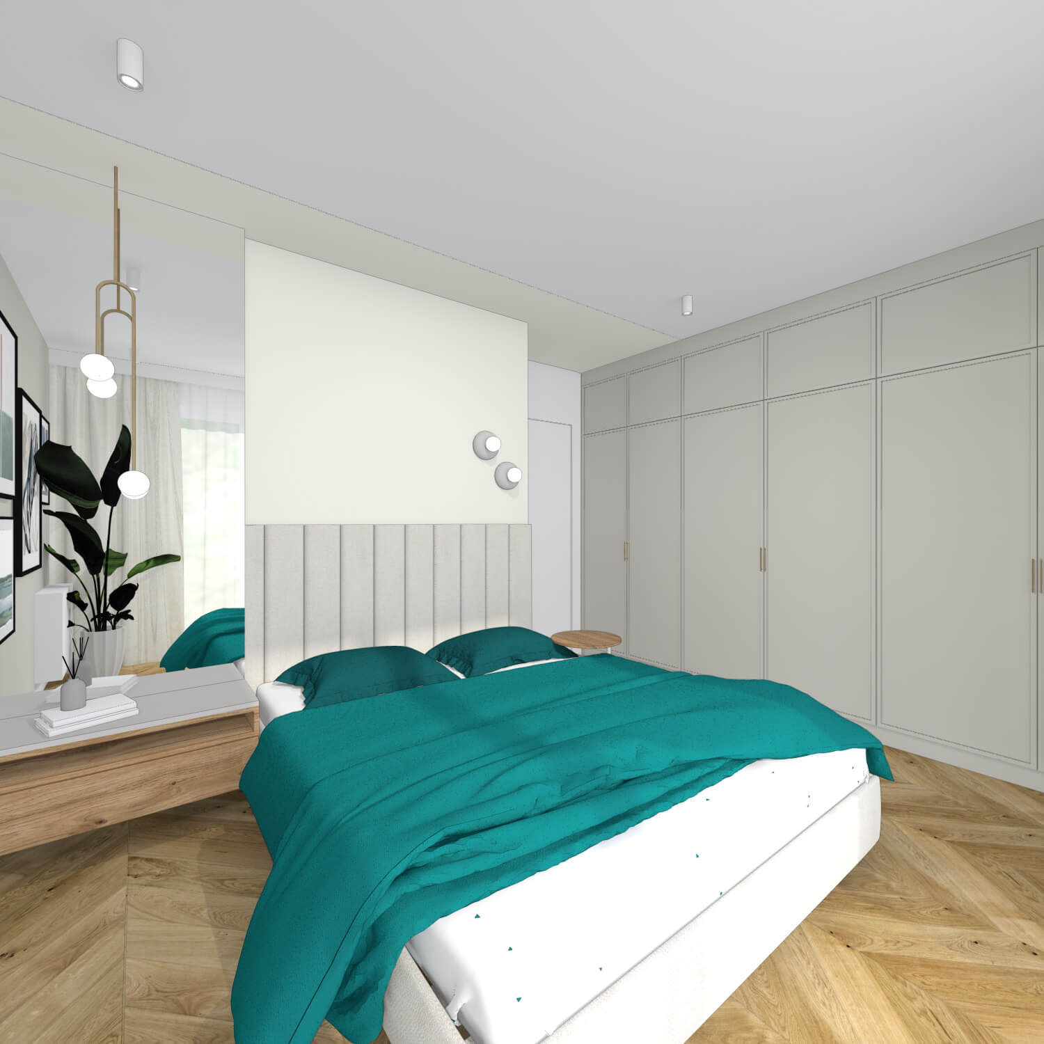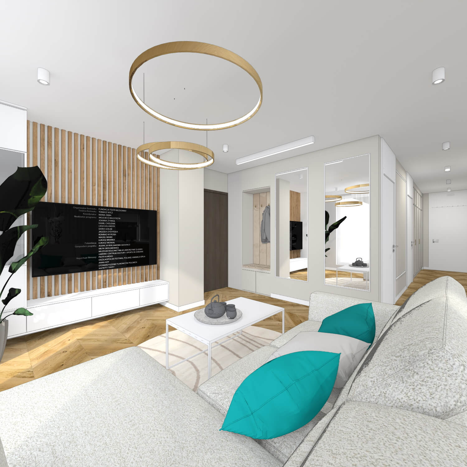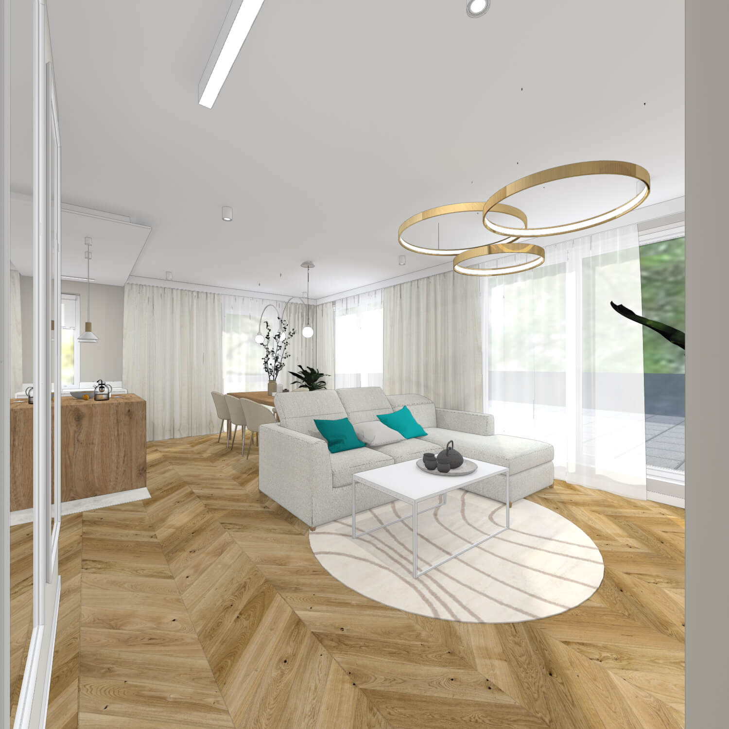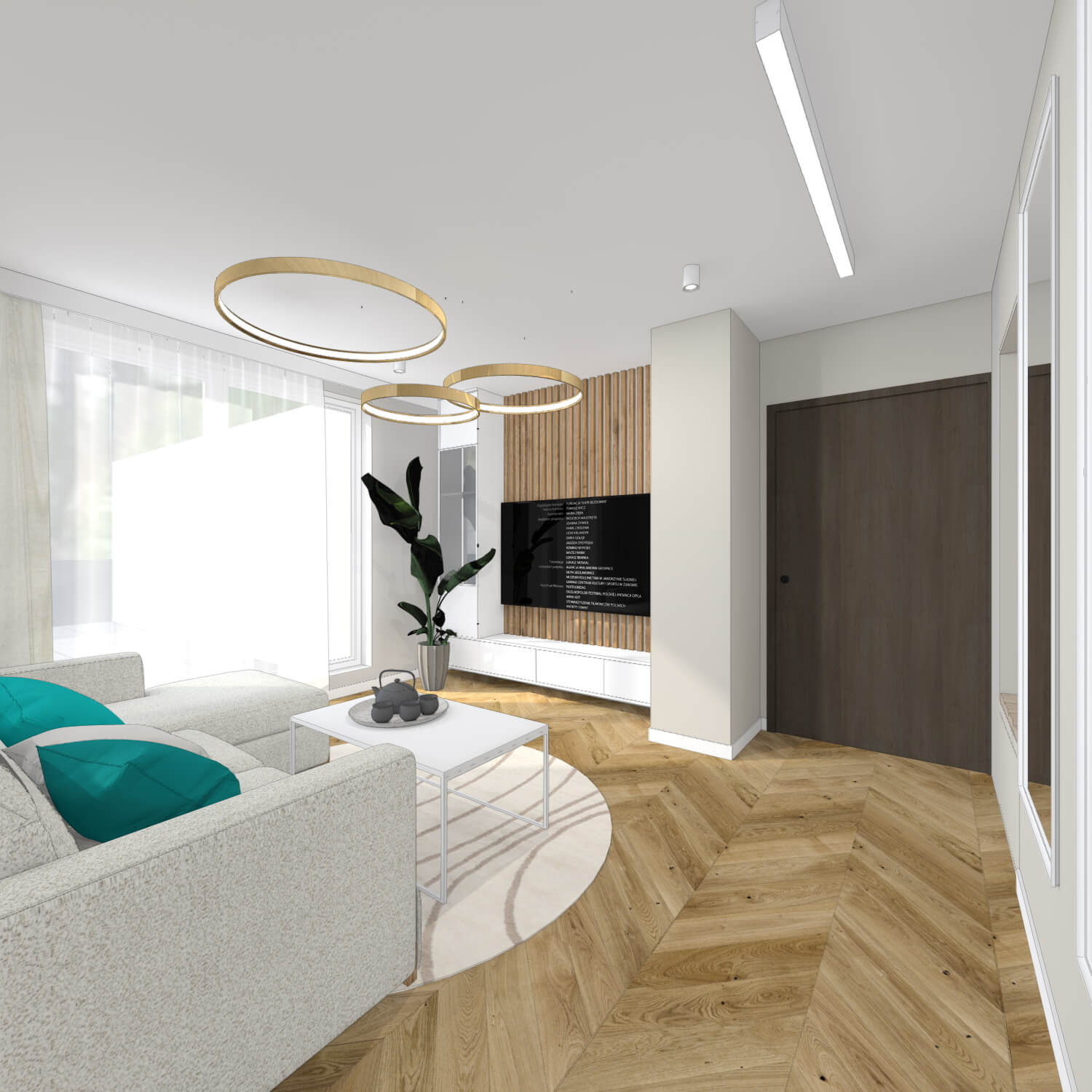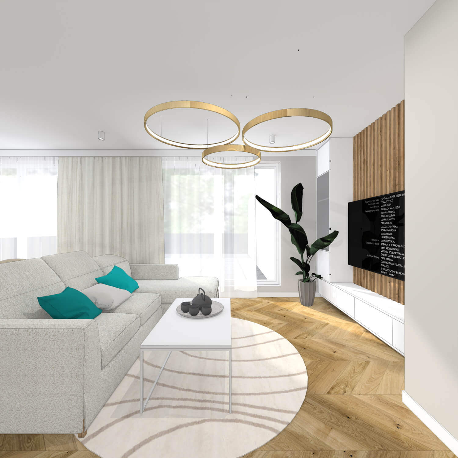 Wnętrze zachwyca elegancją i spójnością, łącząc minimalistyczną formę z luksusowymi detalami. Jasna i przestronna przestrzeń bazuje na ponadczasowej palecie bieli i beżu, która w połączeniu z drewnianą podłogą w jodełkę tworzy harmonijne tło. Charakterystycznym elementem projektu są złote akcenty w oświetleniu i uchwytach, które dodają wnętrzu szlachetności. Całość ożywiają energetyczne turkusowe dodatki, nadając pomieszczeniom wyrazistości i świeżości. Projekt idealnie łączy estetykę z funkcjonalnością, oferując przestrzeń na miarę nowoczesnego stylu życia.