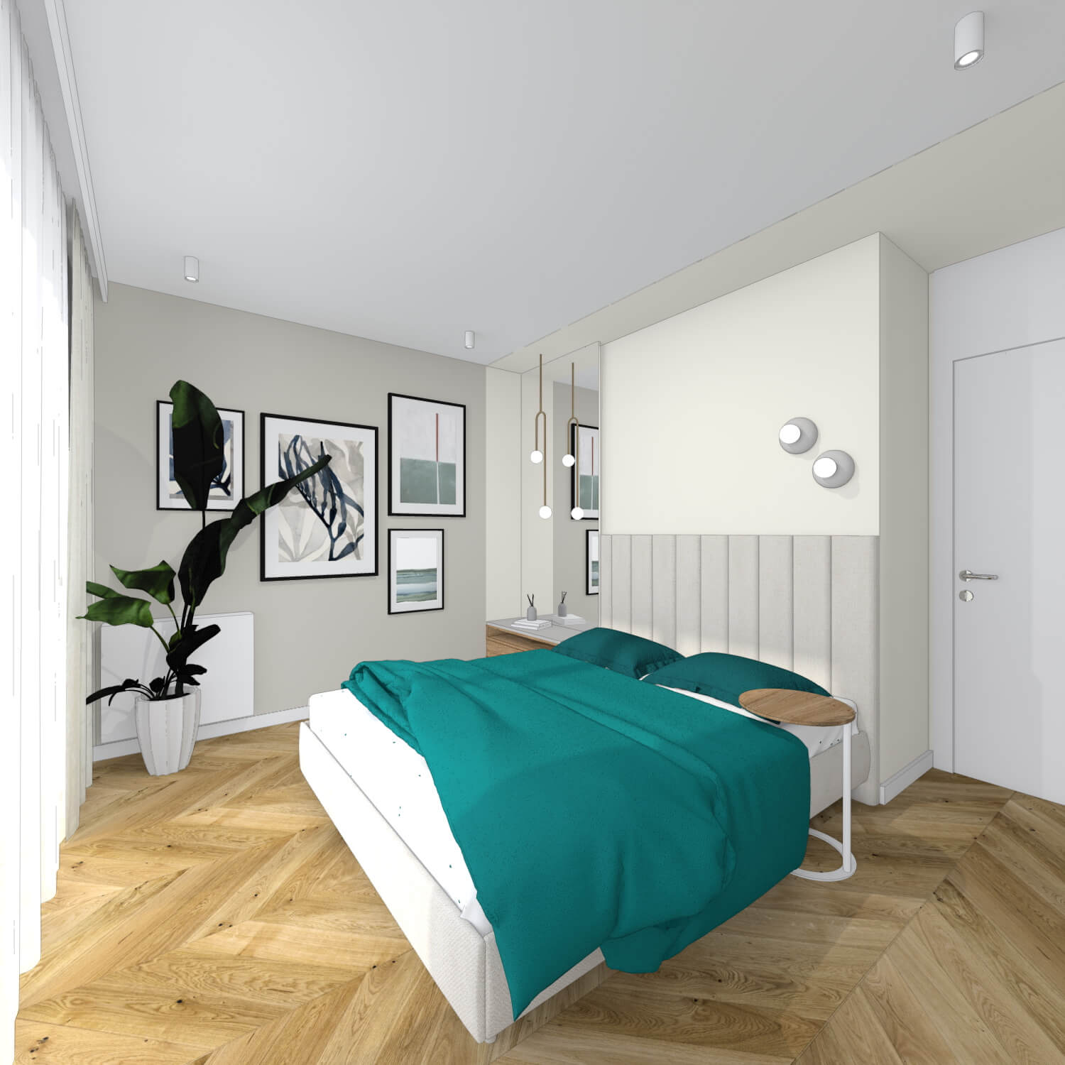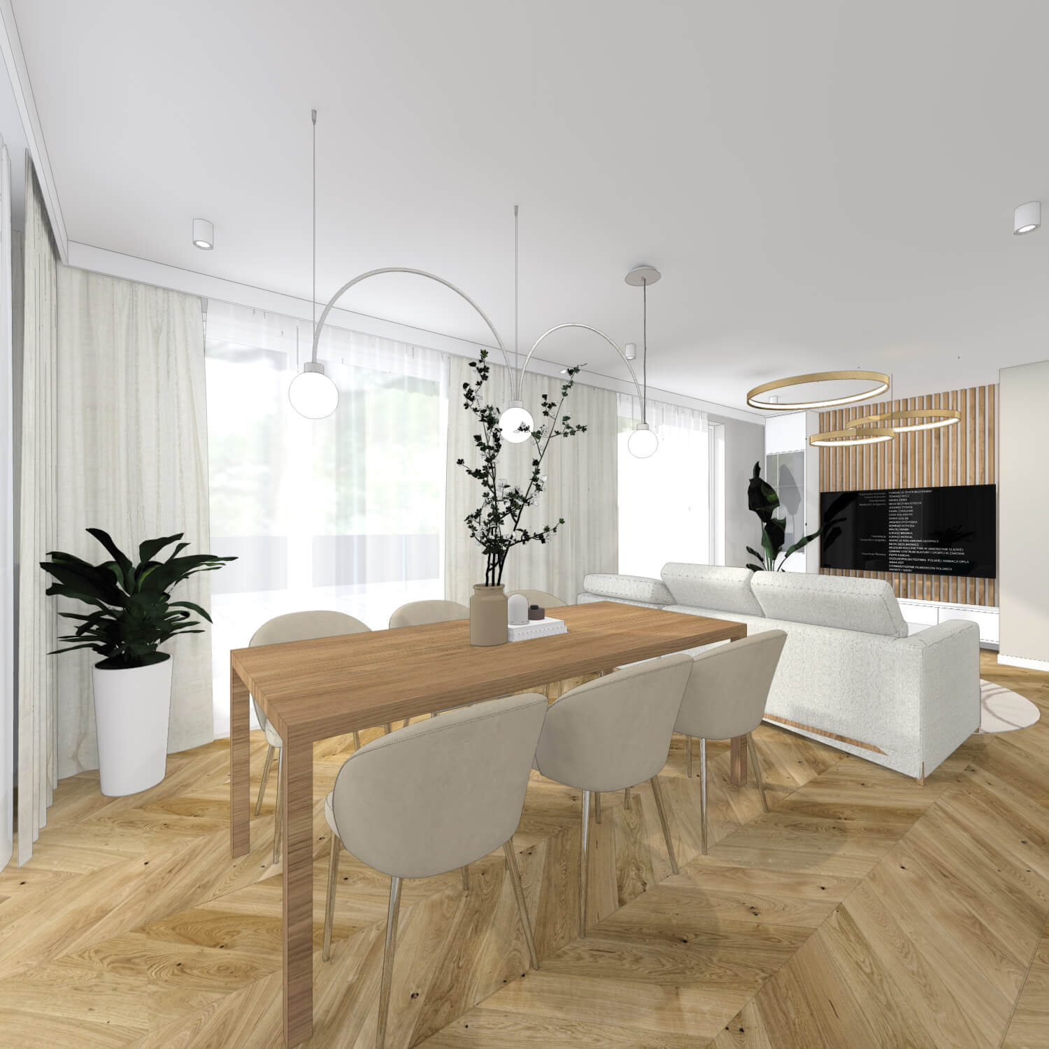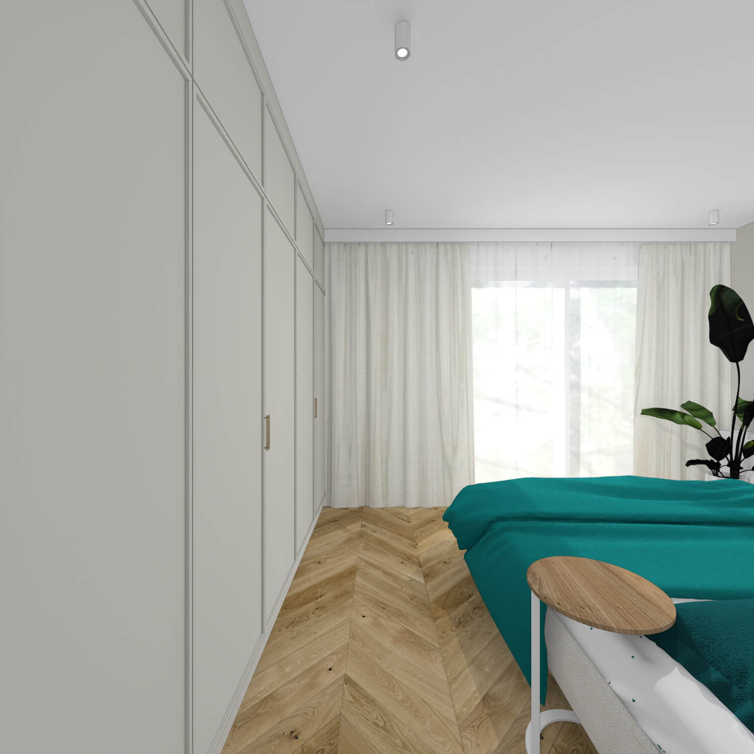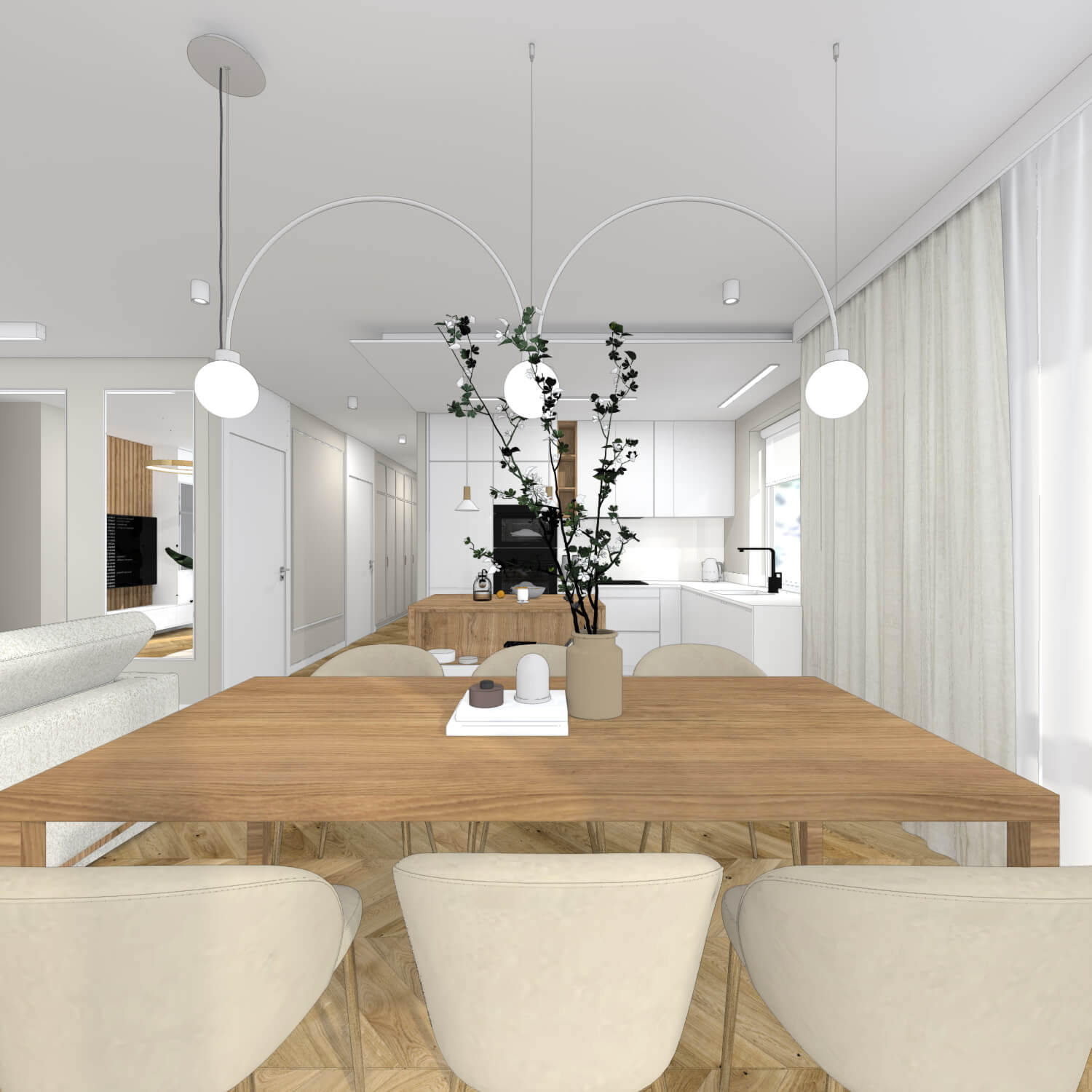 Wnętrze zachwyca elegancją i spójnością, łącząc minimalistyczną formę z luksusowymi detalami. Jasna i przestronna przestrzeń bazuje na ponadczasowej palecie bieli i beżu, która w połączeniu z drewnianą podłogą w jodełkę tworzy harmonijne tło. Charakterystycznym elementem projektu są złote akcenty w oświetleniu i uchwytach, które dodają wnętrzu szlachetności. Całość ożywiają energetyczne turkusowe dodatki, nadając pomieszczeniom wyrazistości i świeżości. Projekt idealnie łączy estetykę z funkcjonalnością, oferując przestrzeń na miarę nowoczesnego stylu życia.