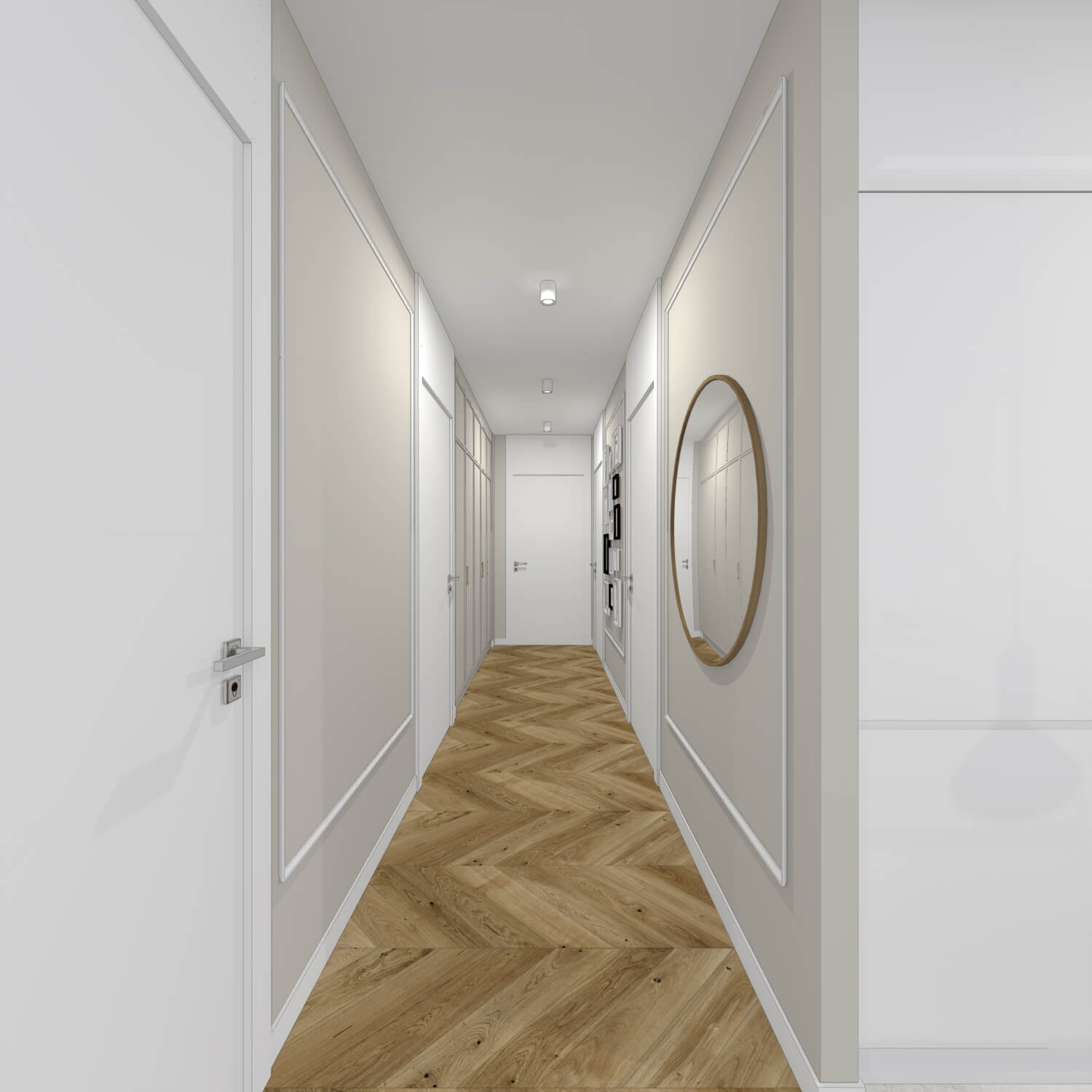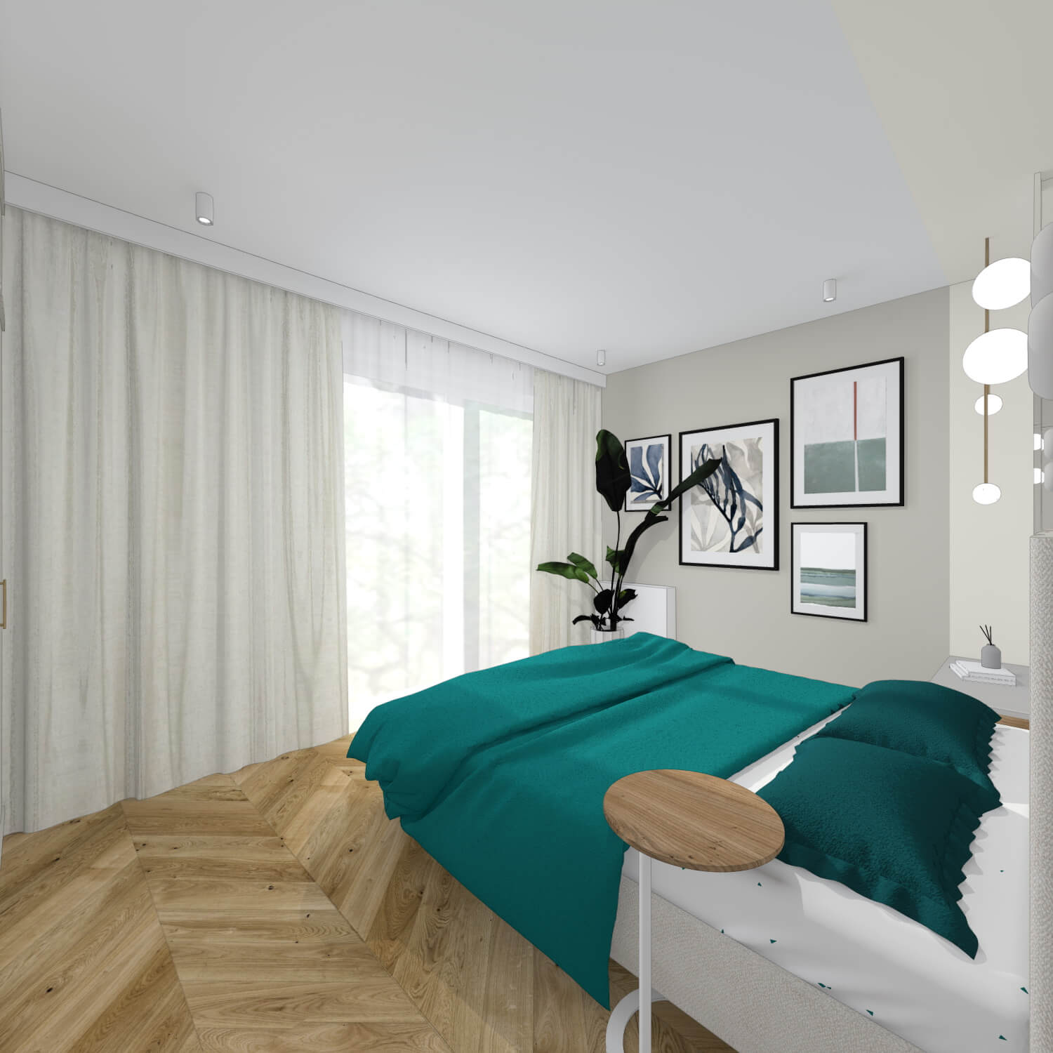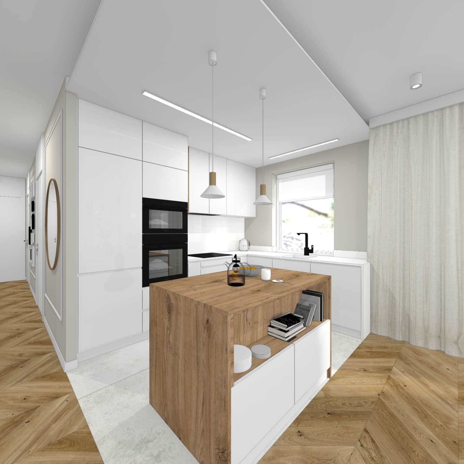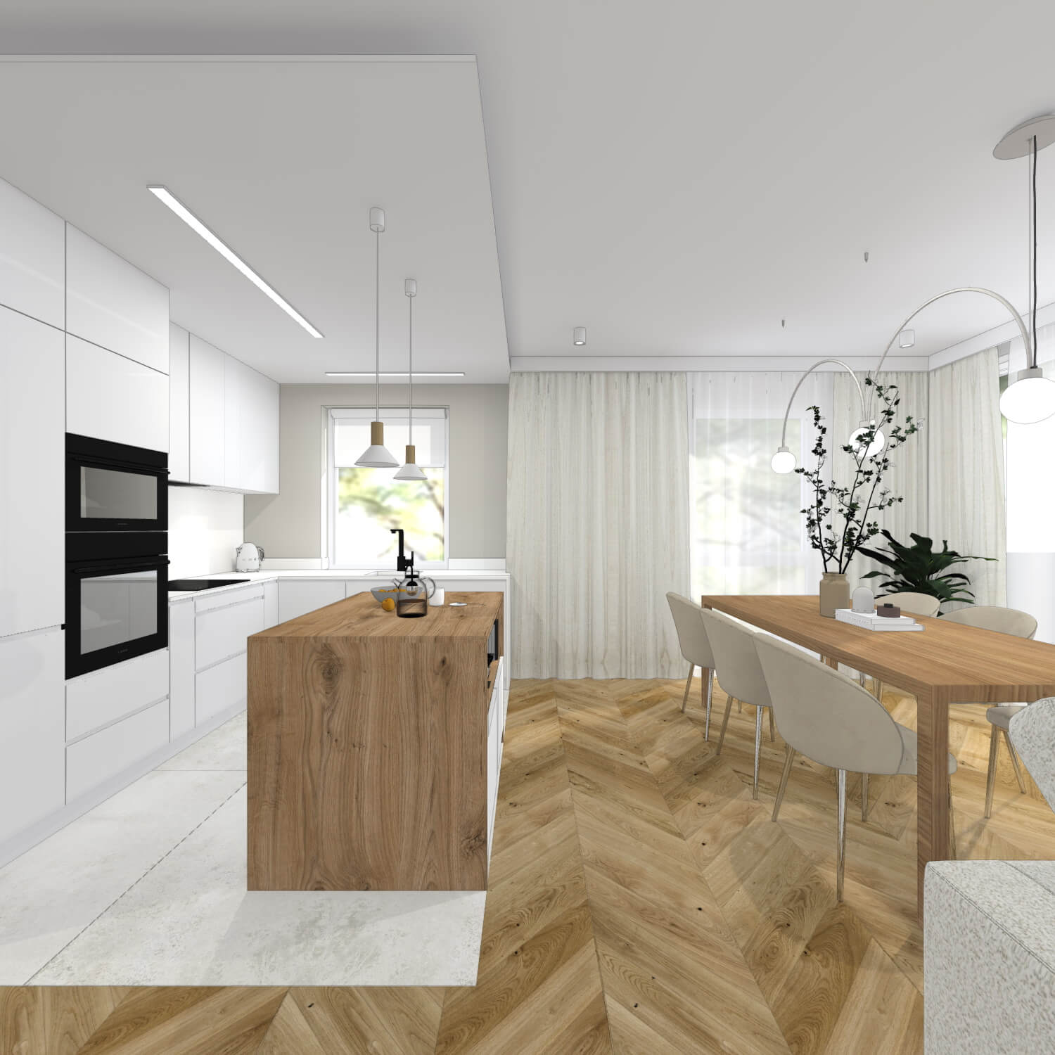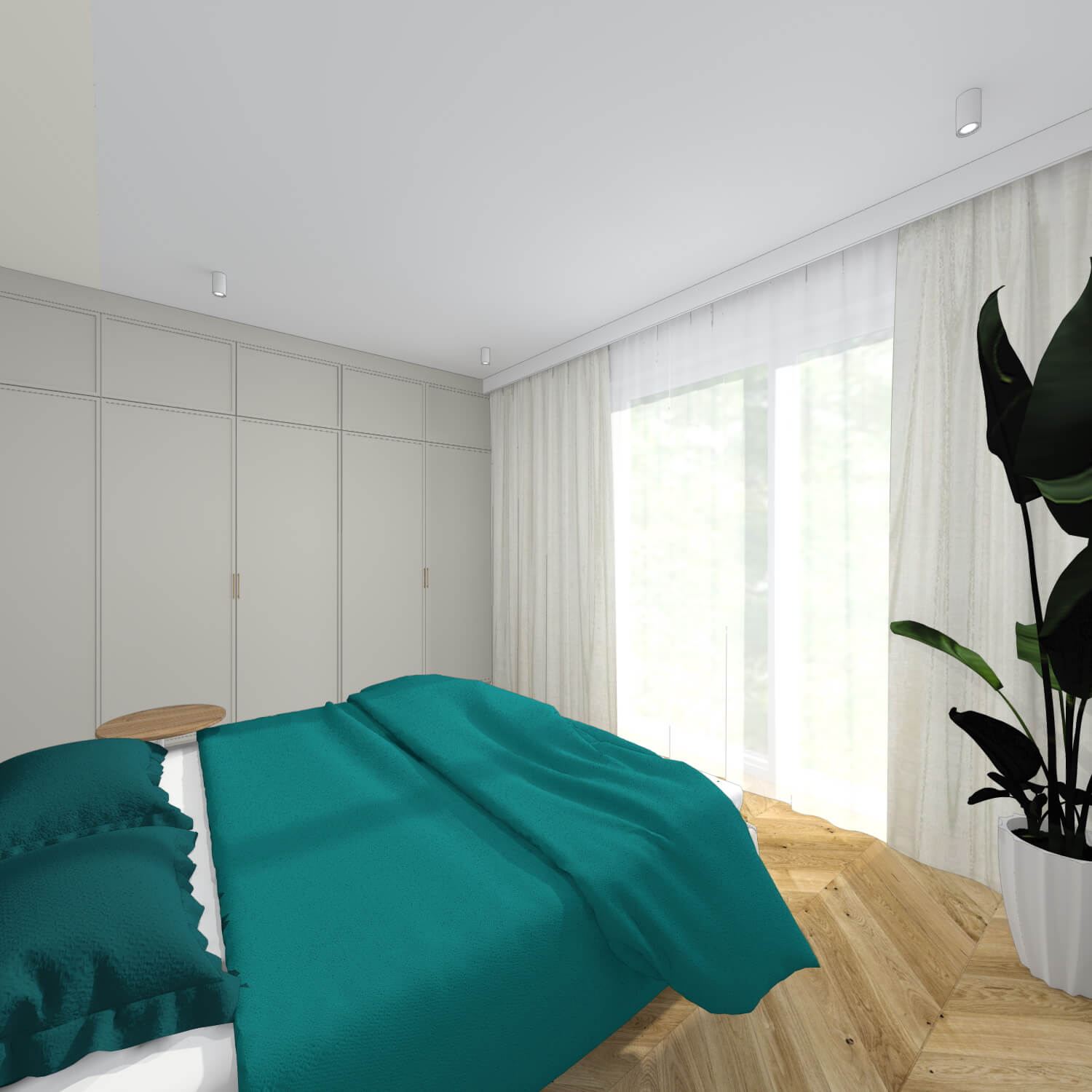 Wnętrze zachwyca elegancją i spójnością, łącząc minimalistyczną formę z luksusowymi detalami. Jasna i przestronna przestrzeń bazuje na ponadczasowej palecie bieli i beżu, która w połączeniu z drewnianą podłogą w jodełkę tworzy harmonijne tło. Charakterystycznym elementem projektu są złote akcenty w oświetleniu i uchwytach, które dodają wnętrzu szlachetności. Całość ożywiają energetyczne turkusowe dodatki, nadając pomieszczeniom wyrazistości i świeżości. Projekt idealnie łączy estetykę z funkcjonalnością, oferując przestrzeń na miarę nowoczesnego stylu życia.