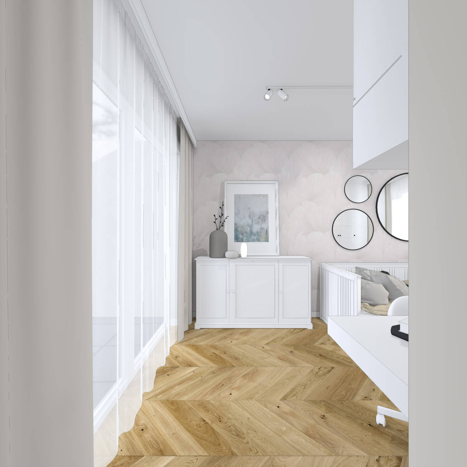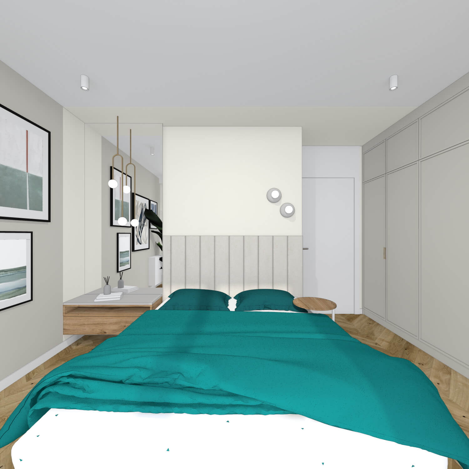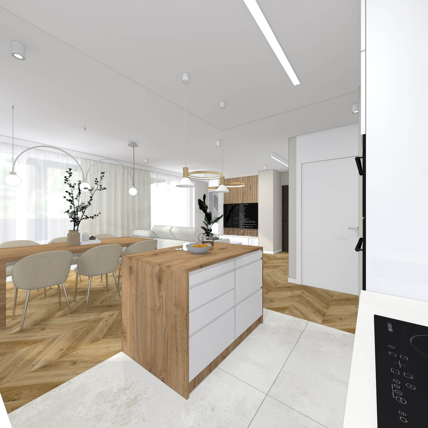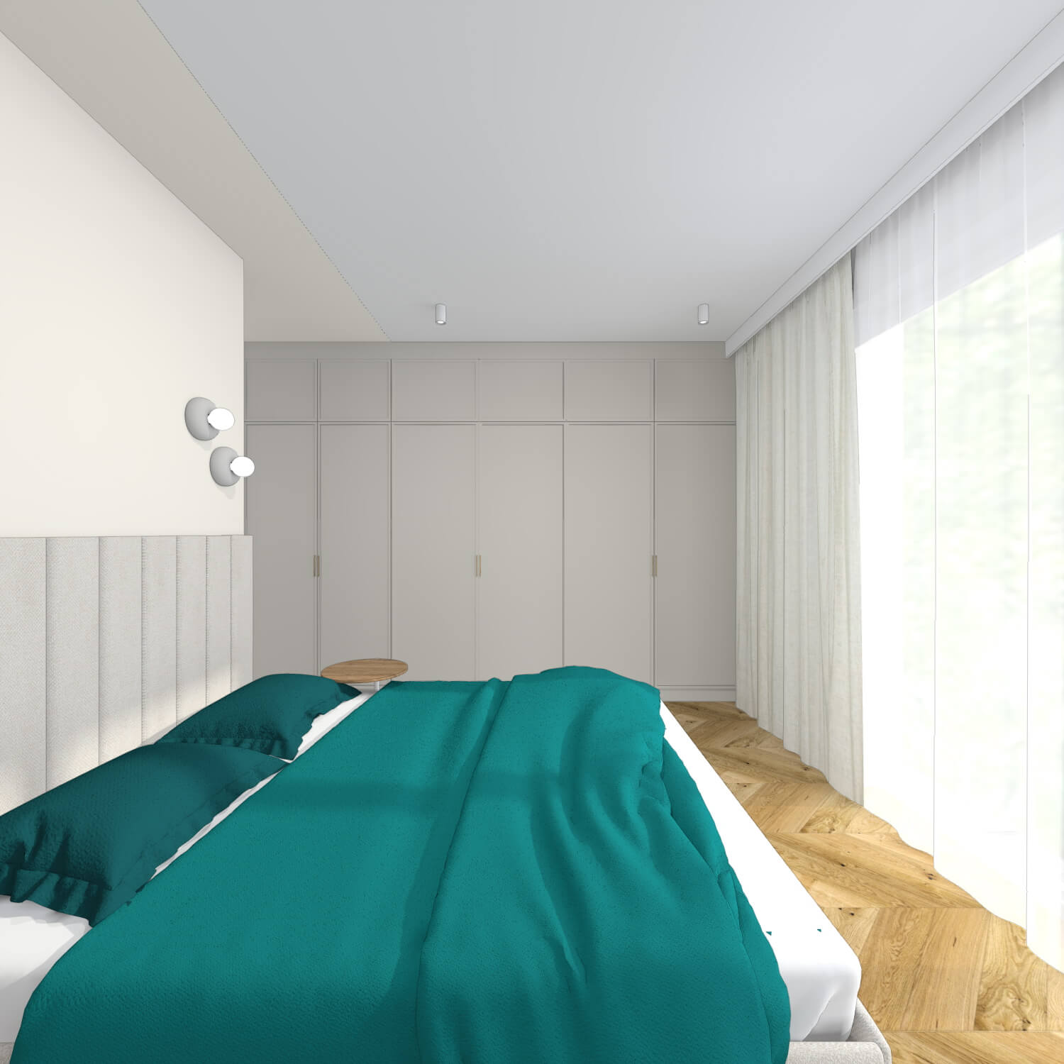 Wnętrze zachwyca elegancją i spójnością, łącząc minimalistyczną formę z luksusowymi detalami. Jasna i przestronna przestrzeń bazuje na ponadczasowej palecie bieli i beżu, która w połączeniu z drewnianą podłogą w jodełkę tworzy harmonijne tło. Charakterystycznym elementem projektu są złote akcenty w oświetleniu i uchwytach, które dodają wnętrzu szlachetności. Całość ożywiają energetyczne turkusowe dodatki, nadając pomieszczeniom wyrazistości i świeżości. Projekt idealnie łączy estetykę z funkcjonalnością, oferując przestrzeń na miarę nowoczesnego stylu życia.