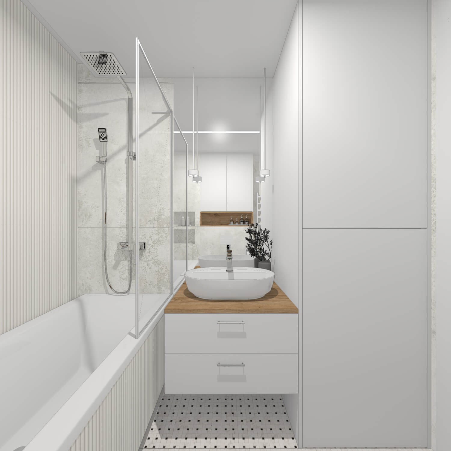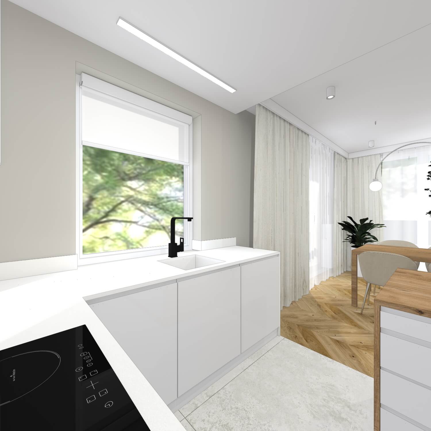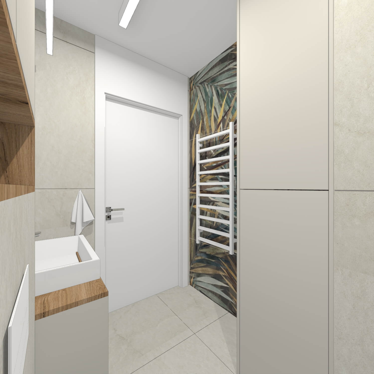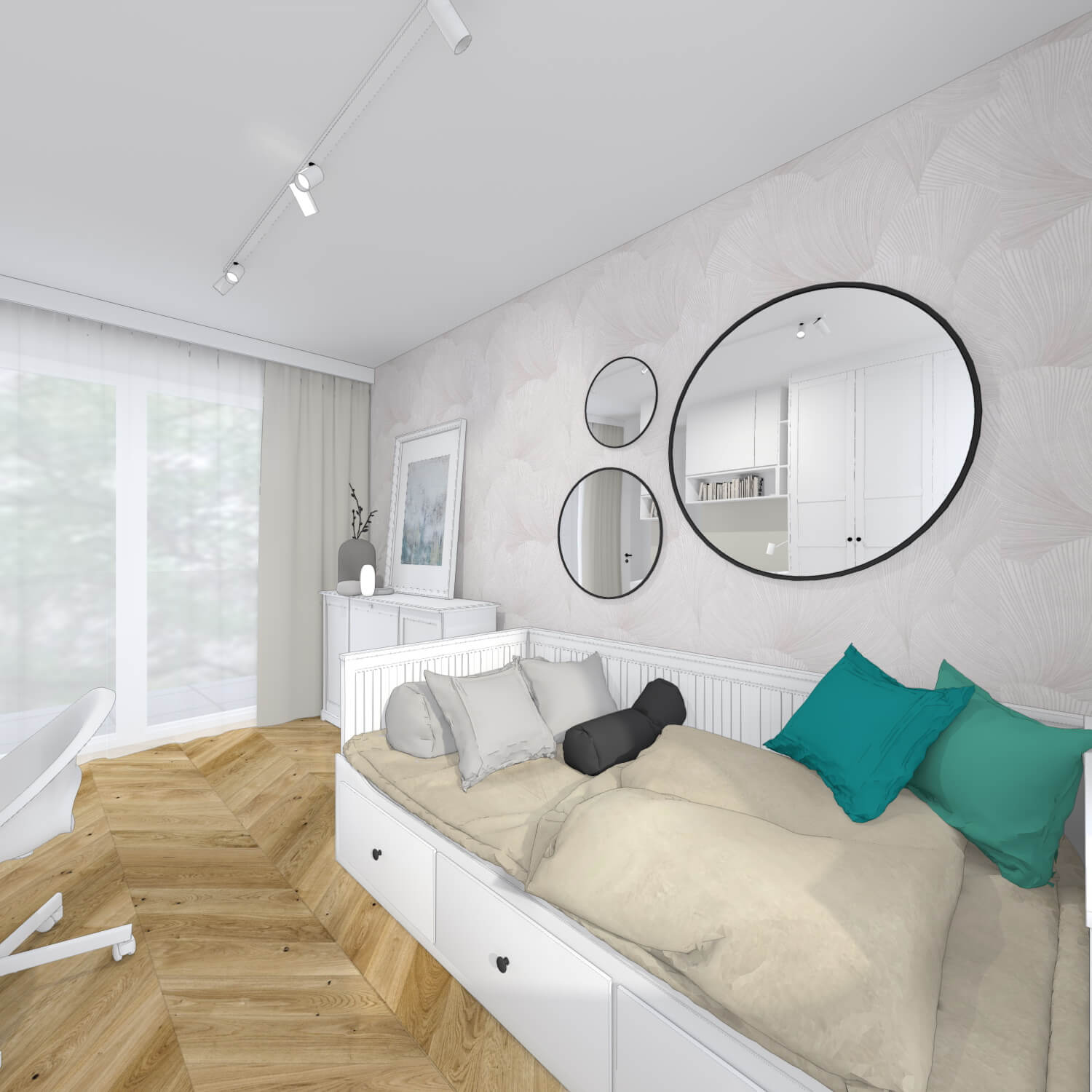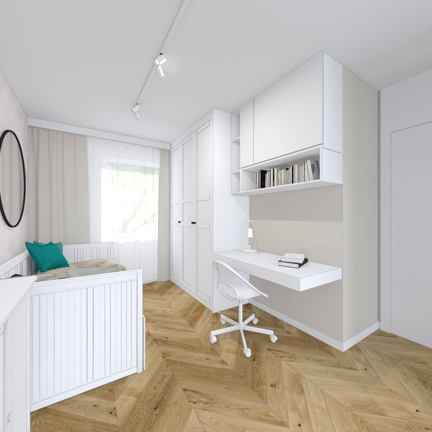 Wnętrze zachwyca elegancją i spójnością, łącząc minimalistyczną formę z luksusowymi detalami. Jasna i przestronna przestrzeń bazuje na ponadczasowej palecie bieli i beżu, która w połączeniu z drewnianą podłogą w jodełkę tworzy harmonijne tło. Charakterystycznym elementem projektu są złote akcenty w oświetleniu i uchwytach, które dodają wnętrzu szlachetności. Całość ożywiają energetyczne turkusowe dodatki, nadając pomieszczeniom wyrazistości i świeżości. Projekt idealnie łączy estetykę z funkcjonalnością, oferując przestrzeń na miarę nowoczesnego stylu życia.