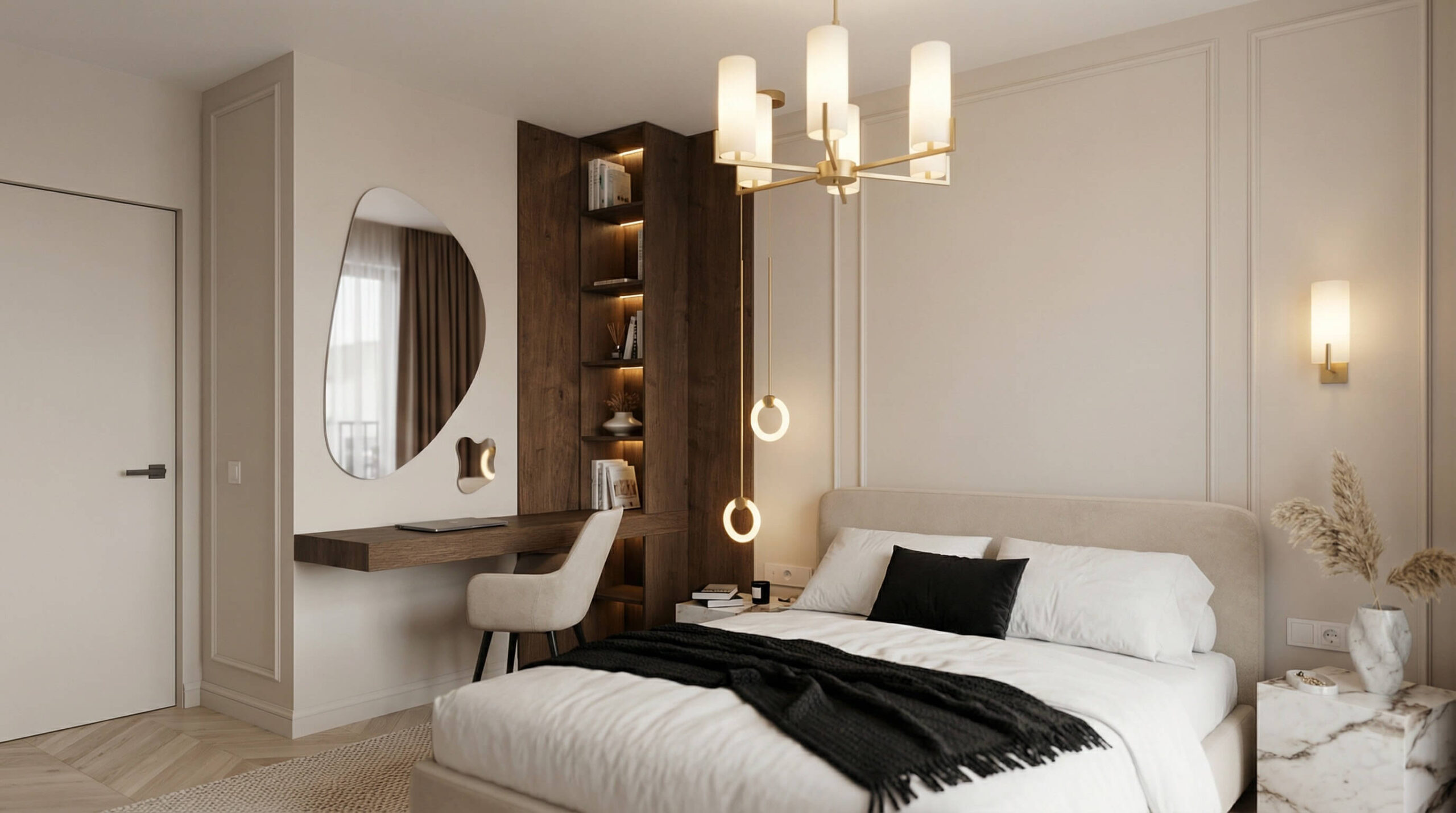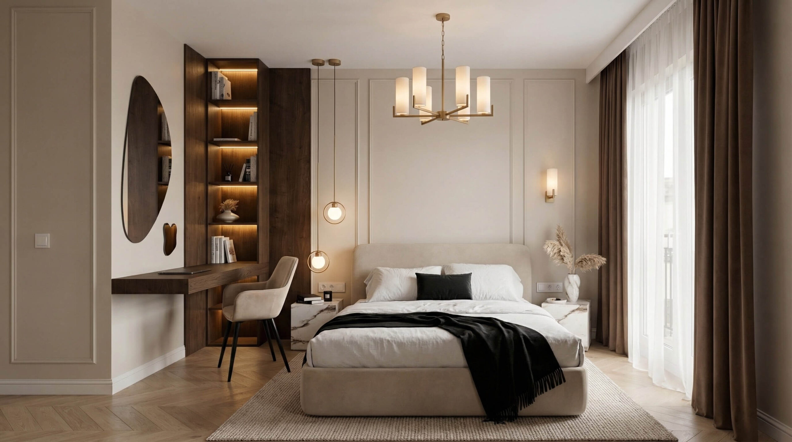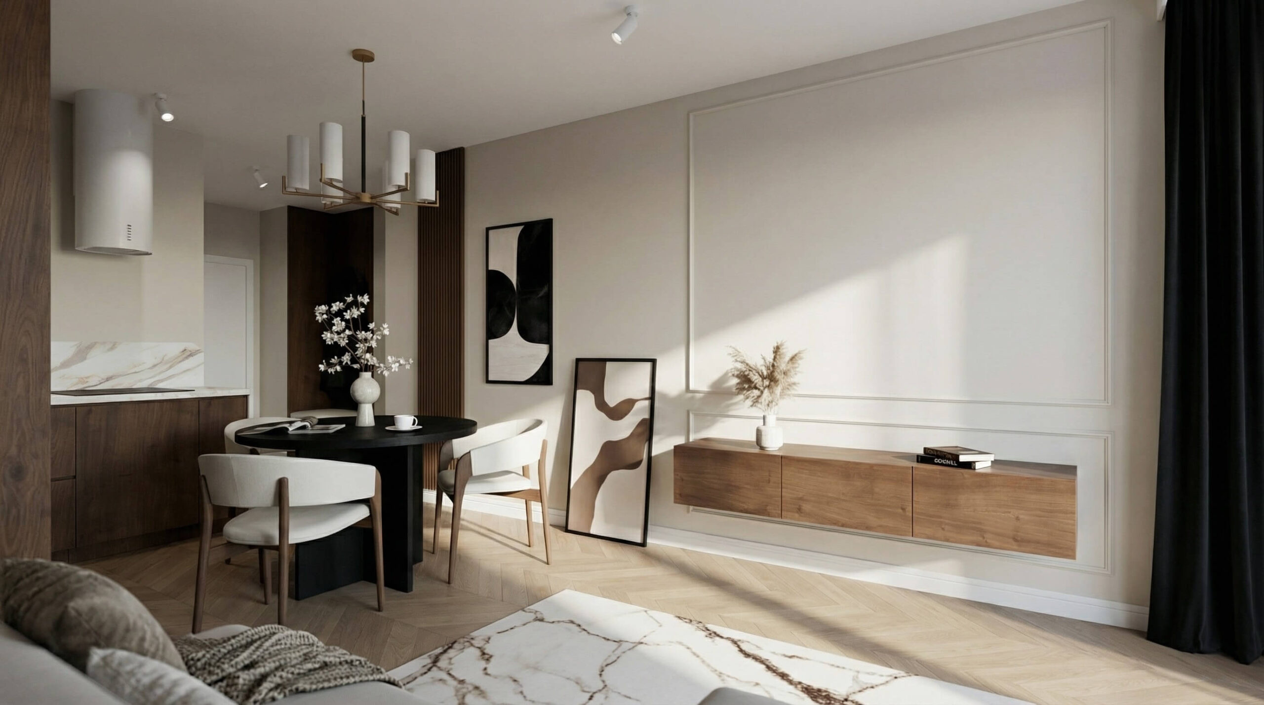 Ten projekt to studium nowoczesnej elegancji, w którym klasyczne detale spotykają się z funkcjonalnym minimalizmem. Głównym założeniem było stworzenie przestrzeni kojącej zmysły, a jednocześnie wyrazistej. Dominujące drewno orzechowe zestawiliśmy z miękkimi fakturami tkanin i subtelną sztukaterią, tworząc wnętrze o ponadczasowym charakterze. Kluczowym rozwiązaniem stało się ażurowe przepierzenie, które dyskretnie wydziela strefę home office, nie zabierając przestrzeni poczucia lekkości i światła.
