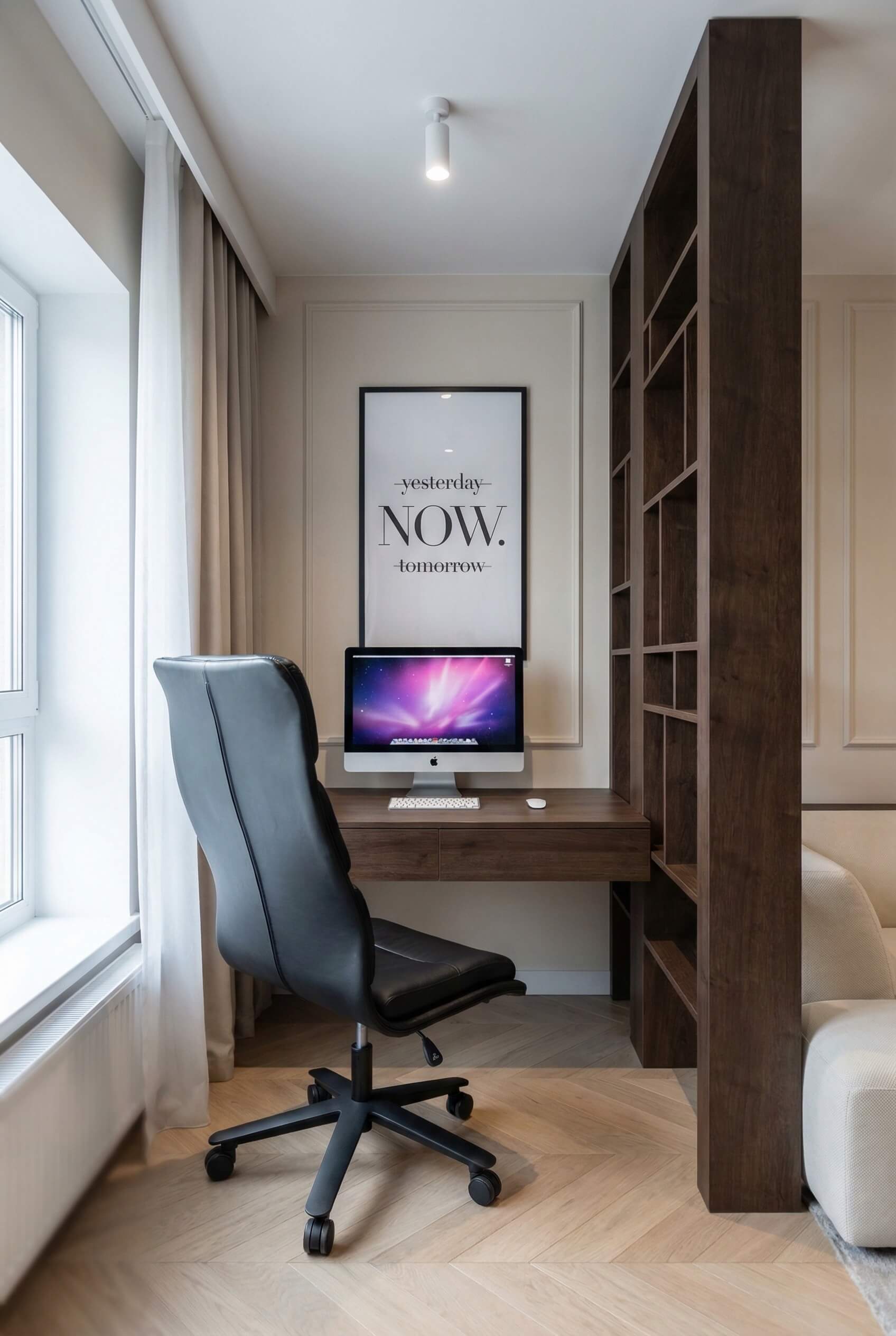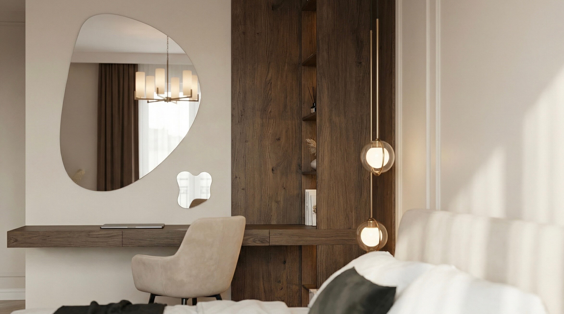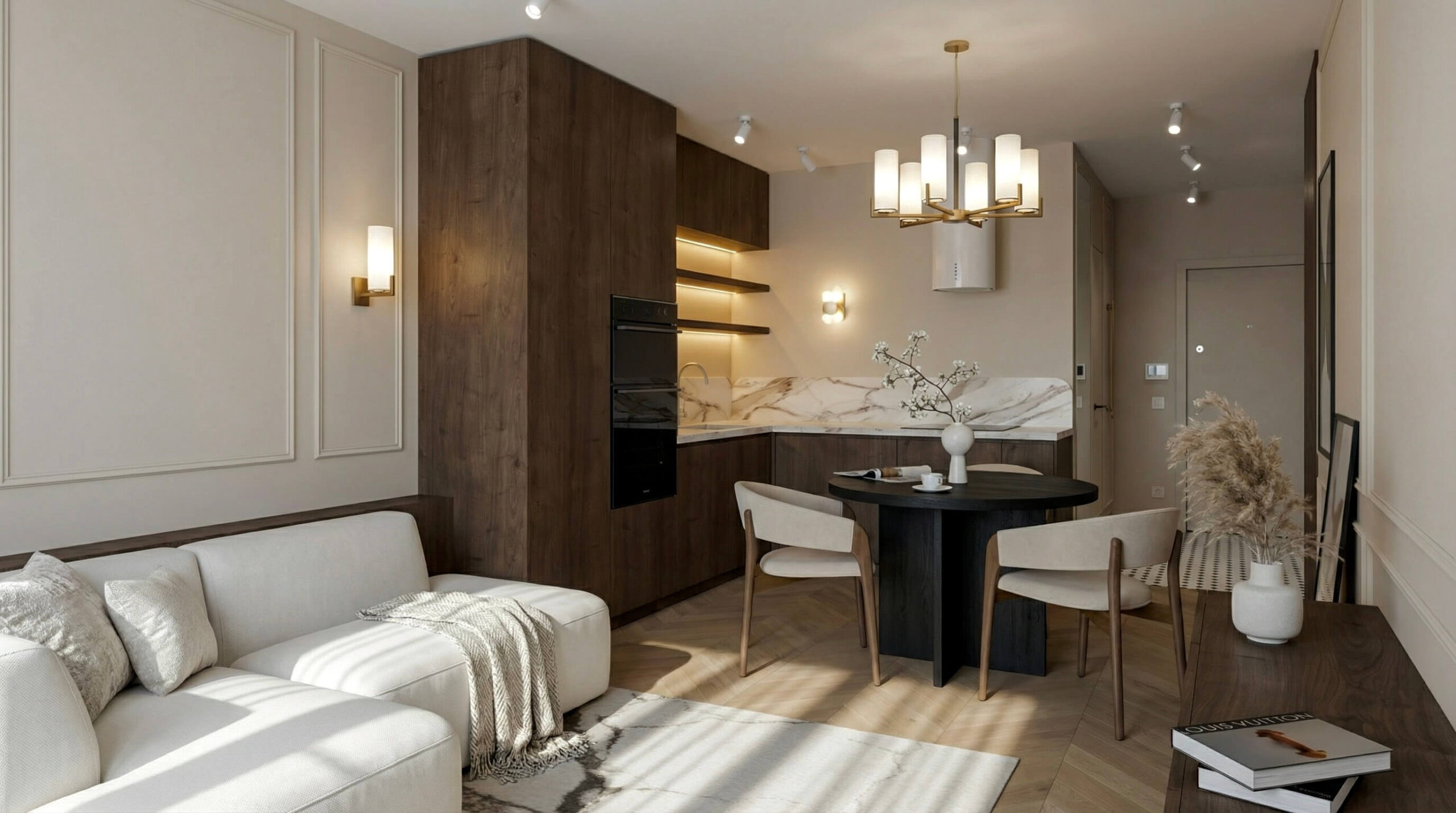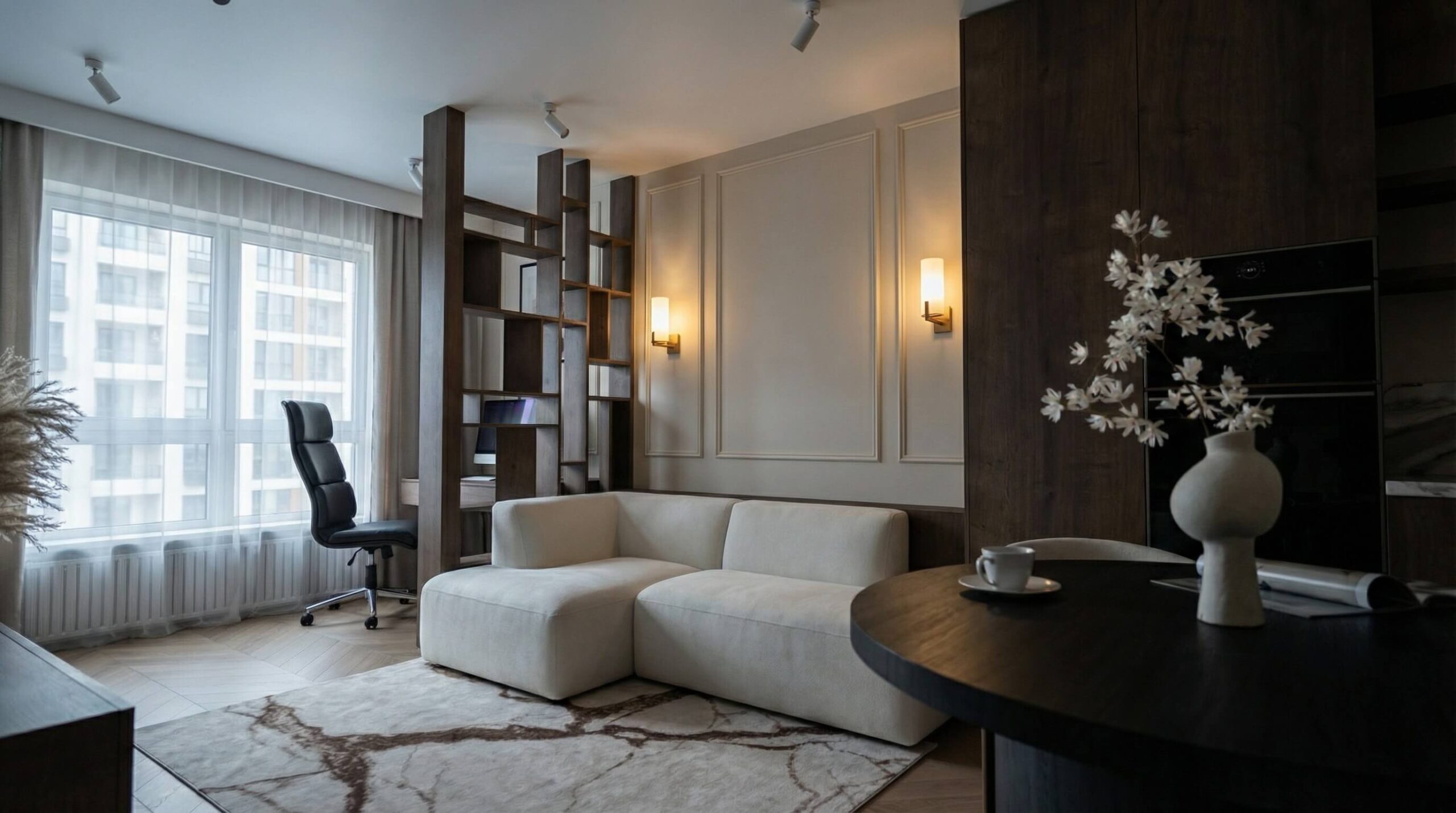 Ten projekt to studium nowoczesnej elegancji, w którym klasyczne detale spotykają się z funkcjonalnym minimalizmem. Głównym założeniem było stworzenie przestrzeni kojącej zmysły, a jednocześnie wyrazistej. Dominujące drewno orzechowe zestawiliśmy z miękkimi fakturami tkanin i subtelną sztukaterią, tworząc wnętrze o ponadczasowym charakterze. Kluczowym rozwiązaniem stało się ażurowe przepierzenie, które dyskretnie wydziela strefę home office, nie zabierając przestrzeni poczucia lekkości i światła.