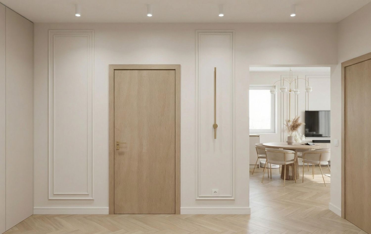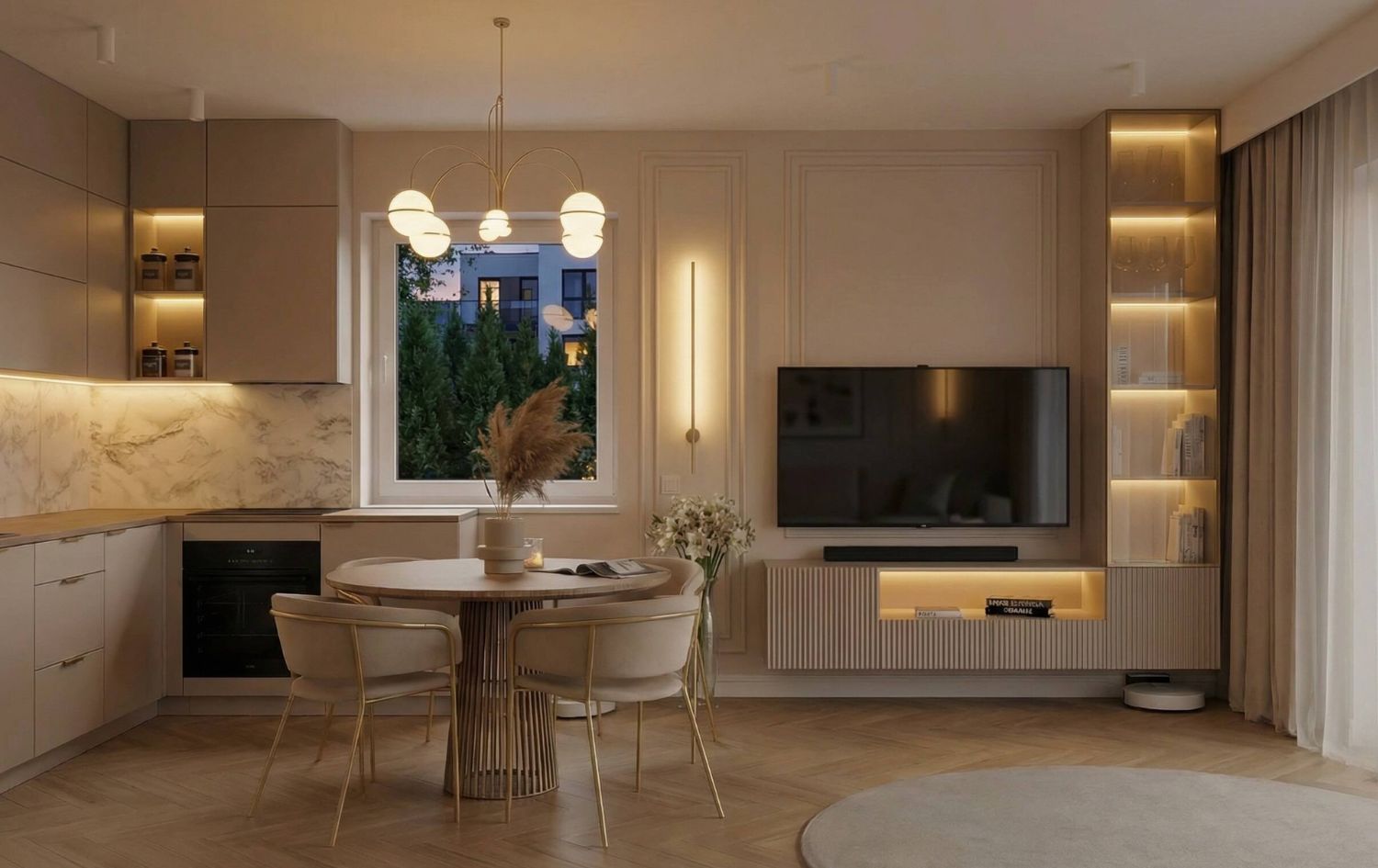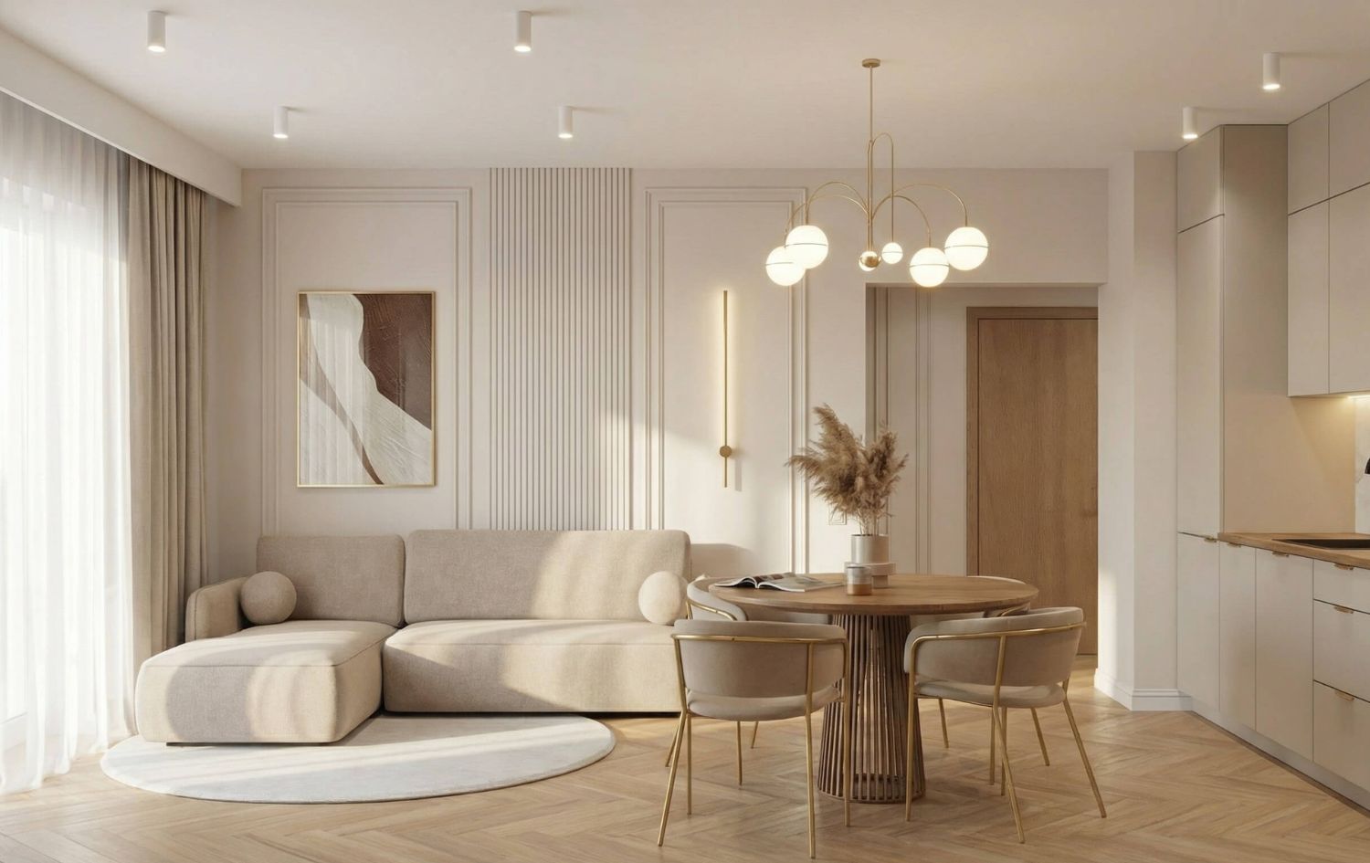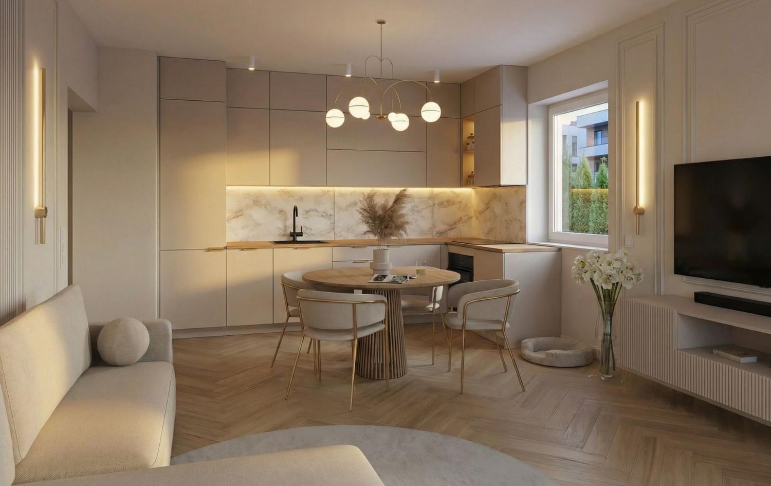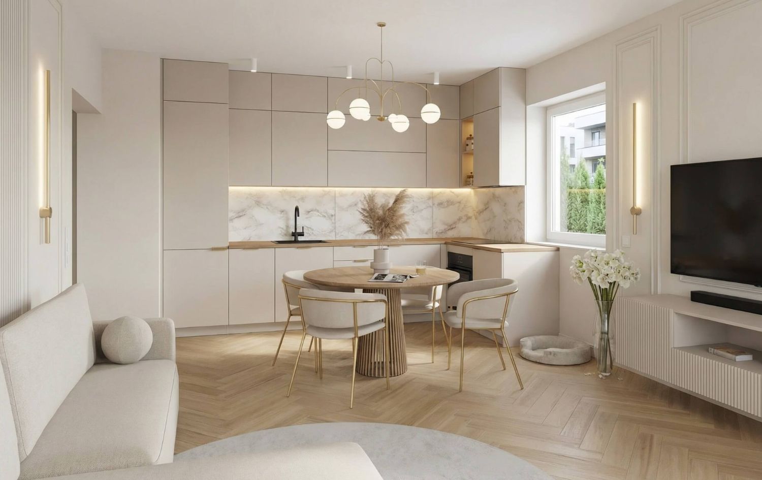 - Kuchnia: Jasna, matowa zabudowa kuchenna. Złote oprawy oświetleniowe nad wyspą stanowią biżuteryjny akcent całego wnętrza.