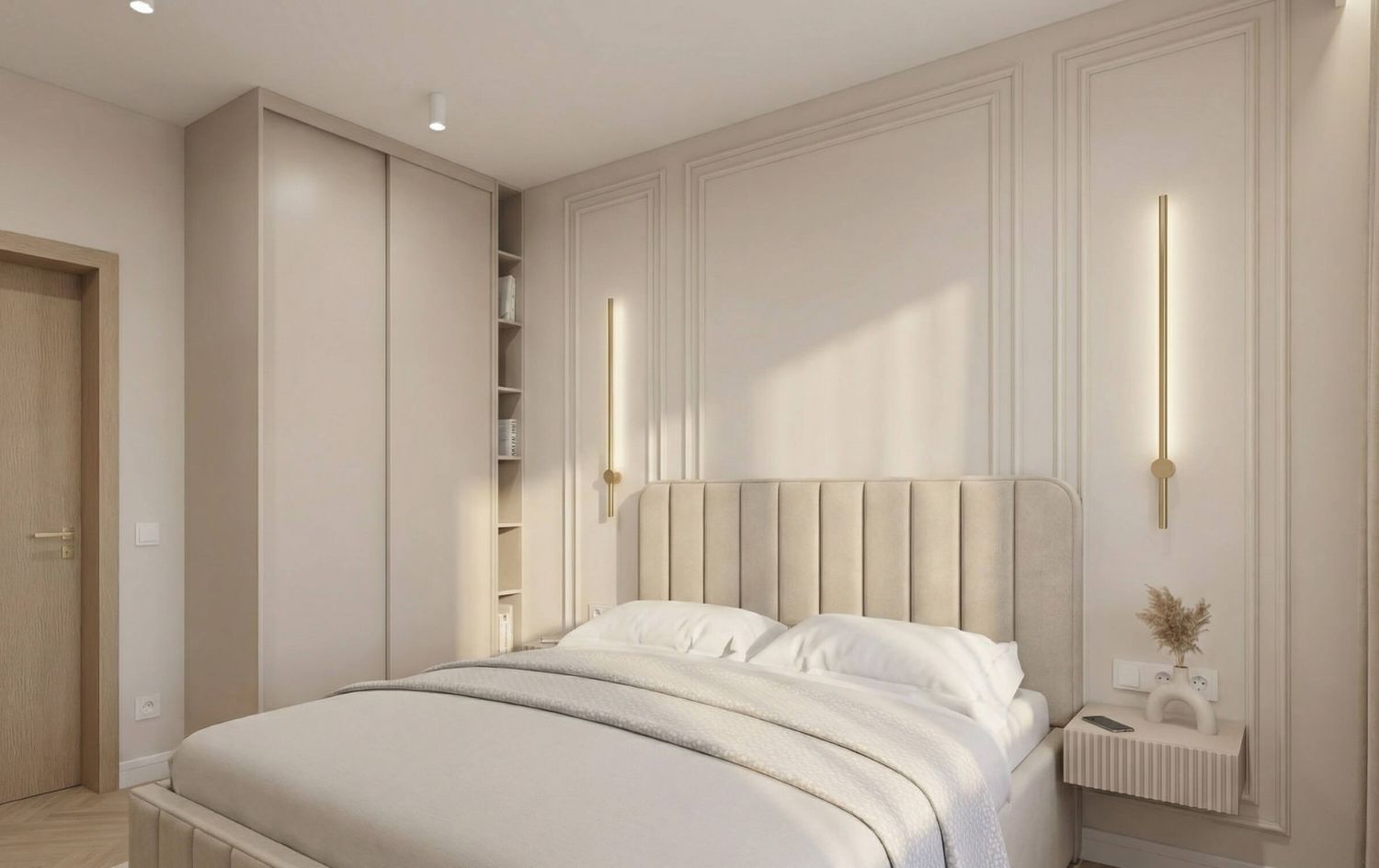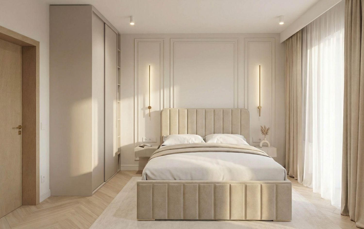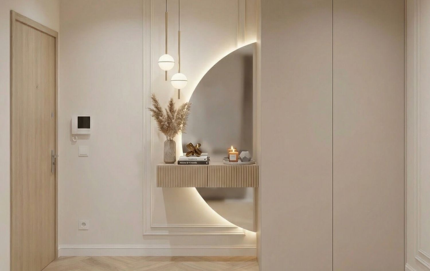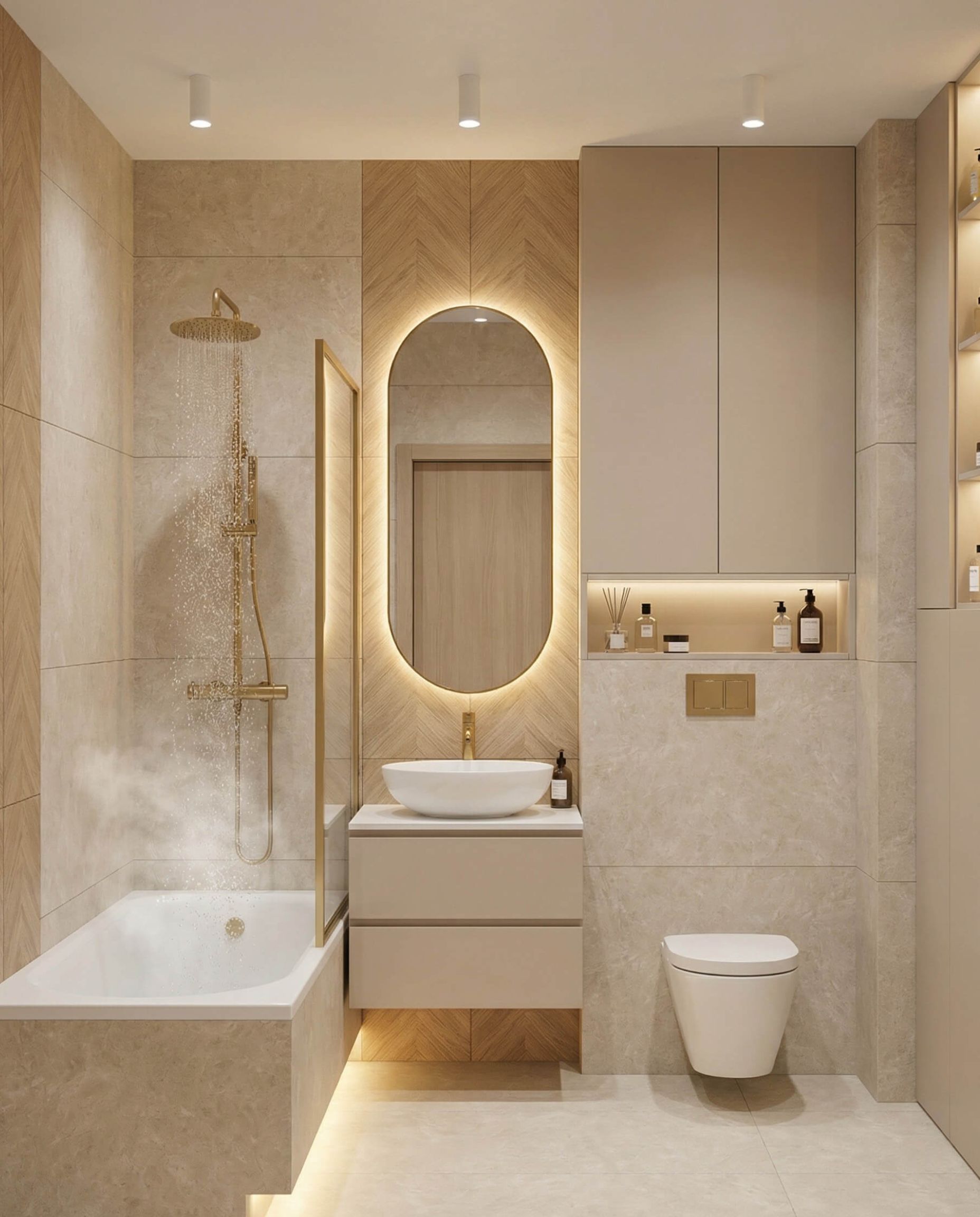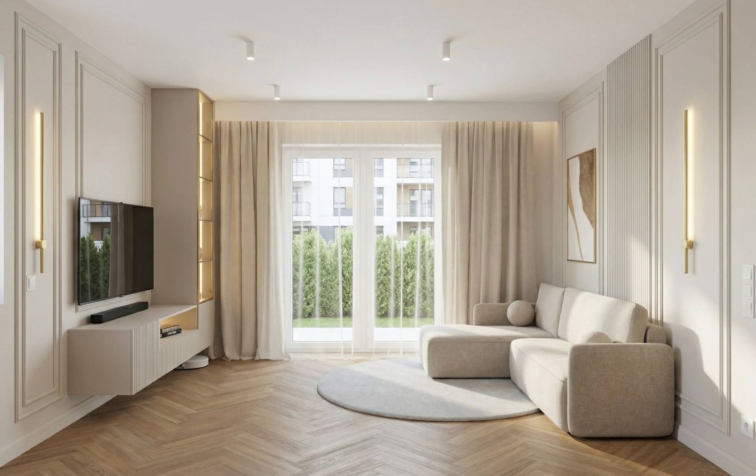 - Kuchnia: Jasna, matowa zabudowa kuchenna. Złote oprawy oświetleniowe nad wyspą stanowią biżuteryjny akcent całego wnętrza.