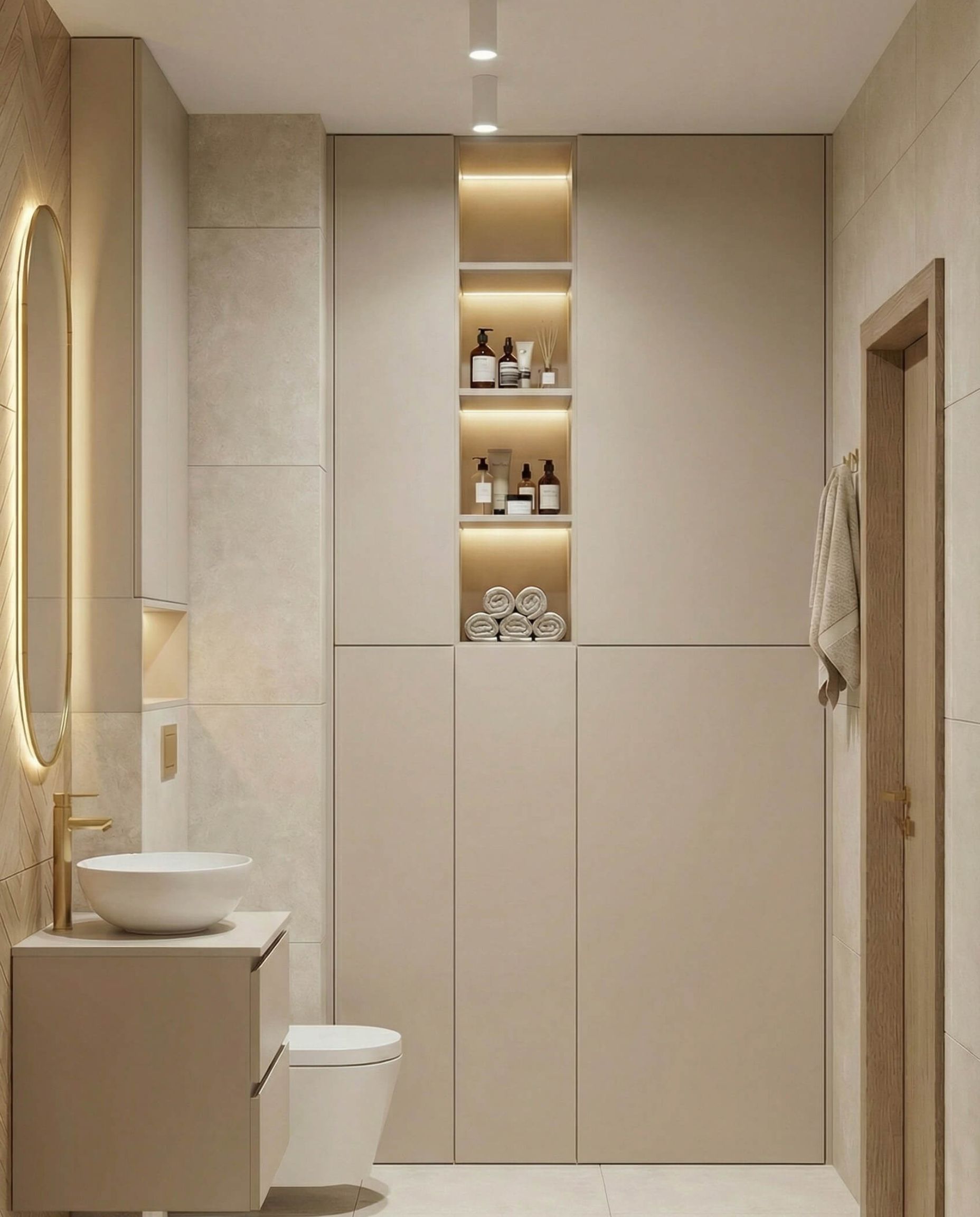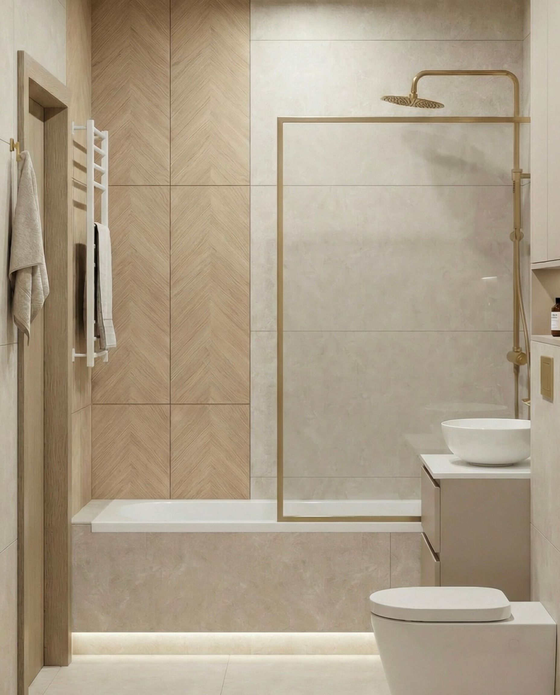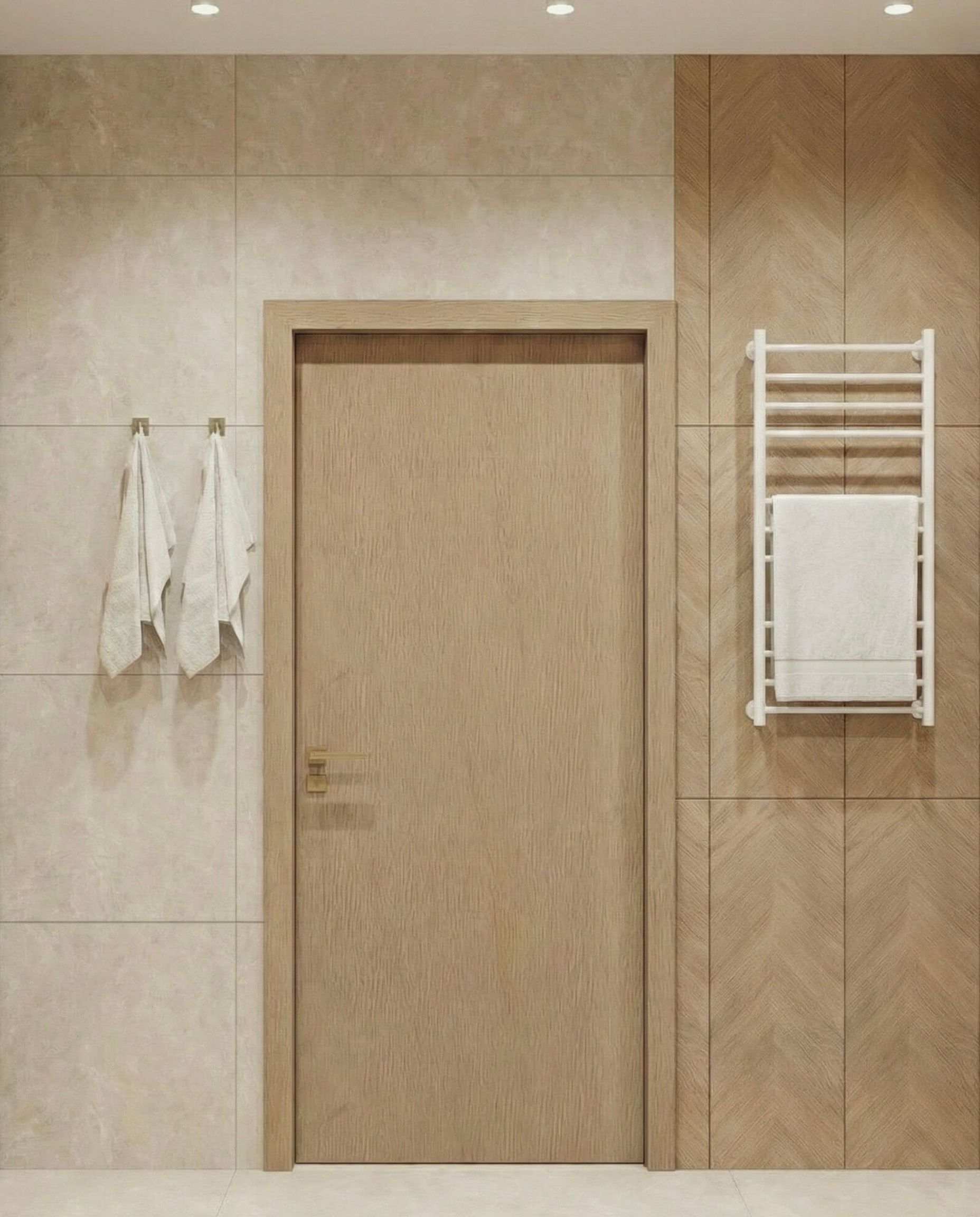 - Strefa Dzienna z Lamelem: Salon został zaprojektowany jako miejsce relaksu, gdzie główną rolę grają pionowe dębowe lamele z ukrytym oświetleniem LED, które nadają wnętrzu głębi i przytulności.