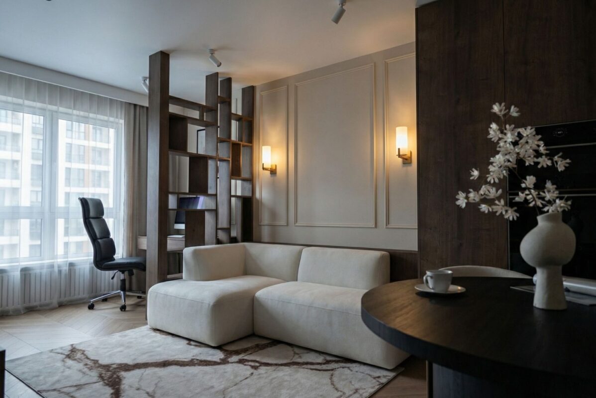 Projekt "Nowoczesna Elegancja" to aranżacja domu o powierzchni 90 m², w której luksusowe wykończenia spotykają się z domowym ciepłem. Dominująca paleta barw oparta na głębokim antracycie, czerni i bieli została przełamana naturalnym rysunkiem drewna oraz szlachetnymi, złotymi detalami. Wnętrze emanuje spokojem i prestiżem, oferując domownikom przestrzeń dopracowaną w każdym calu – od funkcjonalnej kuchni po nastrojową strefę wypoczynkową.