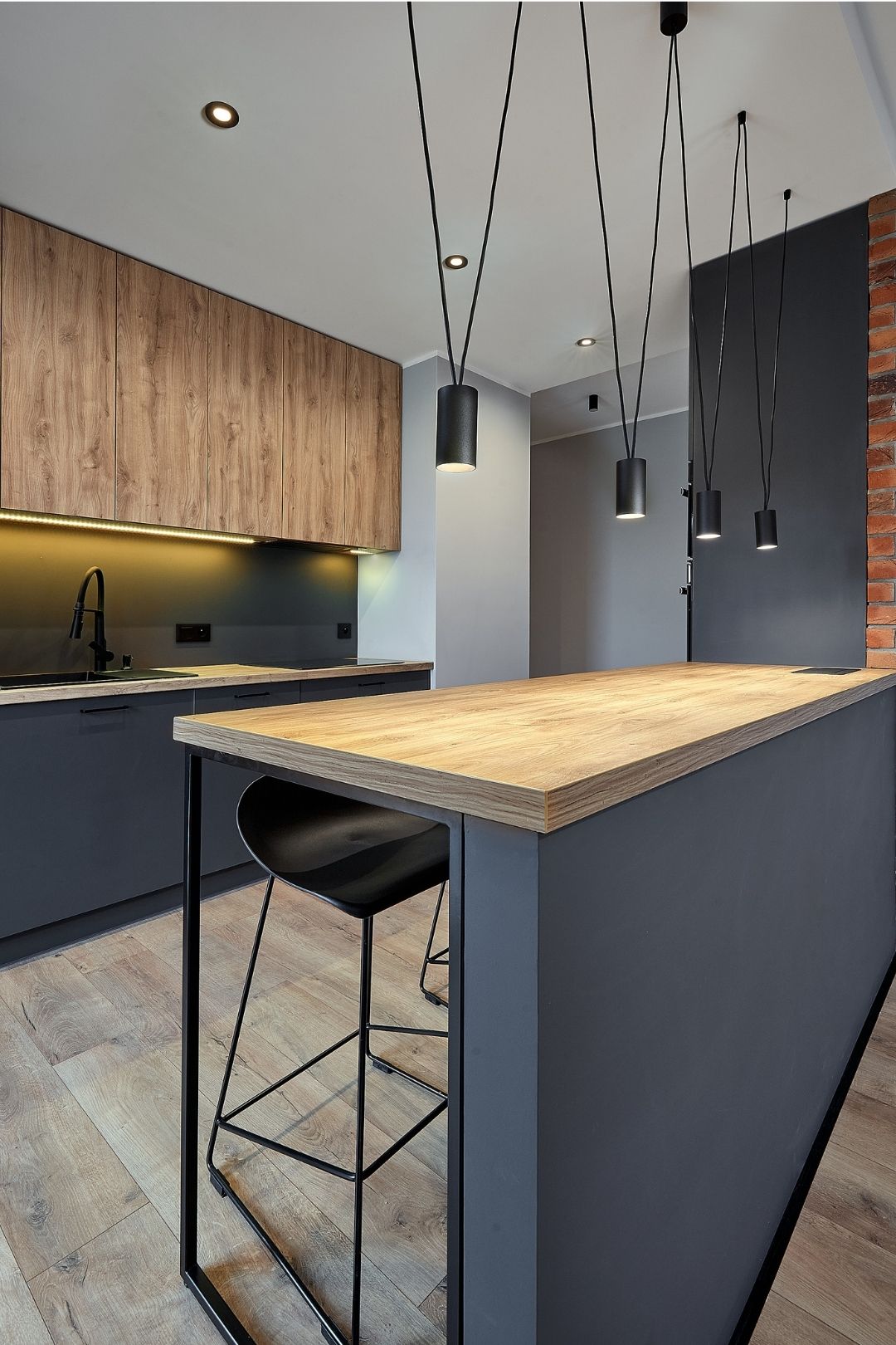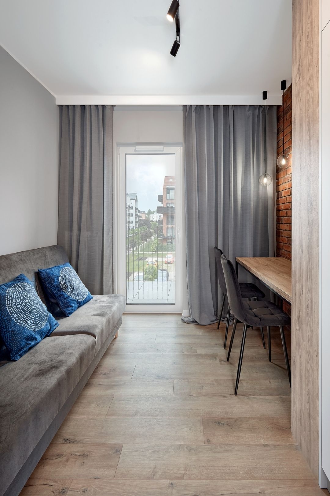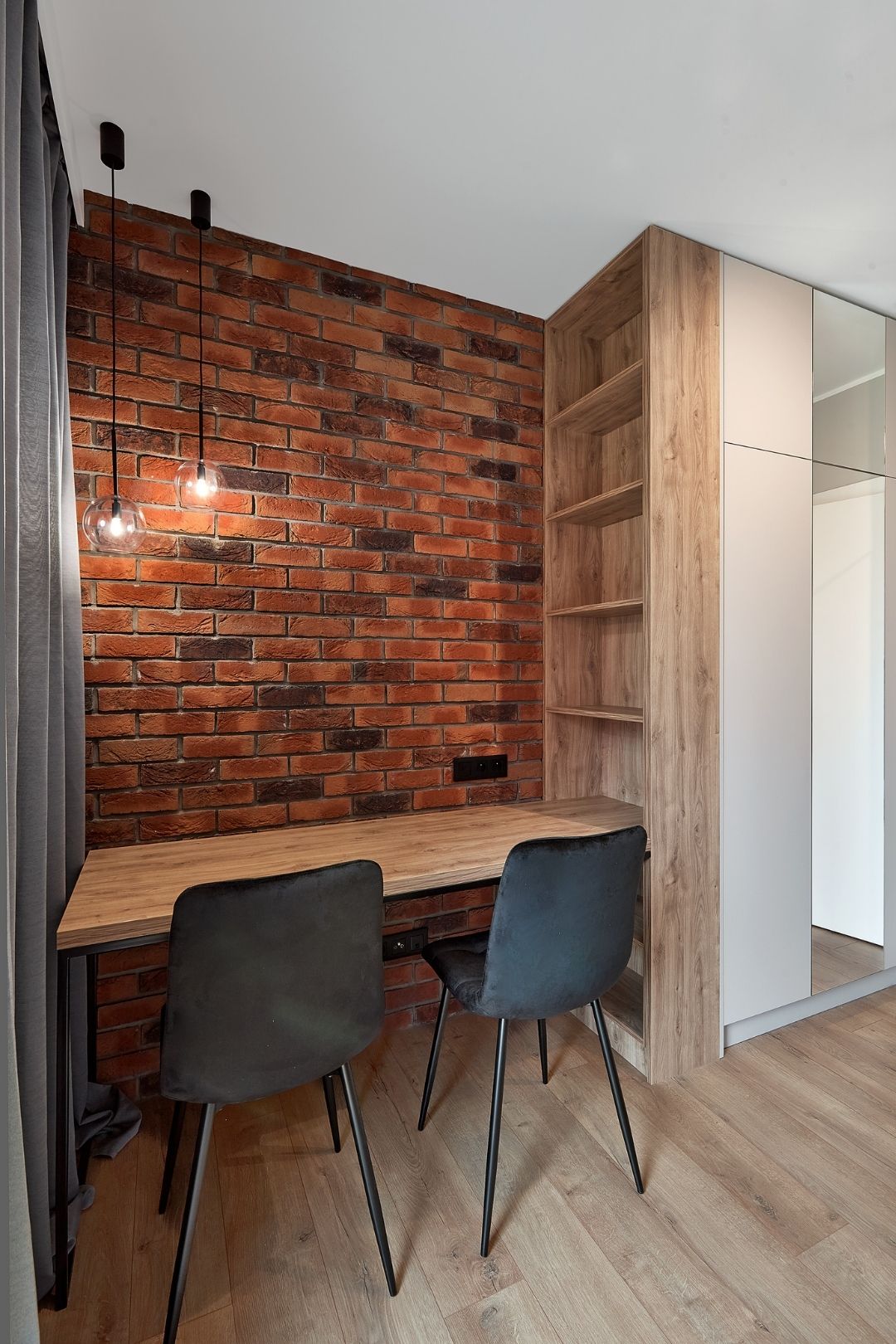 Projekt apartamentu, w którym surowość stylu industrialnego łączy się z ciepłem i funkcjonalnością nowoczesnego minimalizmu. Wnętrza charakteryzują się harmonijnym połączeniem różnorodnych faktur i materiałów, takich jak naturalne drewno, surowa cegła, szare tekstylia oraz czarne, matowe detale. Całość tworzy przytulną i spójną przestrzeń, idealną do życia w miejskim stylu. Projekt objął kompleksowe wyposażenie i aranżację salonu z jadalnią oraz korytarza.