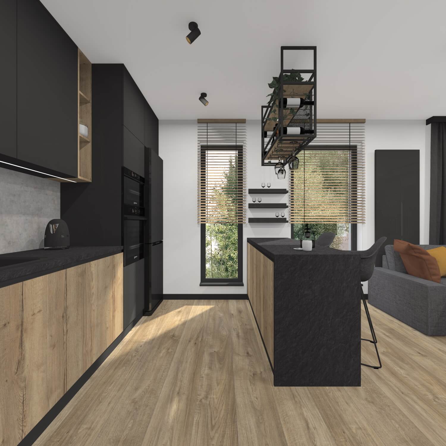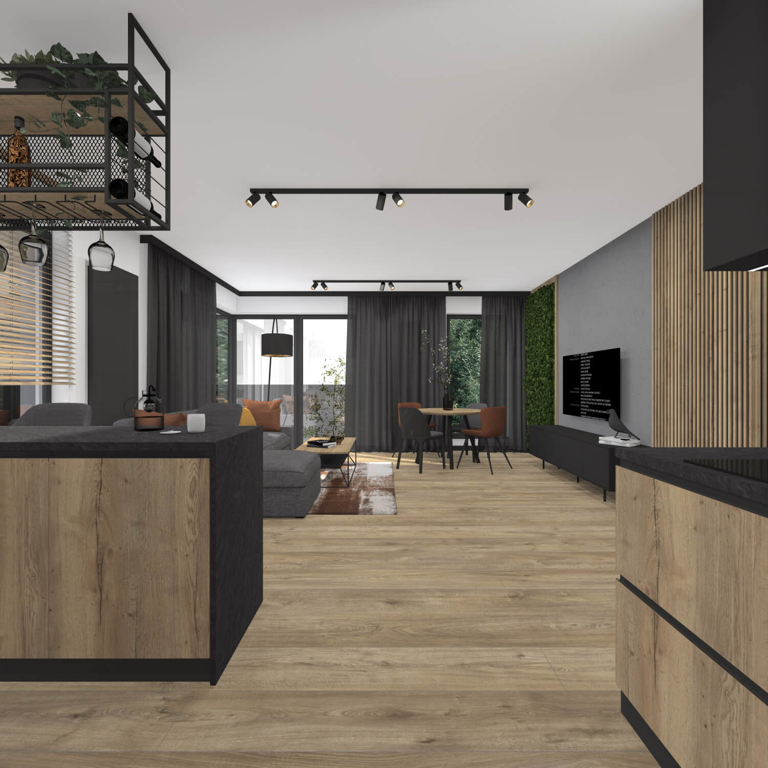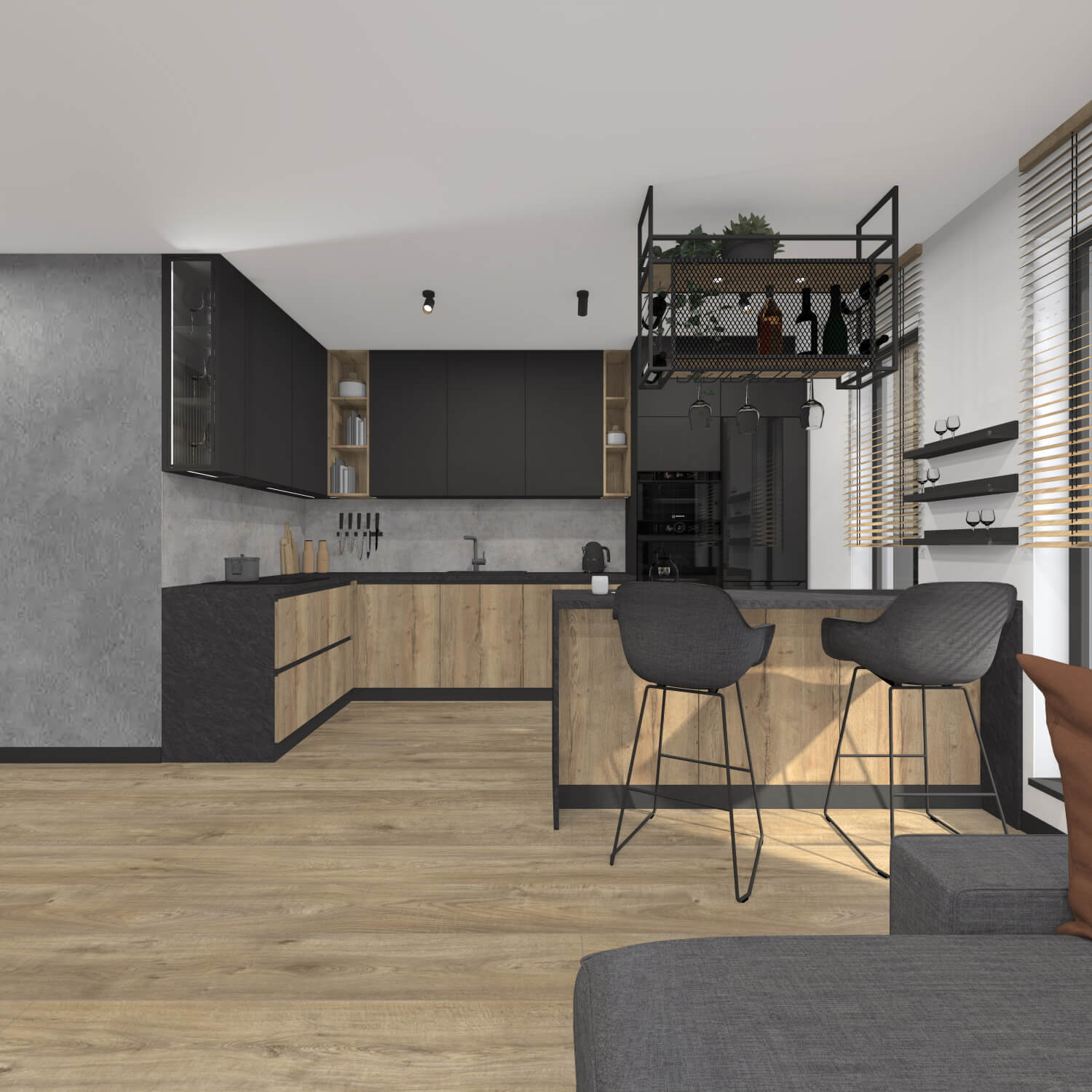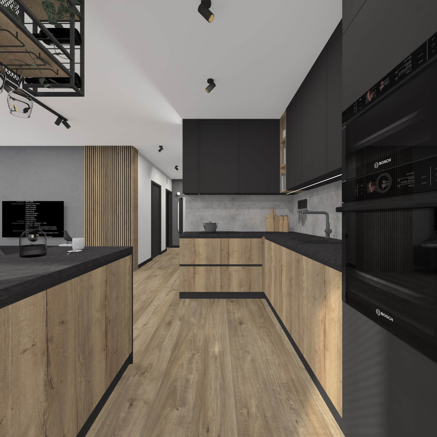 - Salon z kuchnią: Otwarta przestrzeń z industrialnymi elementami, takimi jak czarne, metalowe regały i oświetlenie szynowe. Ściany pokryto betonem dekoracyjnym i panelami lamelowymi. Kuchnia jest utrzymana w ciemnej kolorystyce, przełamanej drewnianymi szafkami.