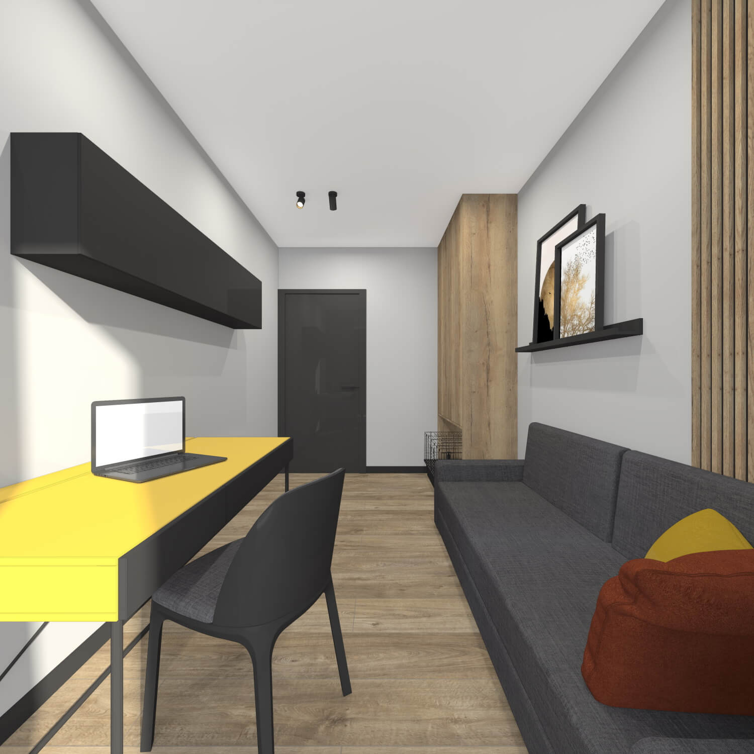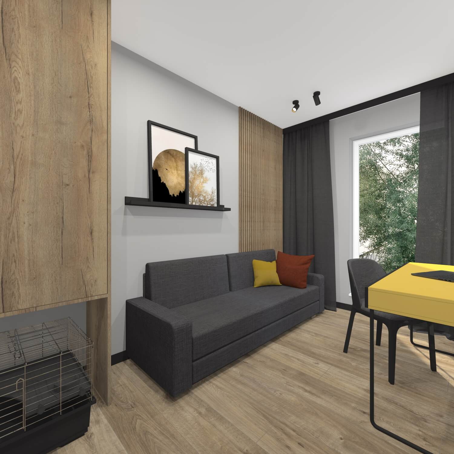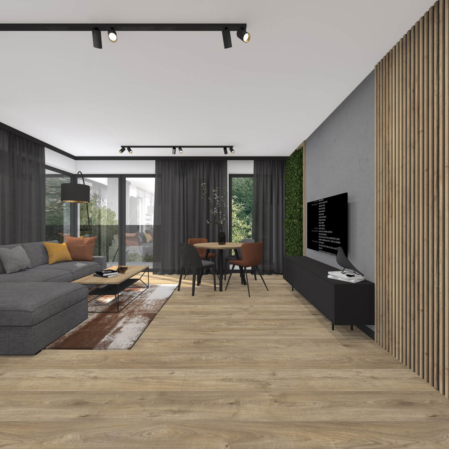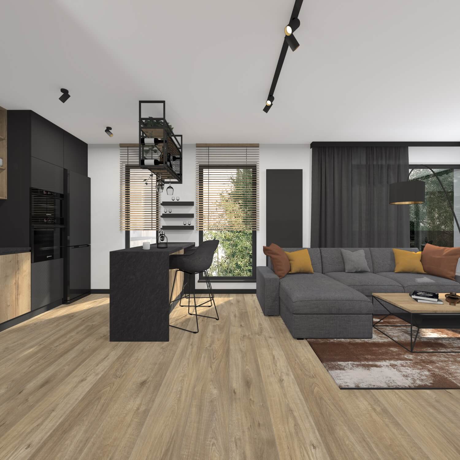 - Salon z kuchnią: Otwarta przestrzeń z industrialnymi elementami, takimi jak czarne, metalowe regały i oświetlenie szynowe. Ściany pokryto betonem dekoracyjnym i panelami lamelowymi. Kuchnia jest utrzymana w ciemnej kolorystyce, przełamanej drewnianymi szafkami.