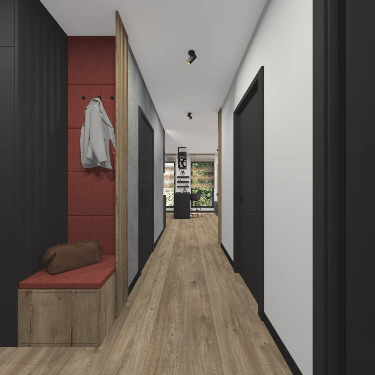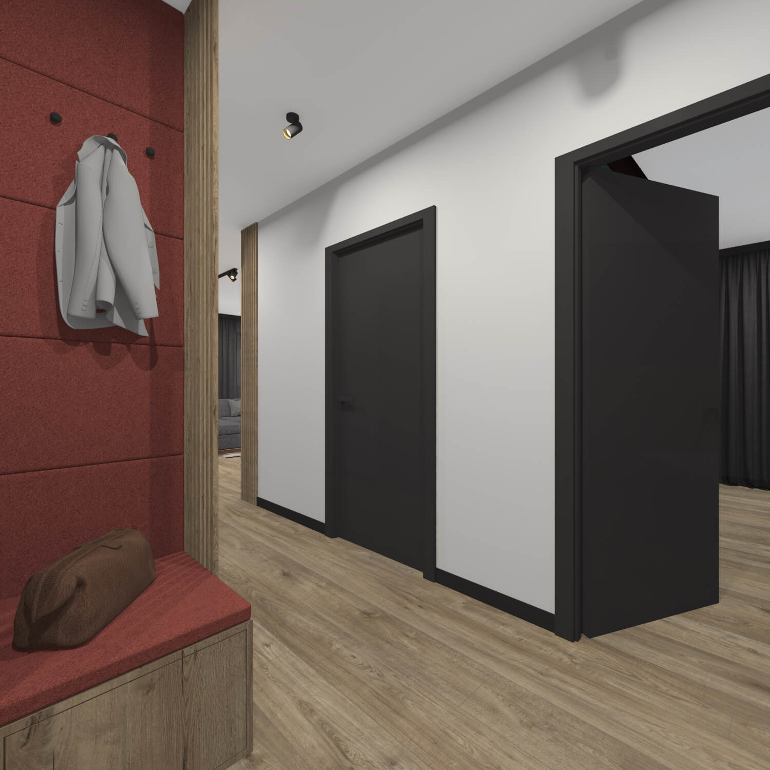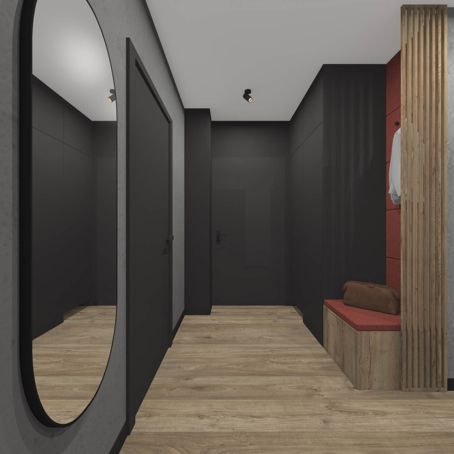 - Przedpokój: Utrzymany w ciemnej tonacji, z szafami do sufitu. Na ścianie i ławce pojawiają się akcenty w kolorze czerwonego wina, które ożywiają przestrzeń.