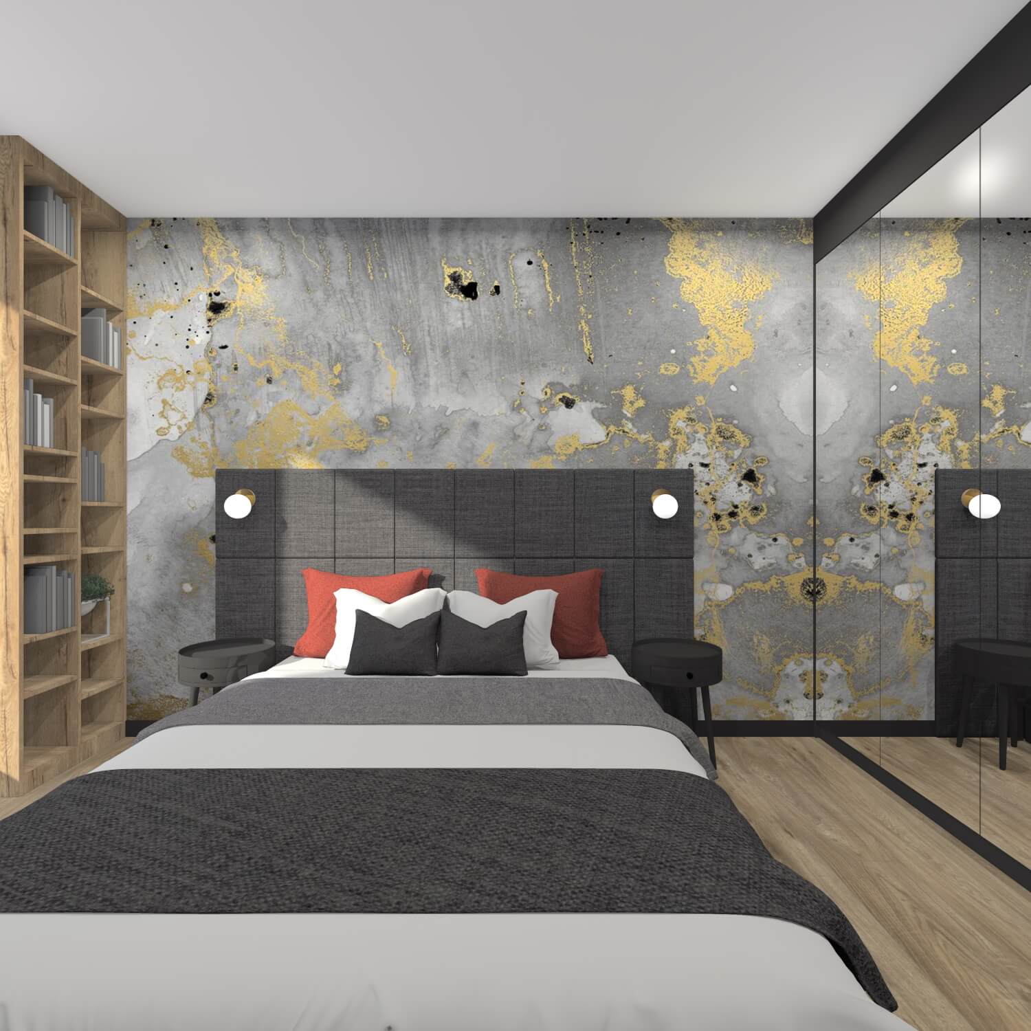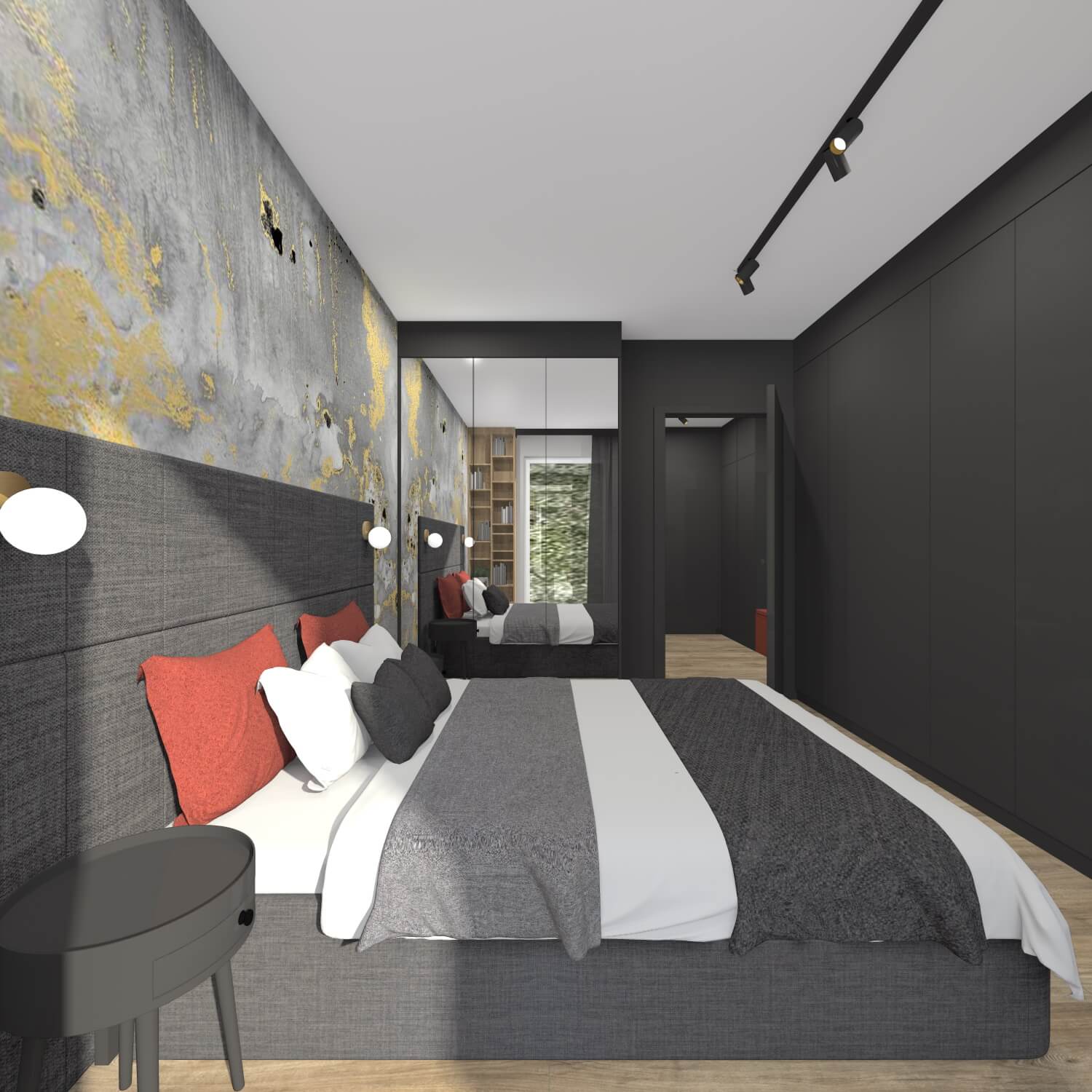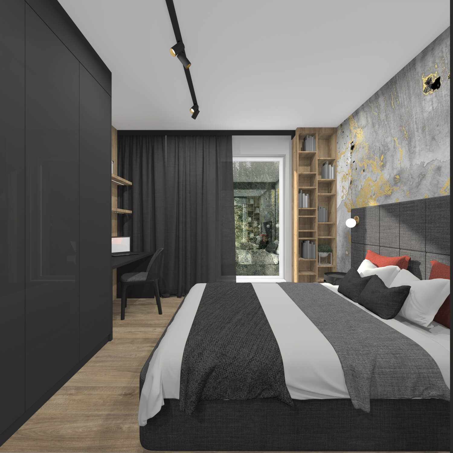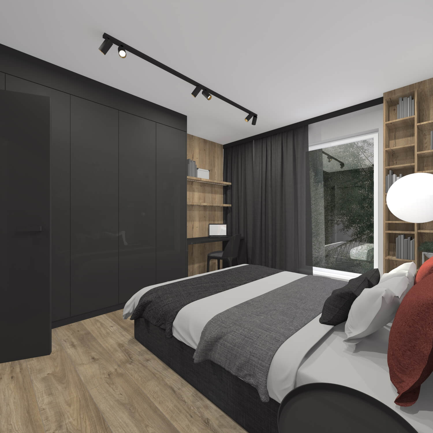 - Sypialnia: Funkcjonalna i minimalistyczna, z dużymi, ciemnymi szafami i dekoracyjnym panelem lamelowym na ścianie.