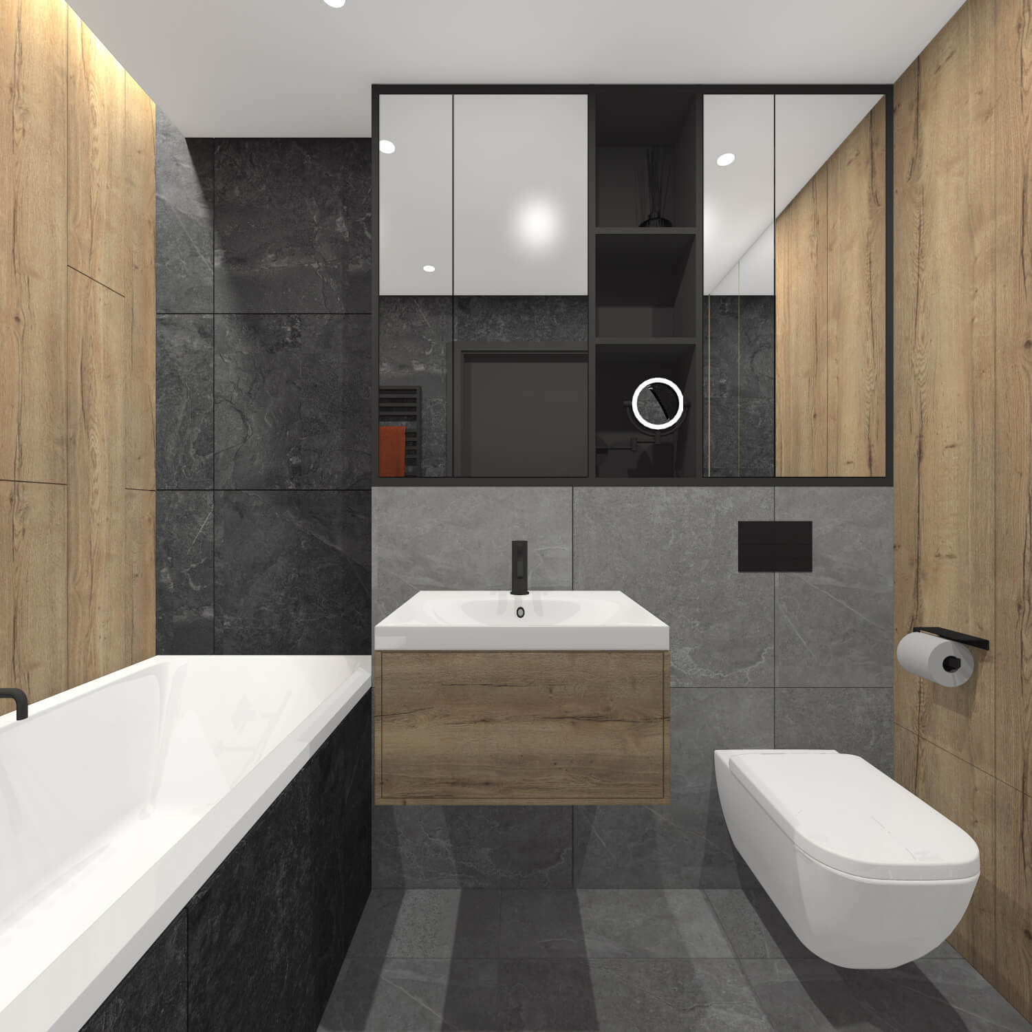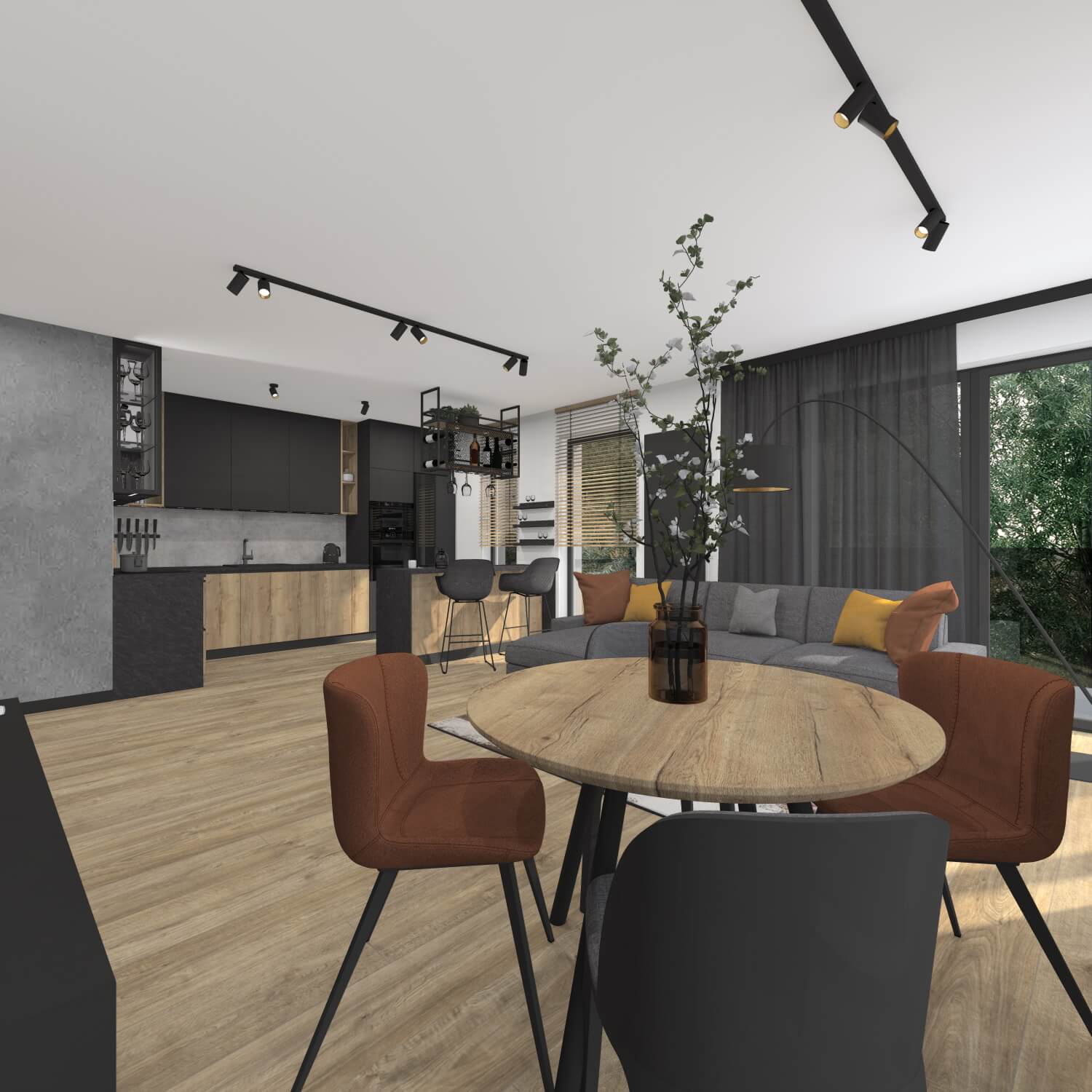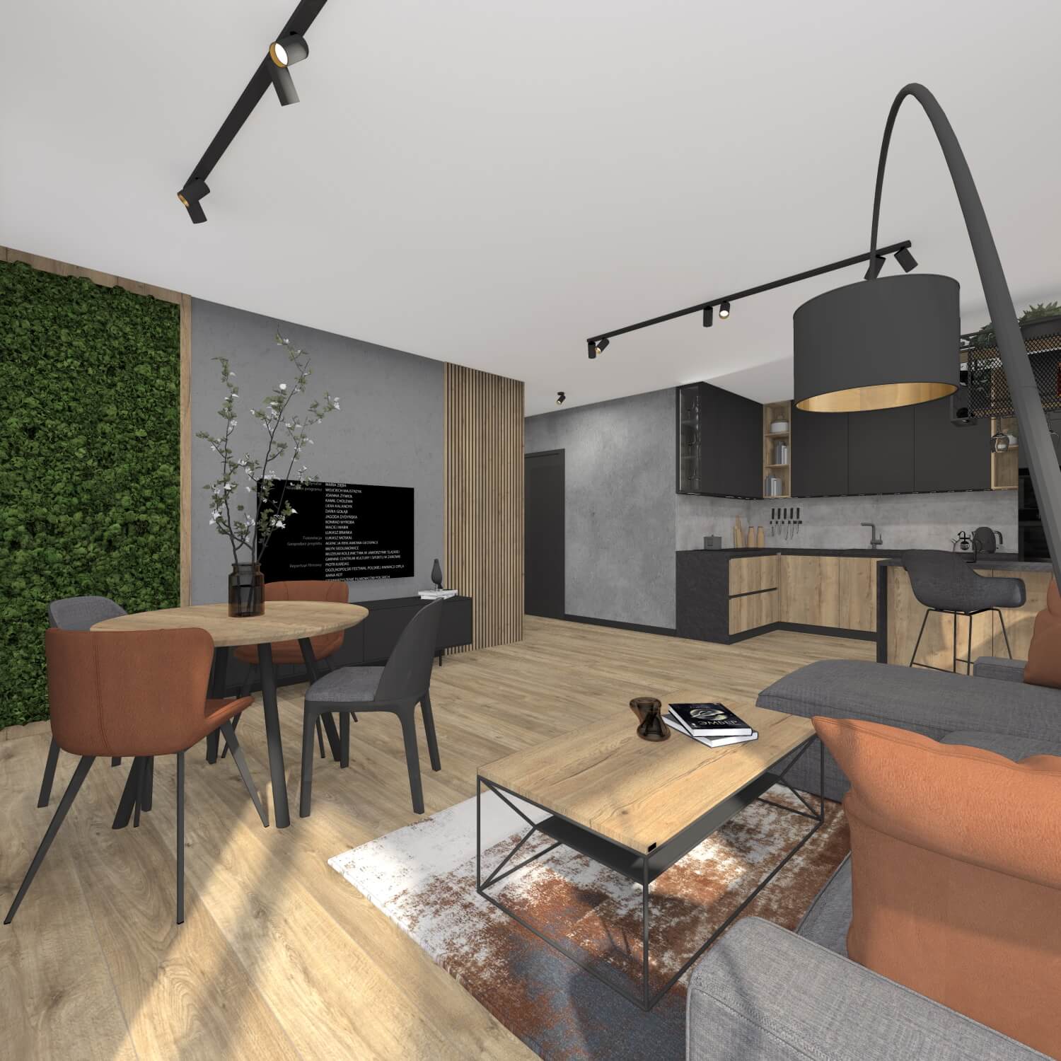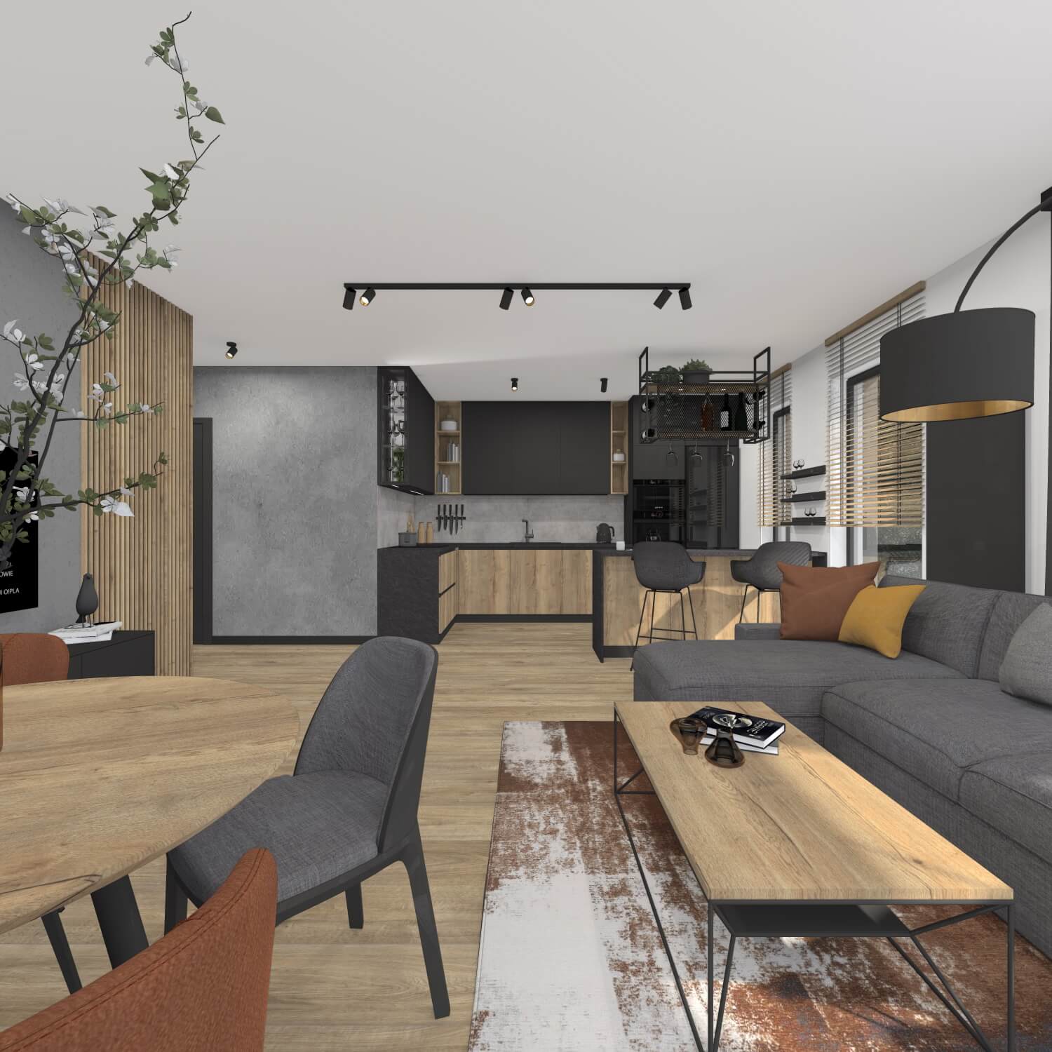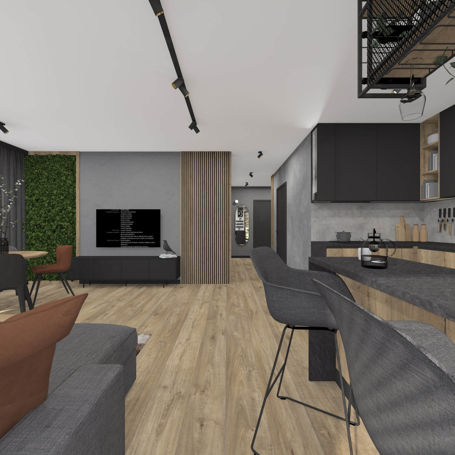 Projekt to kompleksowa aranżacja mieszkania, która łączy styl nowoczesny z surowymi, industrialnymi elementami. Wnętrza charakteryzują się kontrastem ciemnych kolorów (grafit, czerń) z naturalnym drewnem.